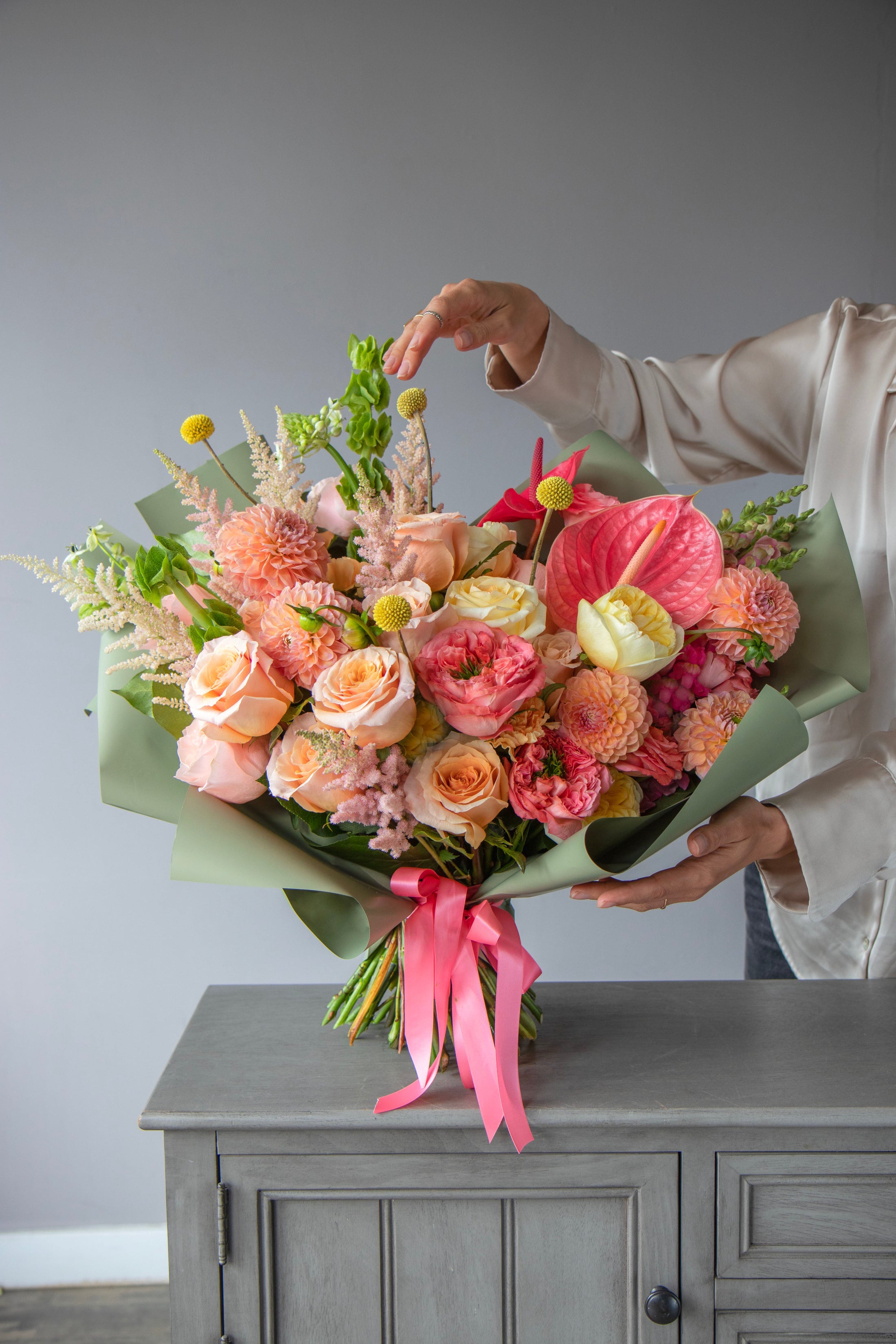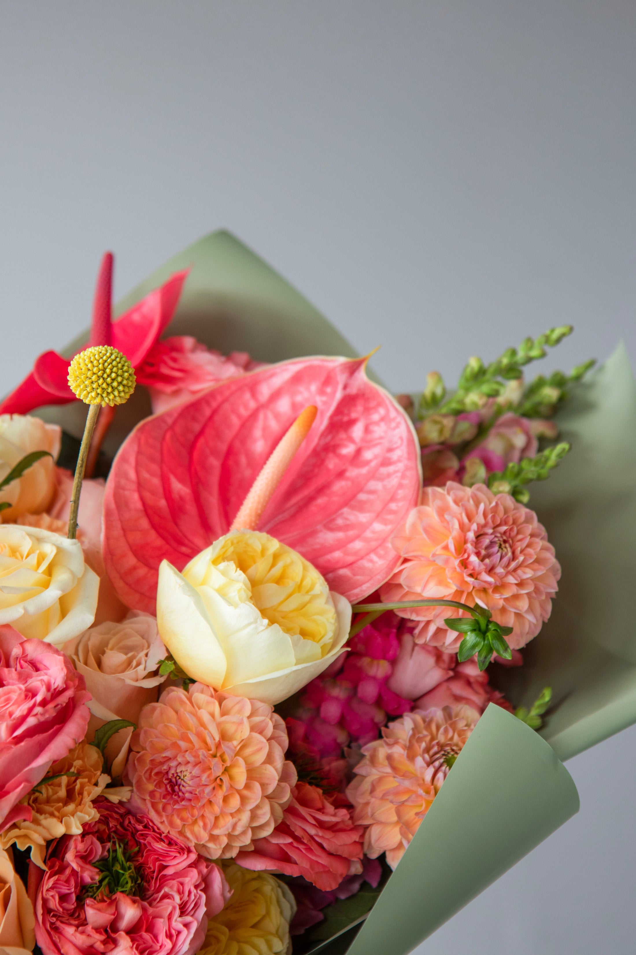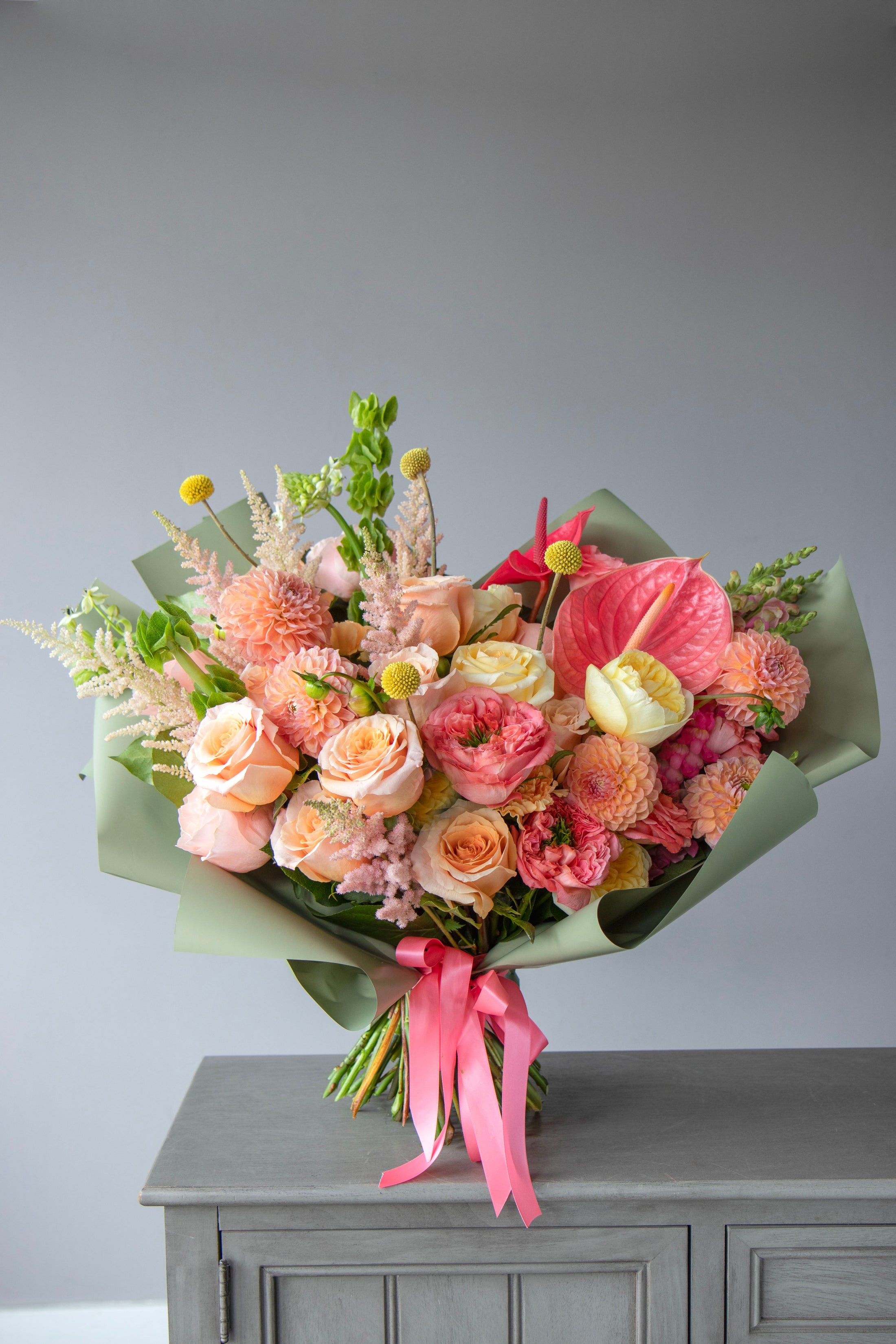 A graceful hand-tied bouquet in warm coral, peach, and blush tones — featuring roses, ranunculus, anthuriums, zinnias, and seasonal accents. Wrapped with satin ribbon, it feels joyful, airy, and refined — like a soft kiss in flower form.