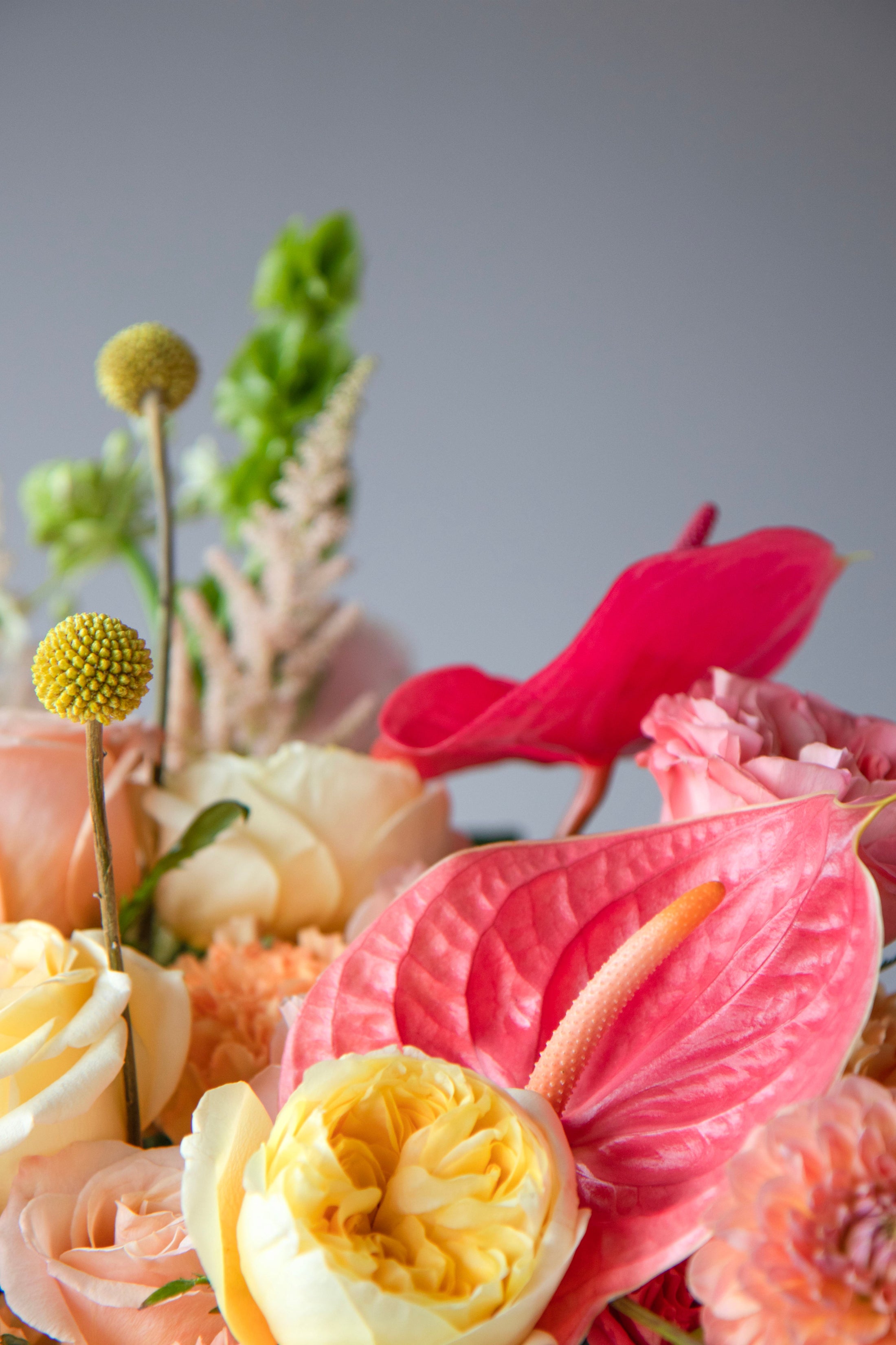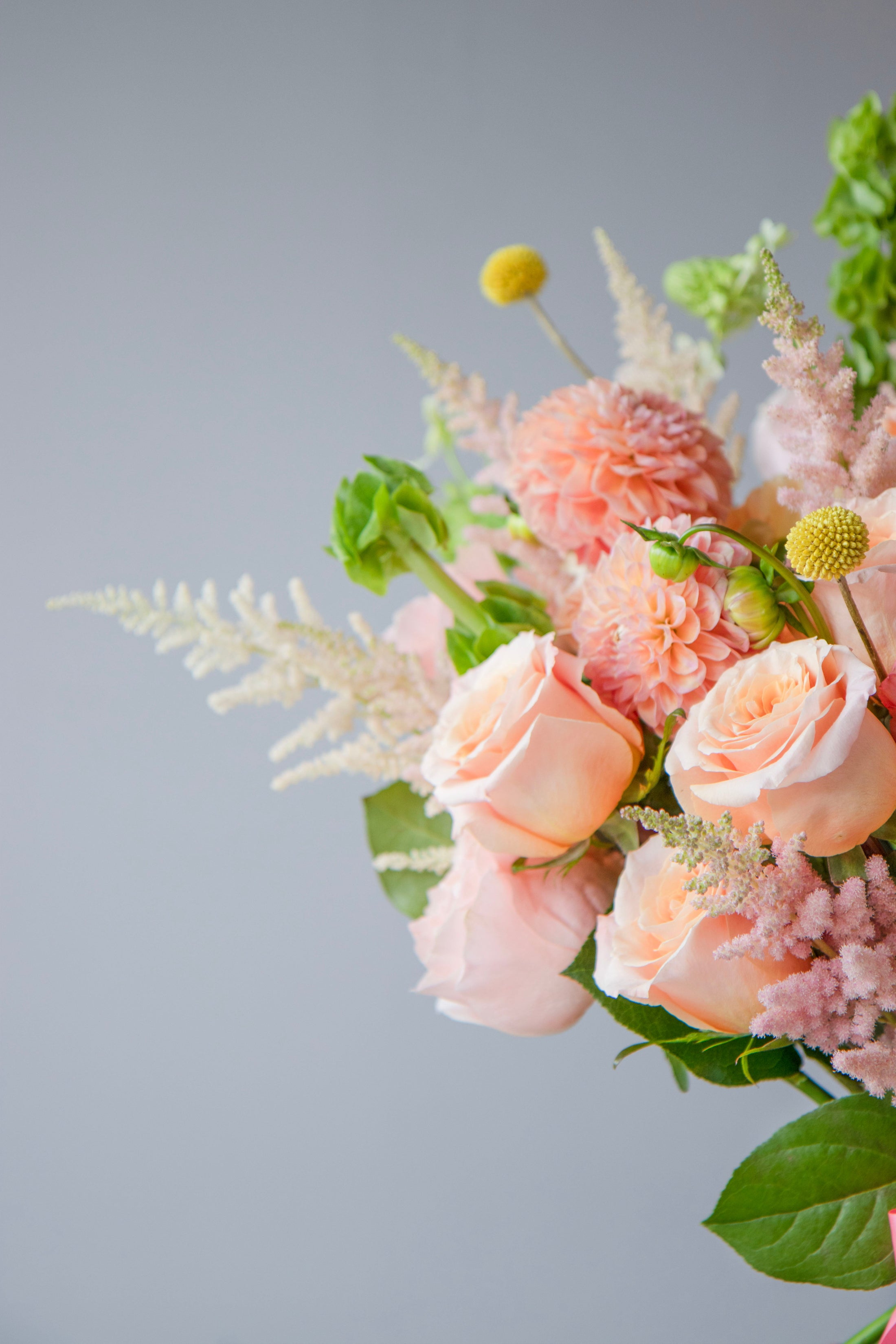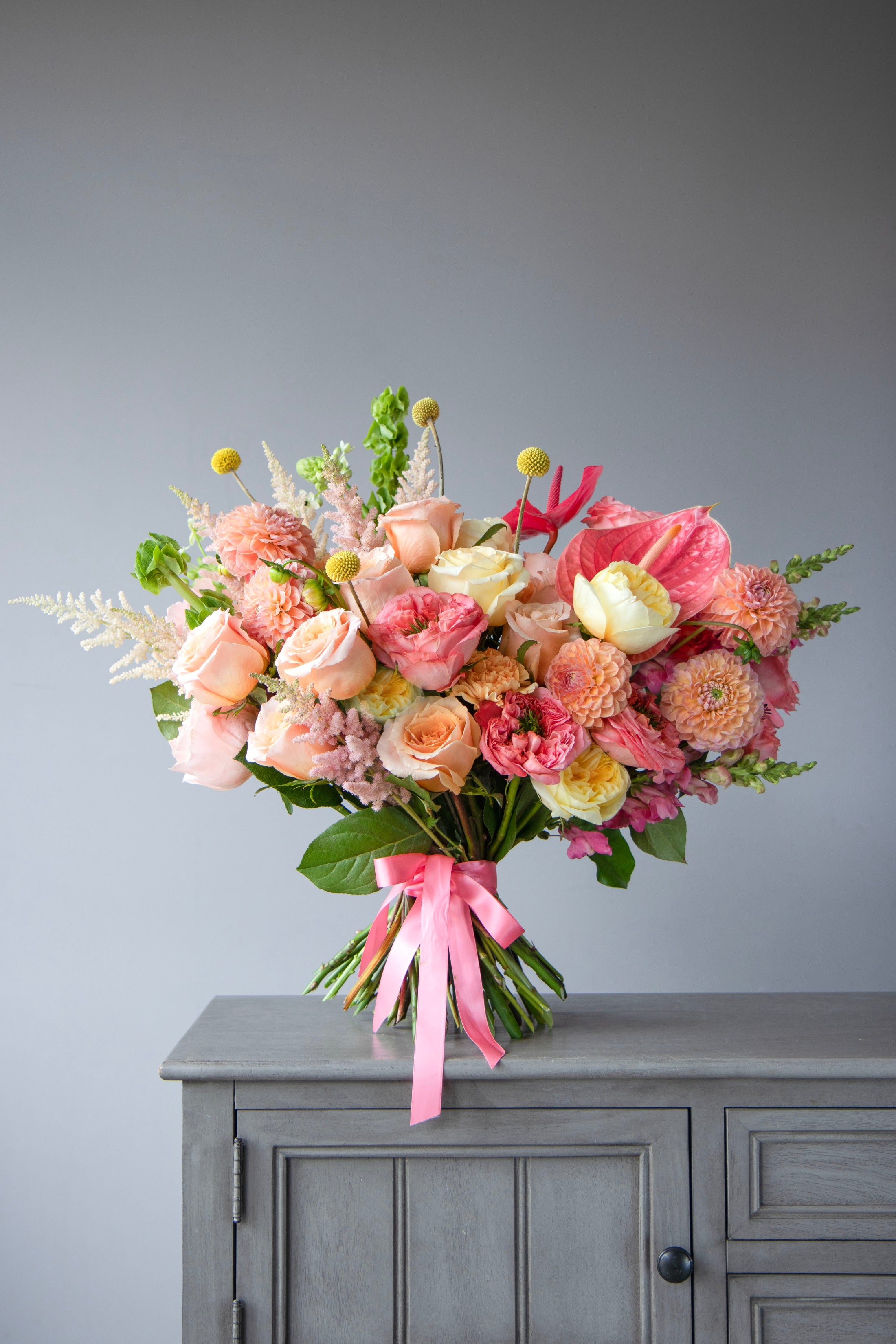 A graceful hand-tied bouquet in warm coral, peach, and blush tones — featuring roses, ranunculus, anthuriums, zinnias, and seasonal accents. Wrapped with satin ribbon, it feels joyful, airy, and refined — like a soft kiss in flower form.