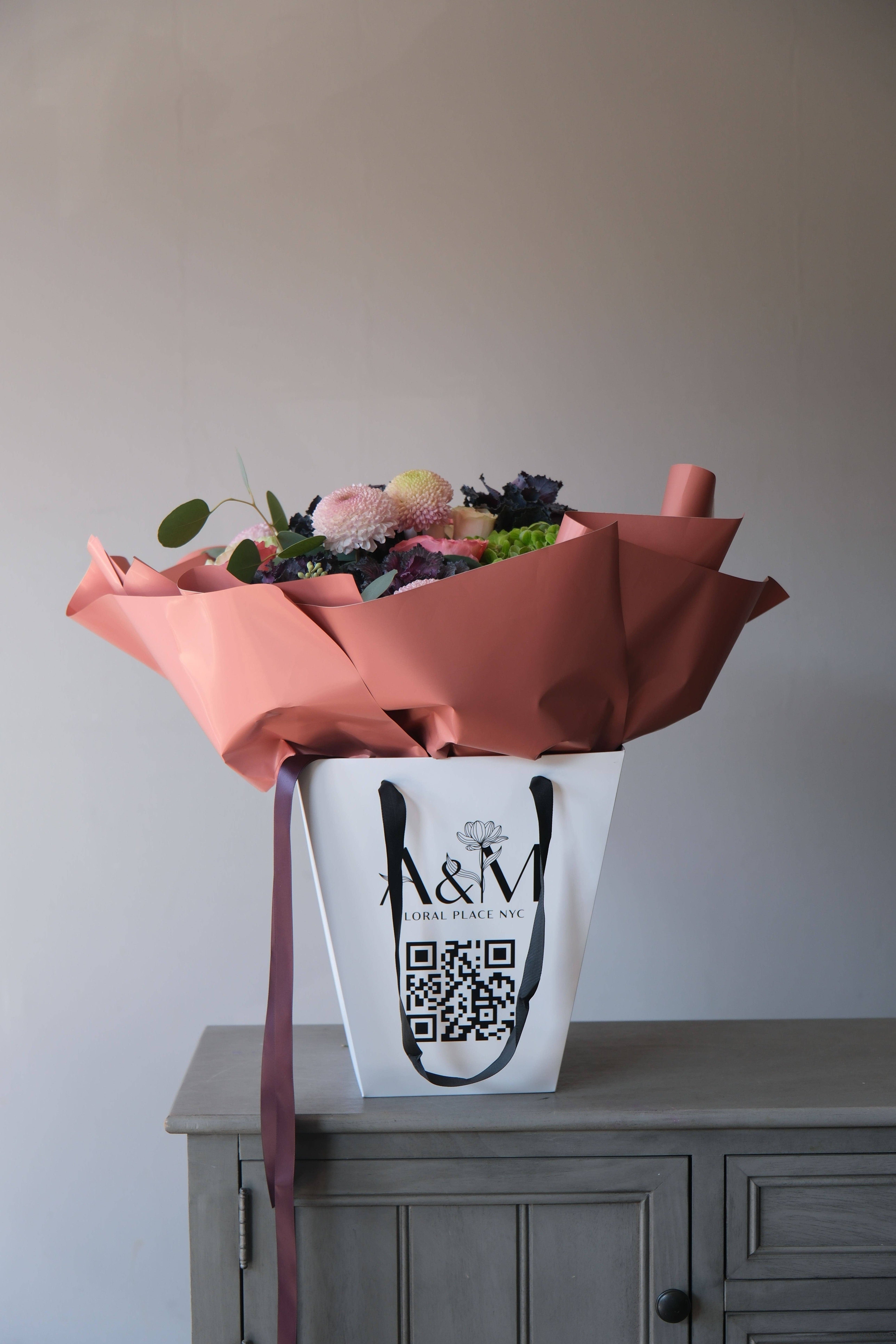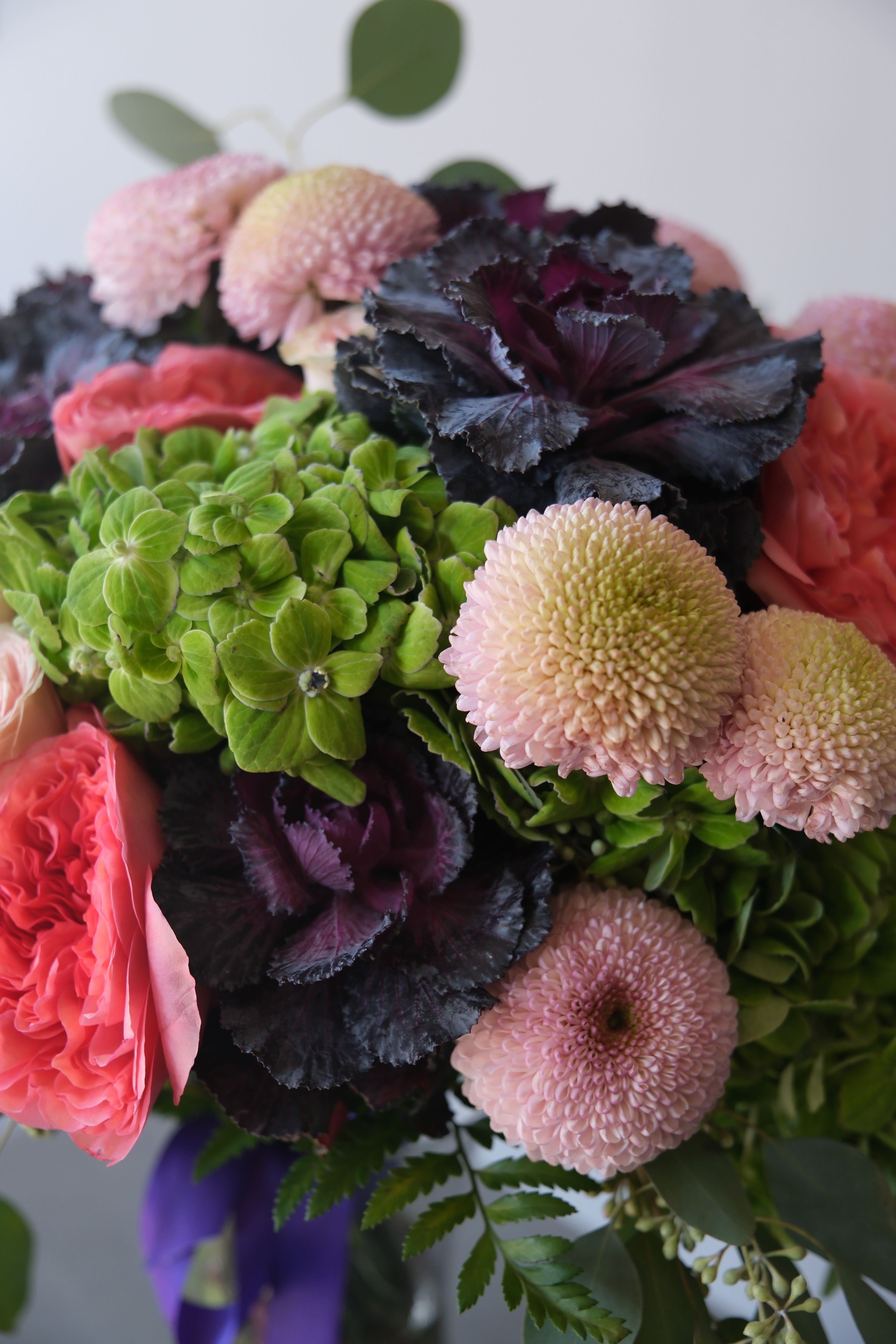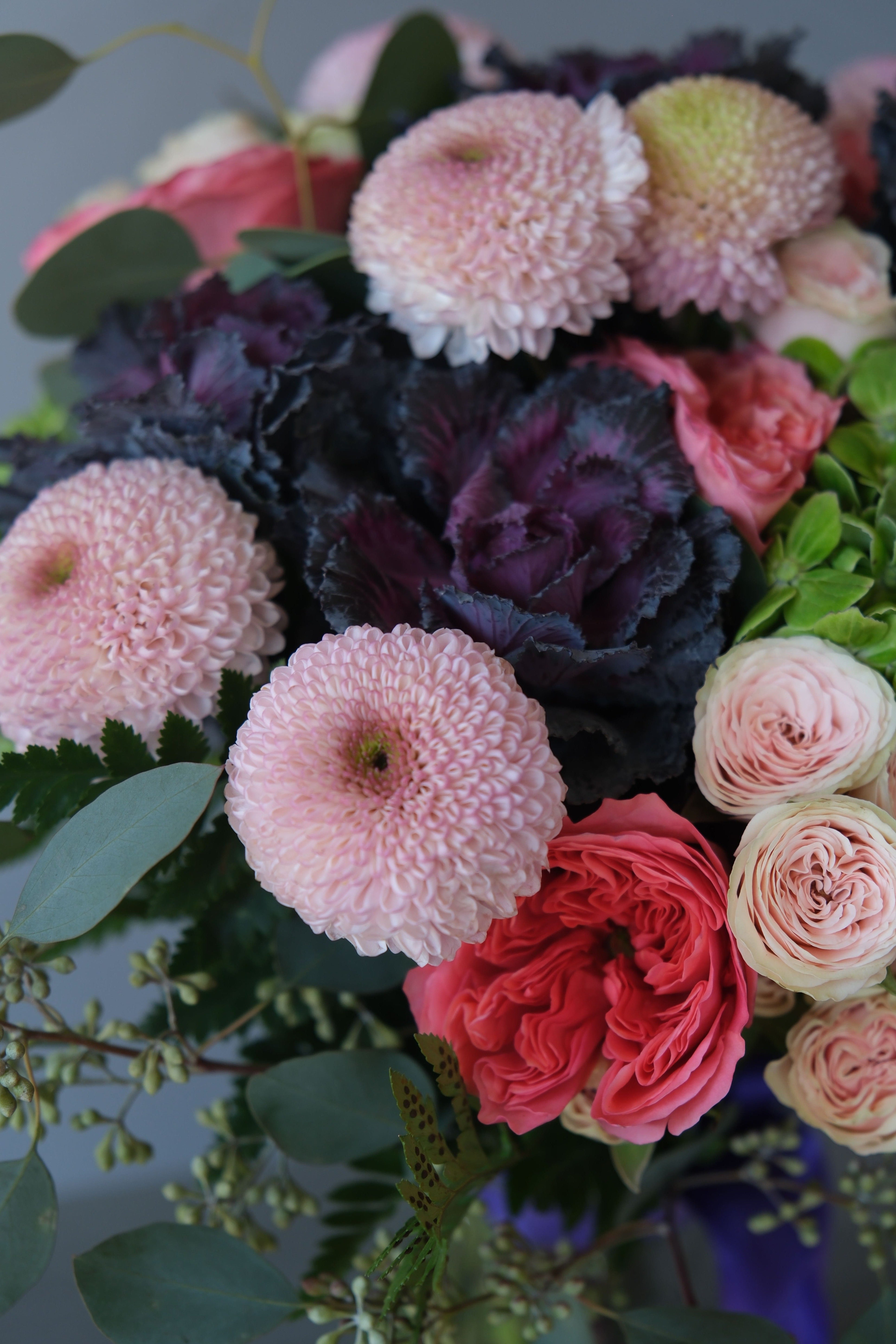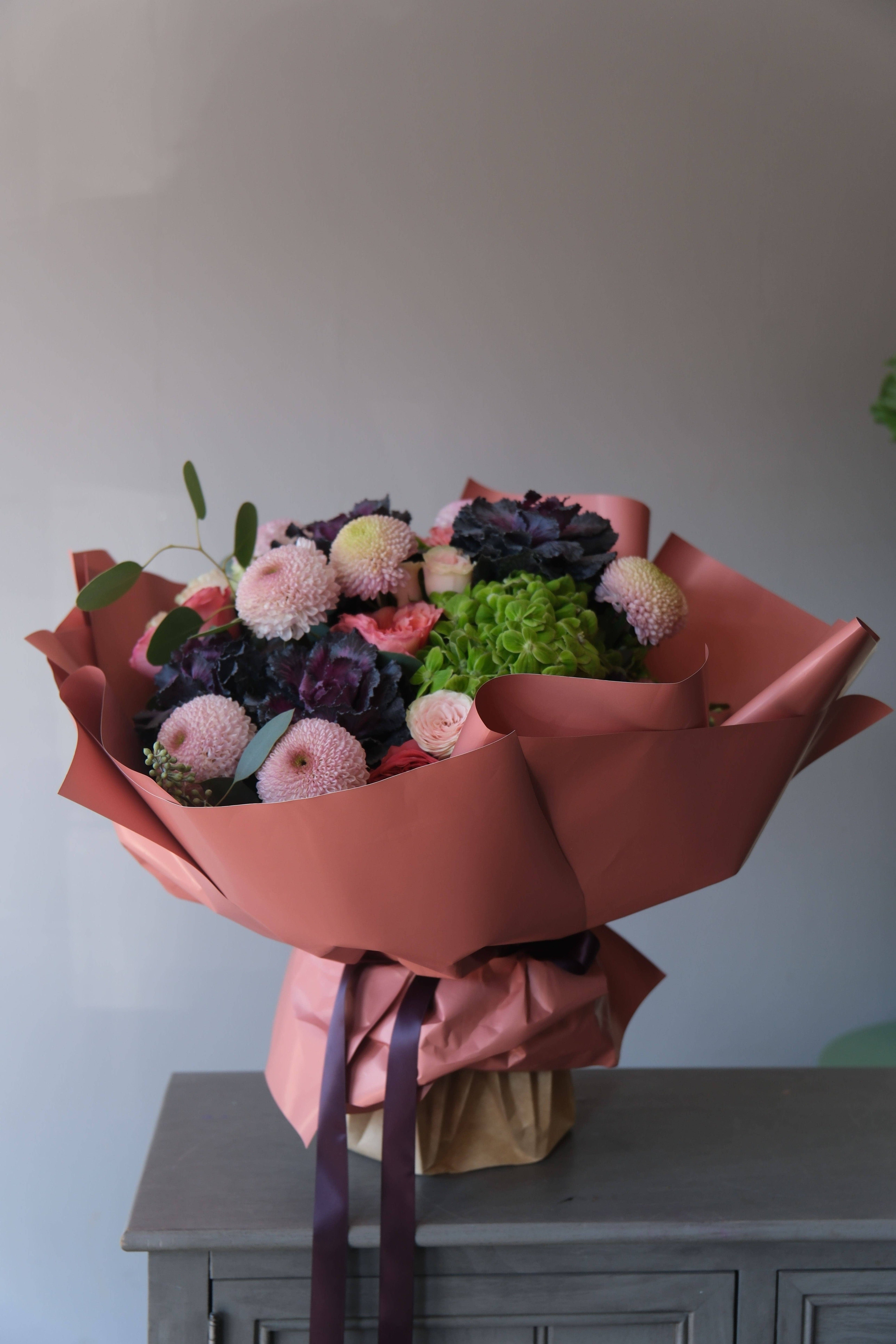 A rich and sophisticated arrangement built around deep-toned brassica, accented with soft emerald hydrangea, delicate pink expression roses, lush spray roses, and single-head chrysanthemums. Eucalyptus branches add freshness and movement, completing the composition.