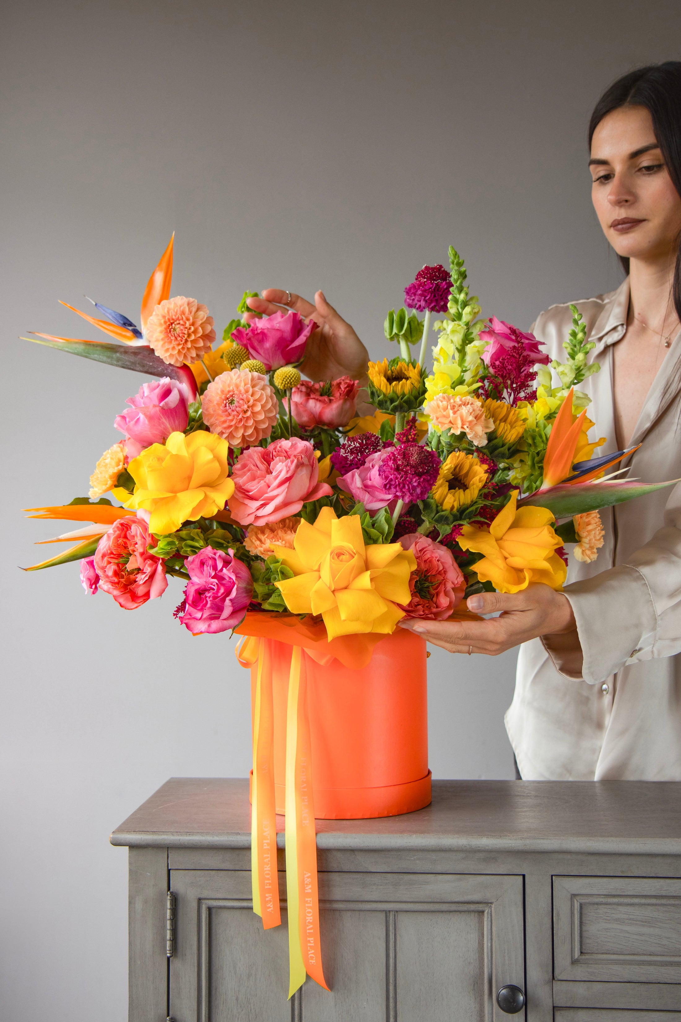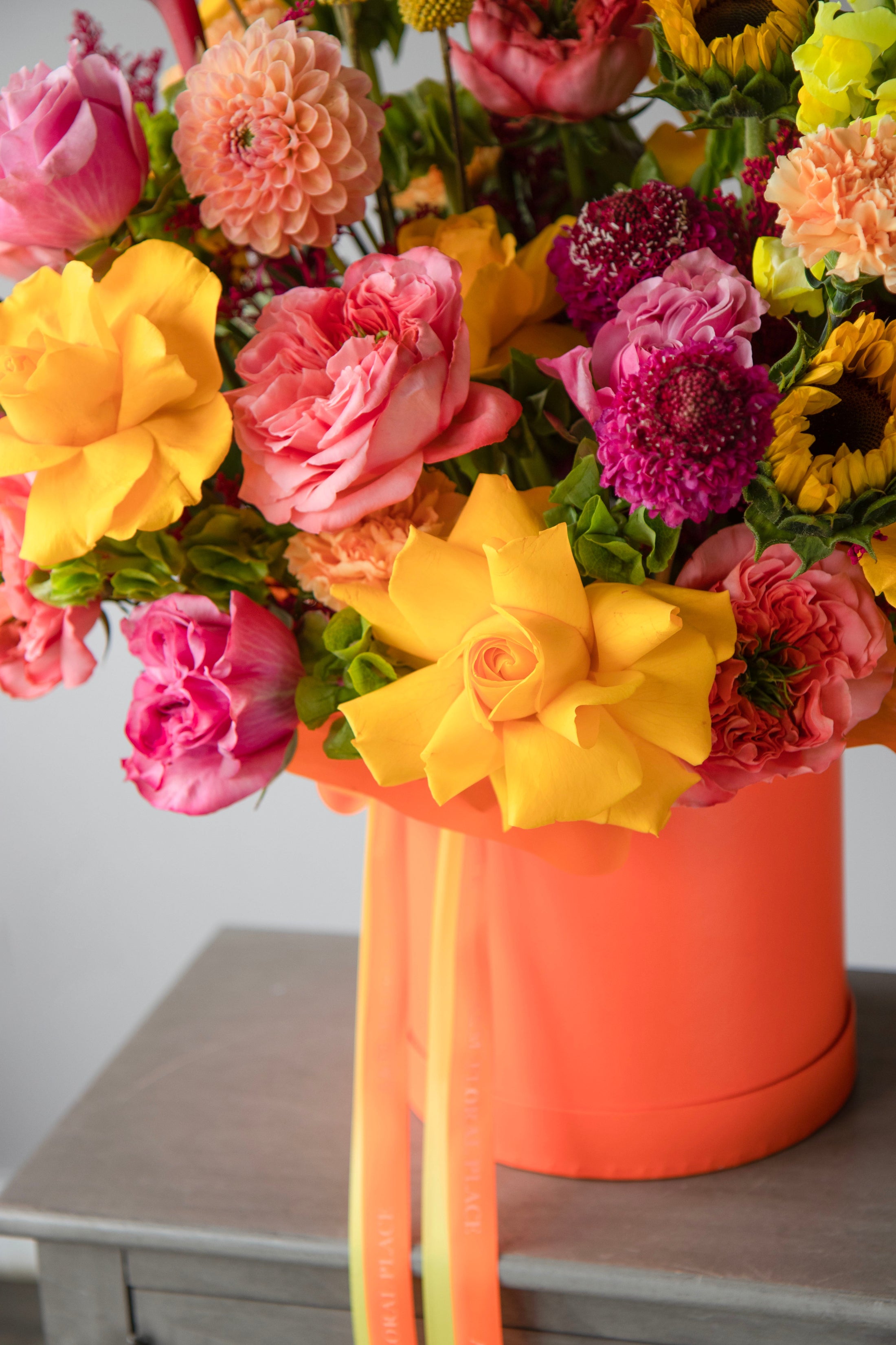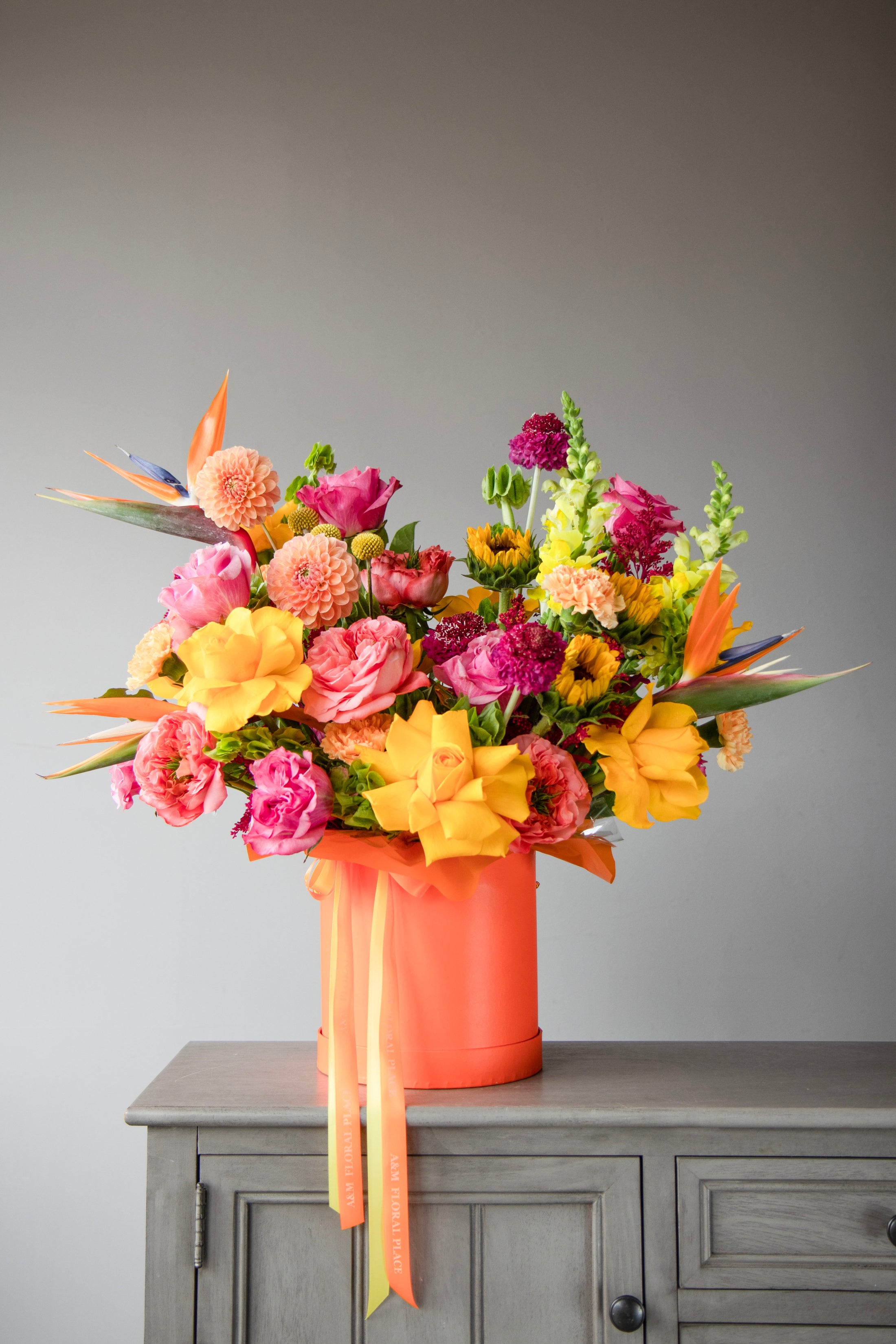 A joyful explosion of color and texture — this vibrant arrangement features bold sunflowers, Birds of Paradise, roses, dahlias, and seasonal blooms in rich shades of orange, fuchsia, yellow, and coral. Presented in a statement orange box with flowing ribbons, it radiates pure celebration.