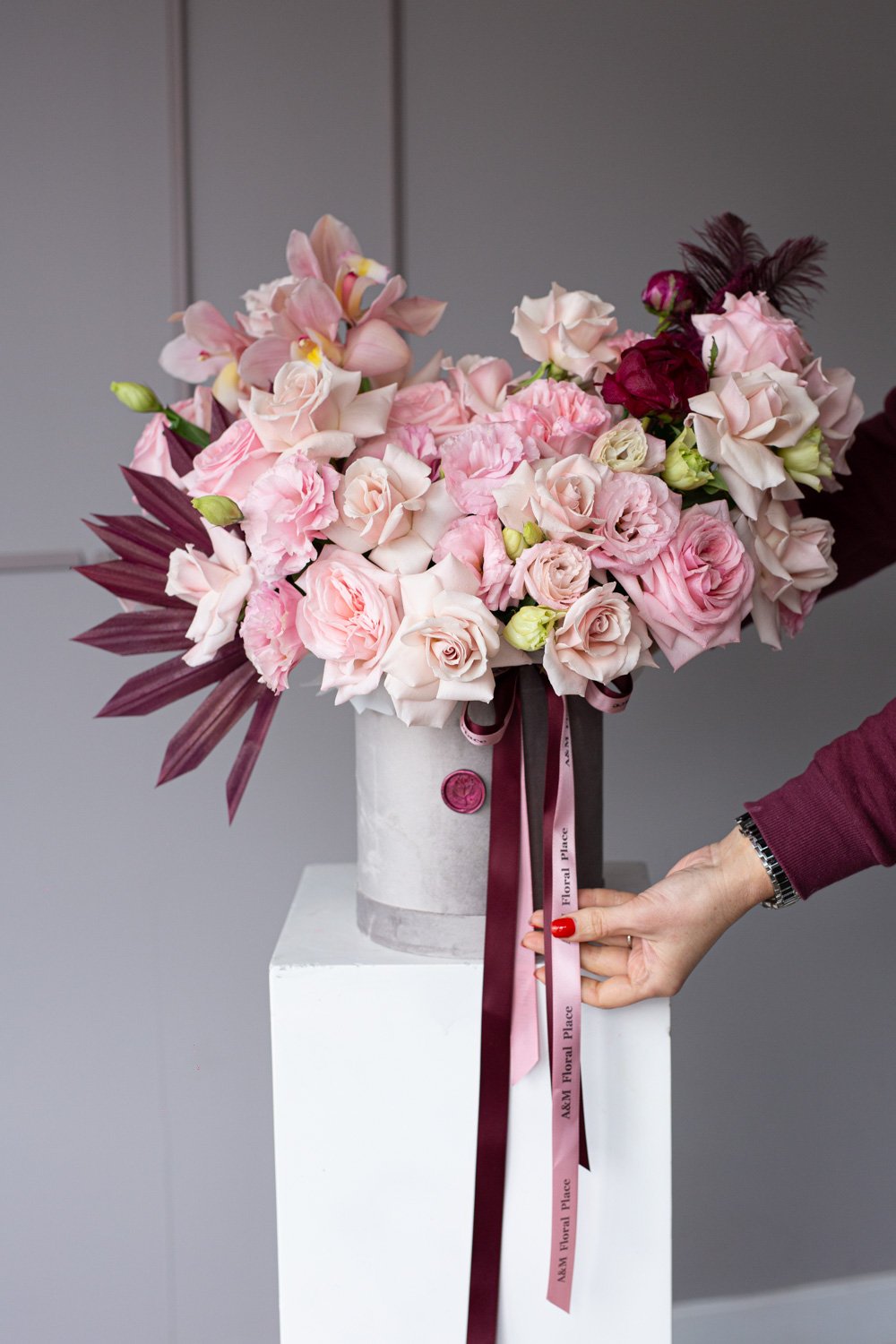 Mix of roses, cymbidium, lisianthus and other seasonal flowers in a velvet box.