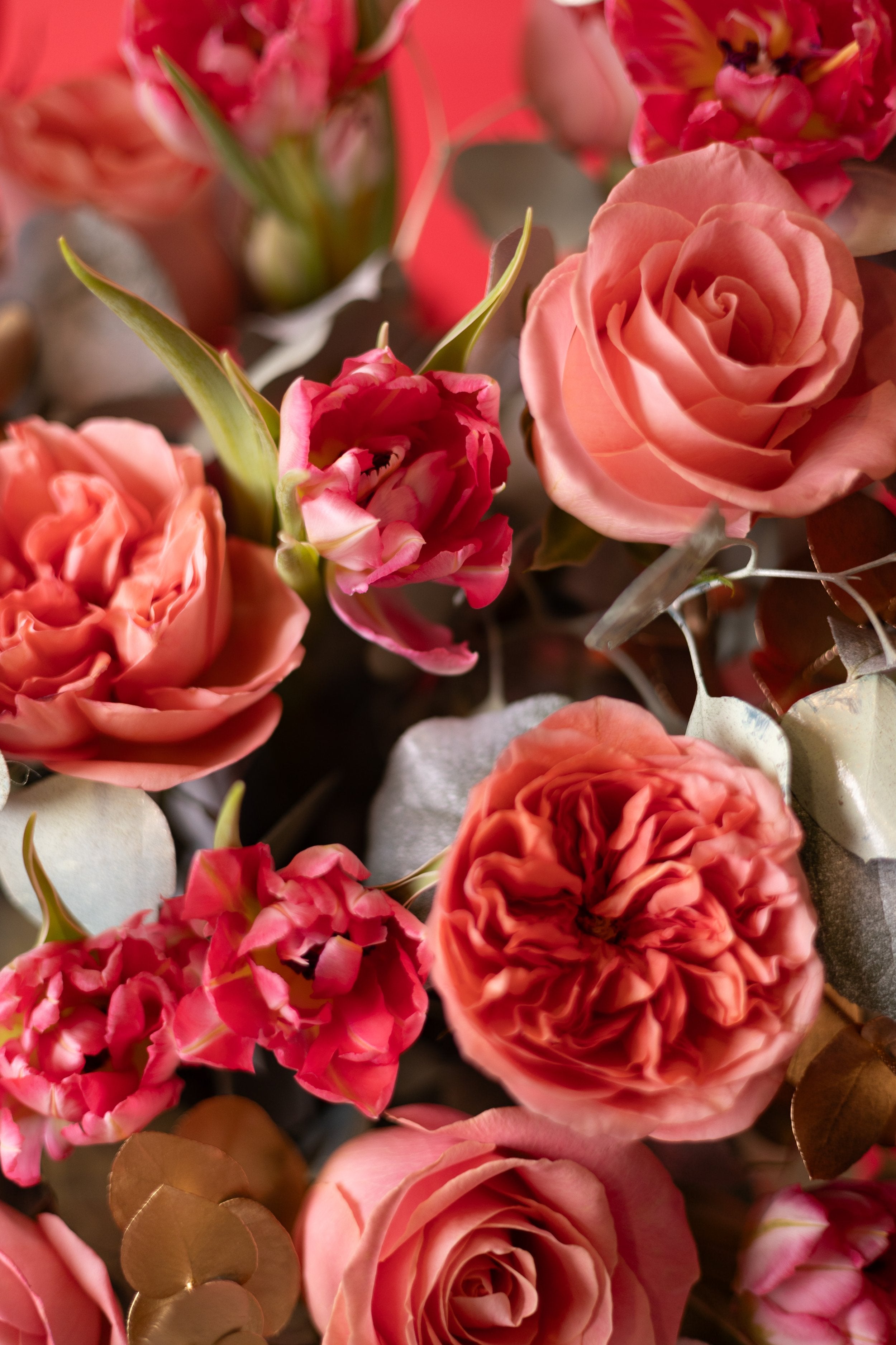 Mix of roses, tulips, amaranthus, hydrangea and other seasonal flowers.