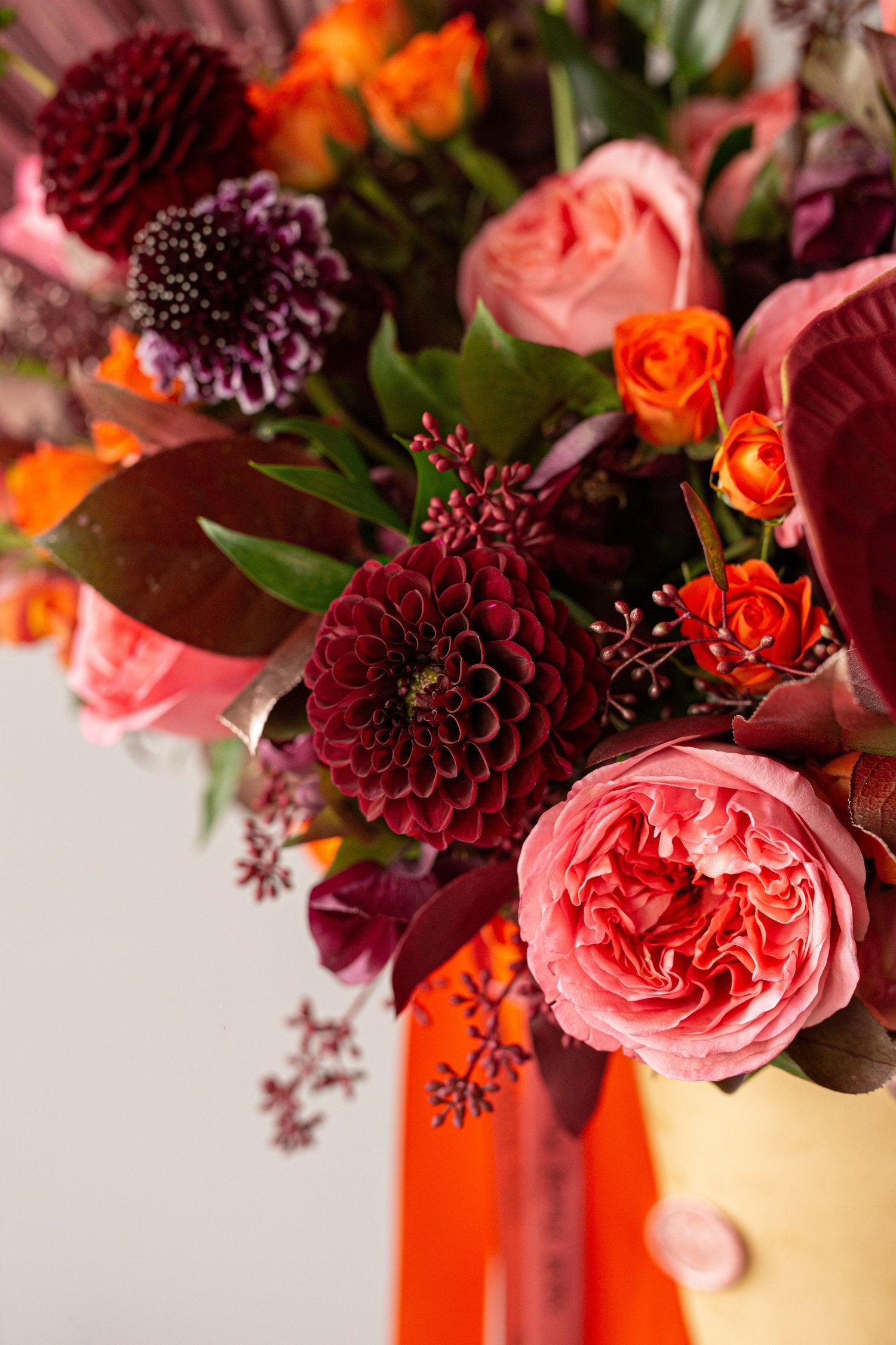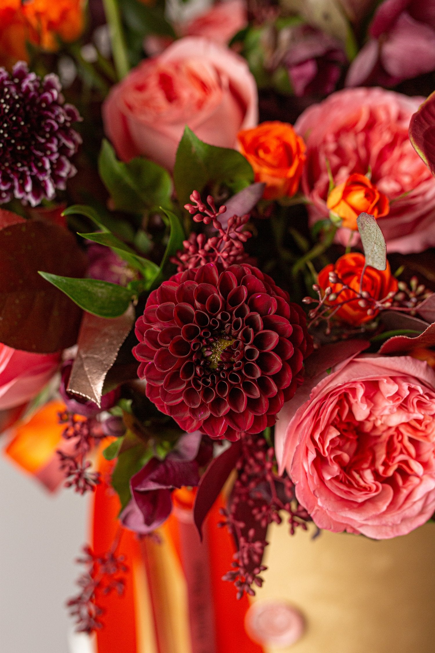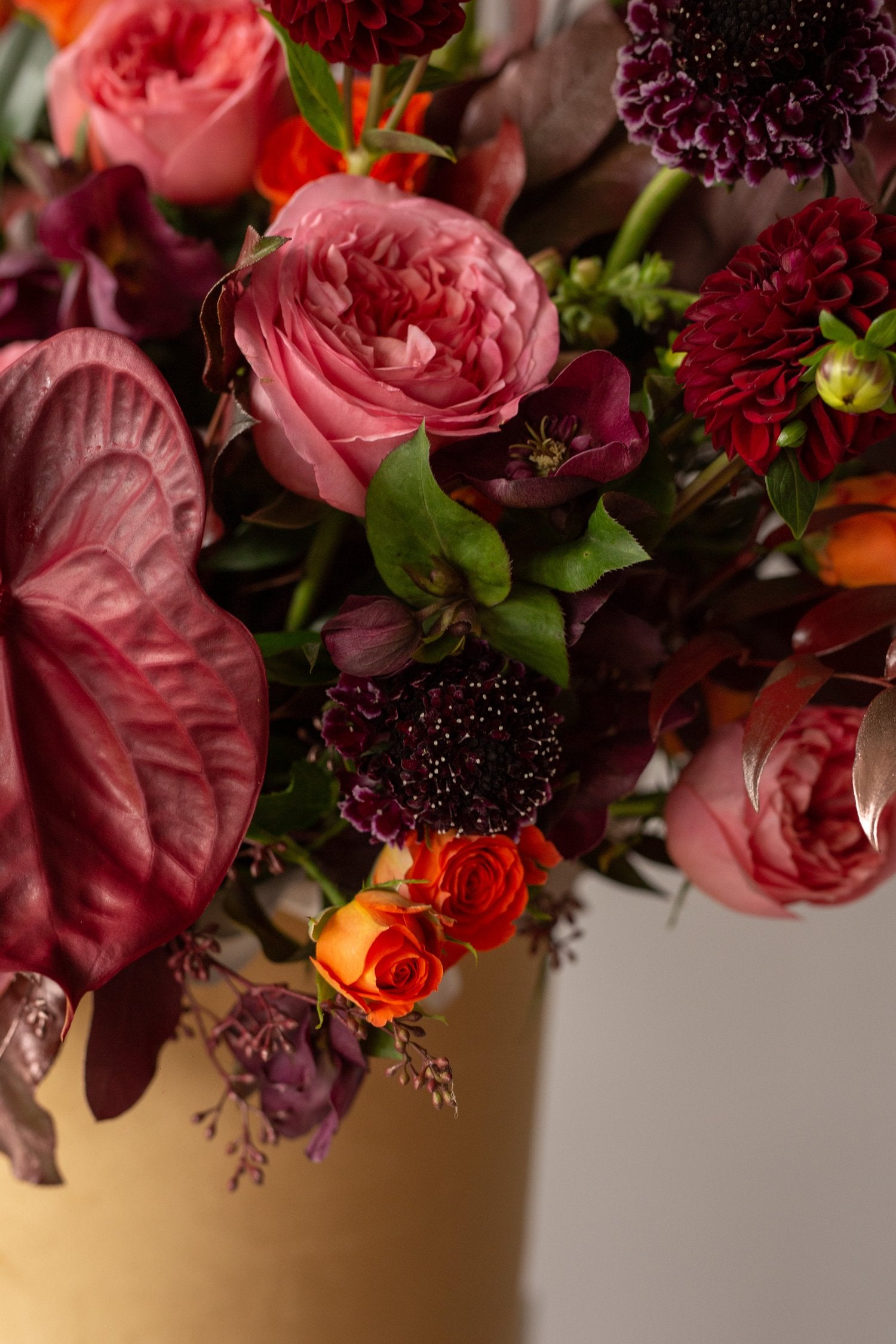 Mix of roses, dahlias, scabiosa, anthurium and other seasonal flowers in rich autumn colors.