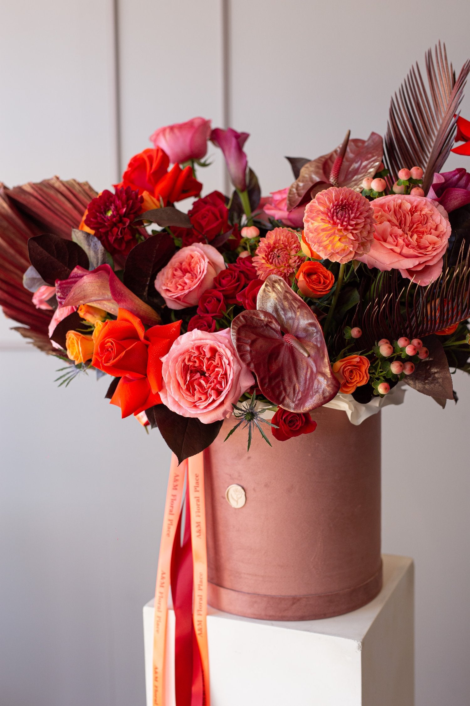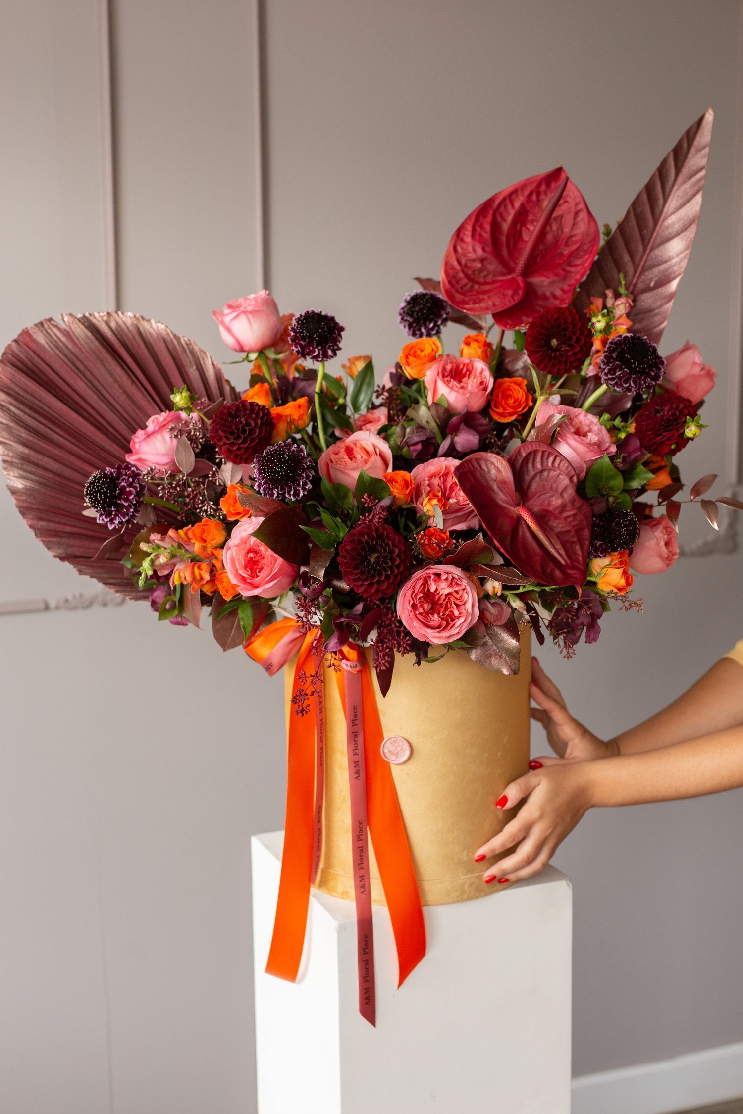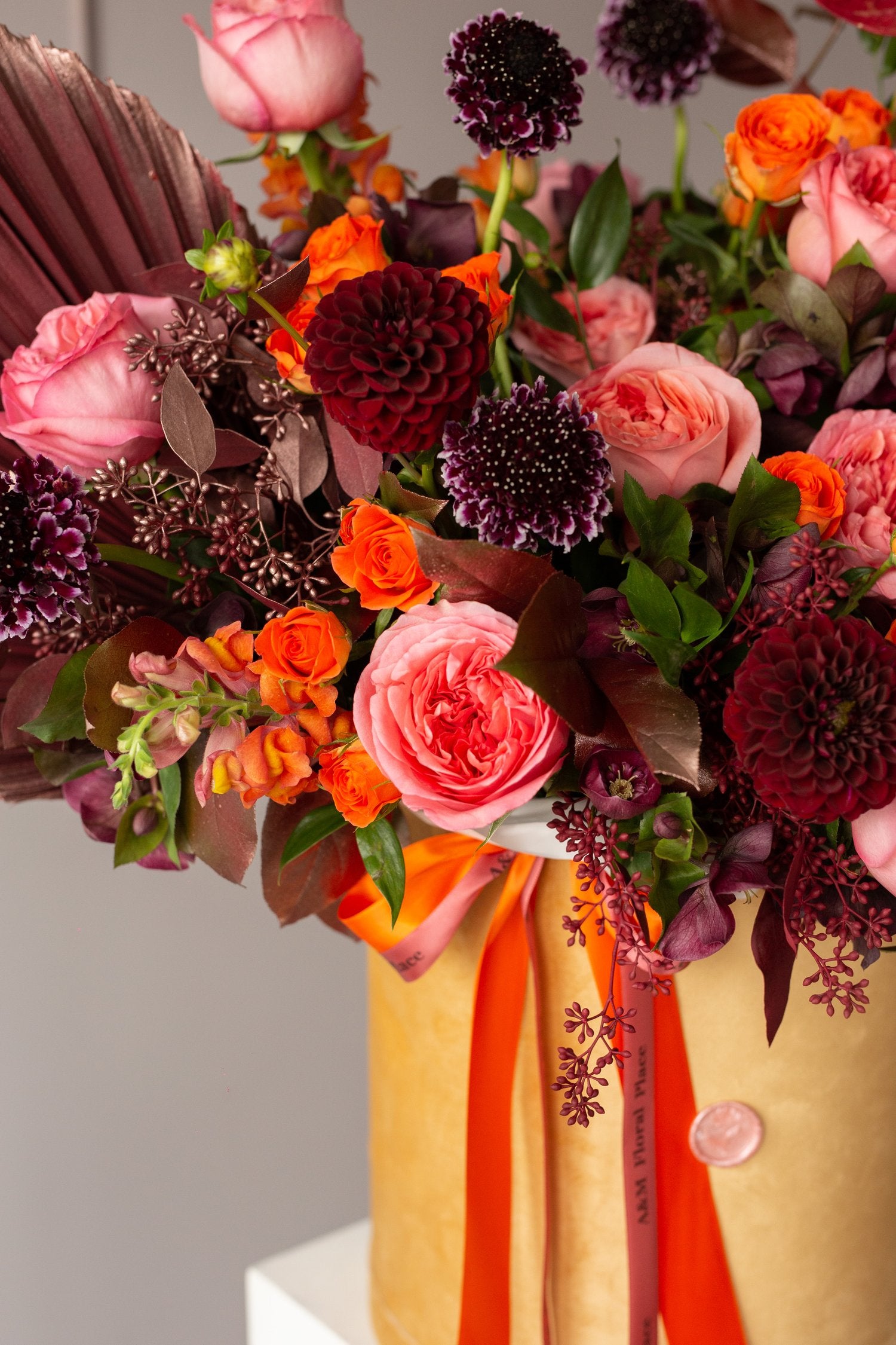 Mix of roses, dahlias, scabiosa, anthurium and other seasonal flowers in rich autumn colors.
