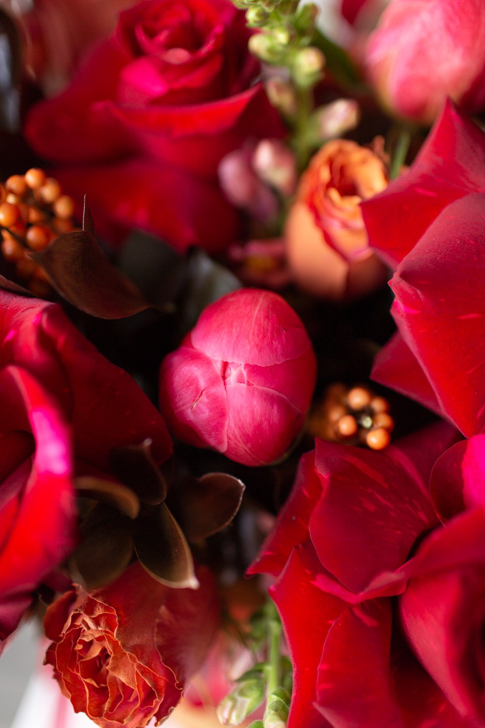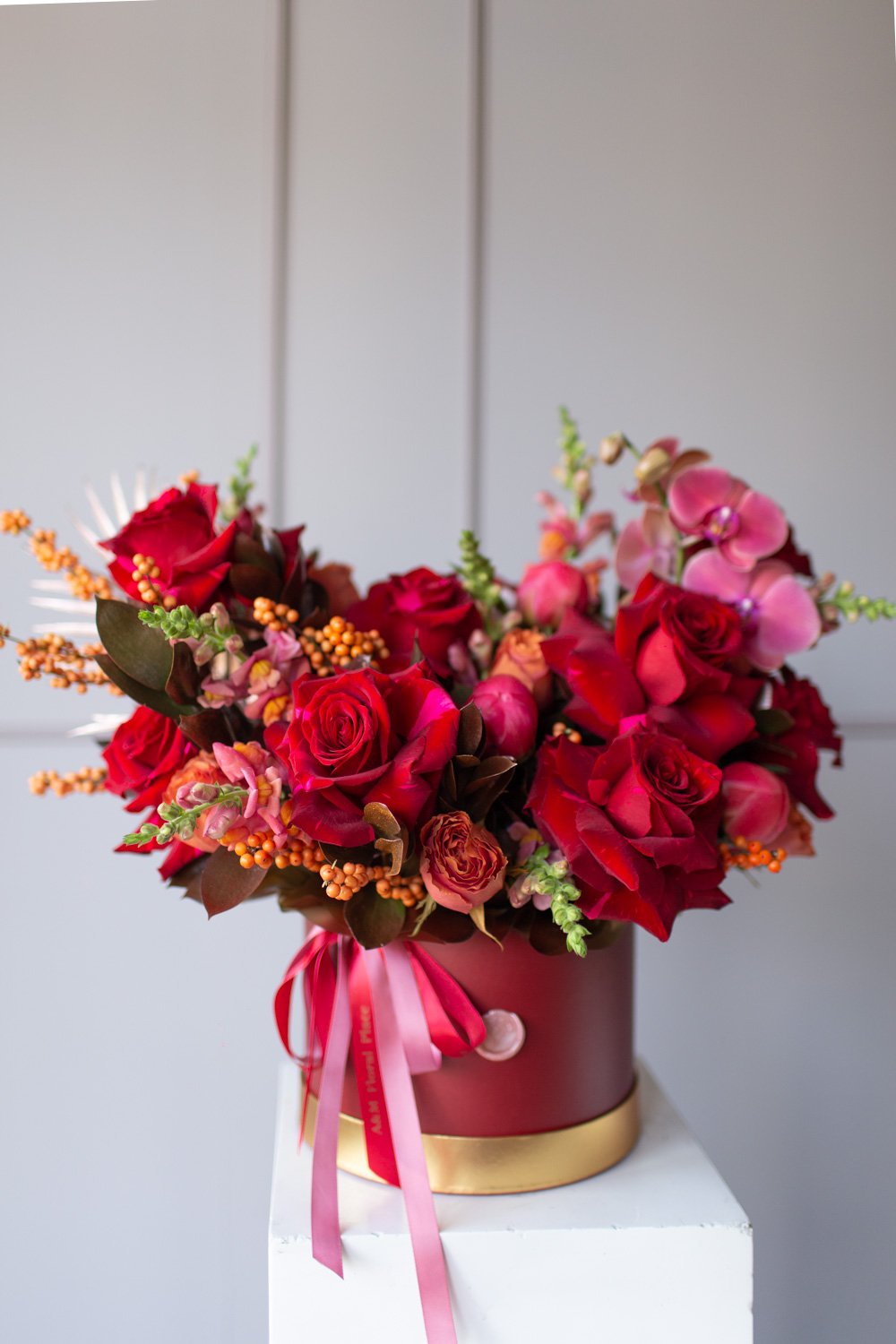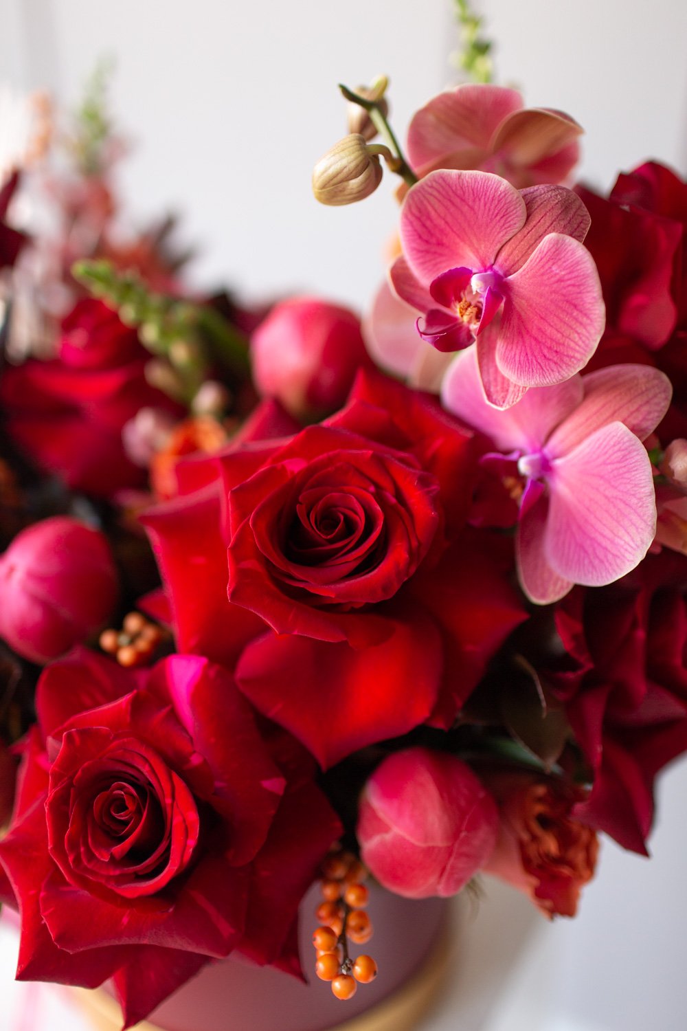 Mix of roses, orchid, and other seasonal flowers in rich red colors.