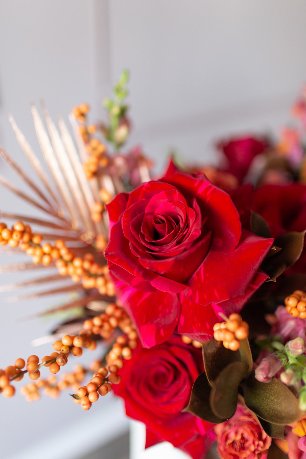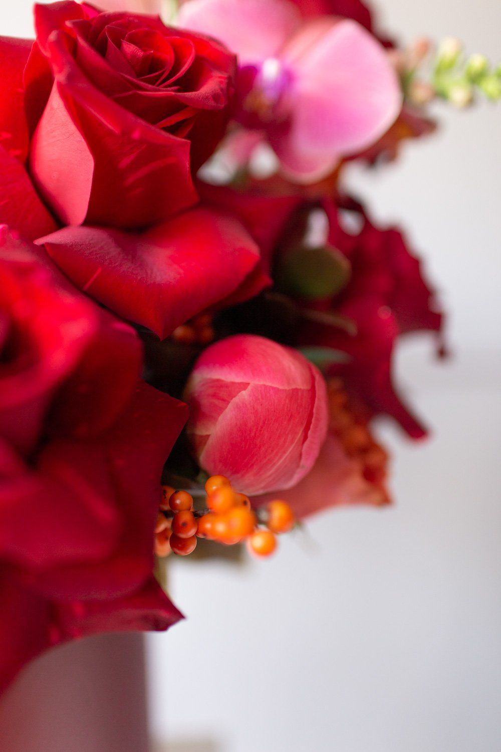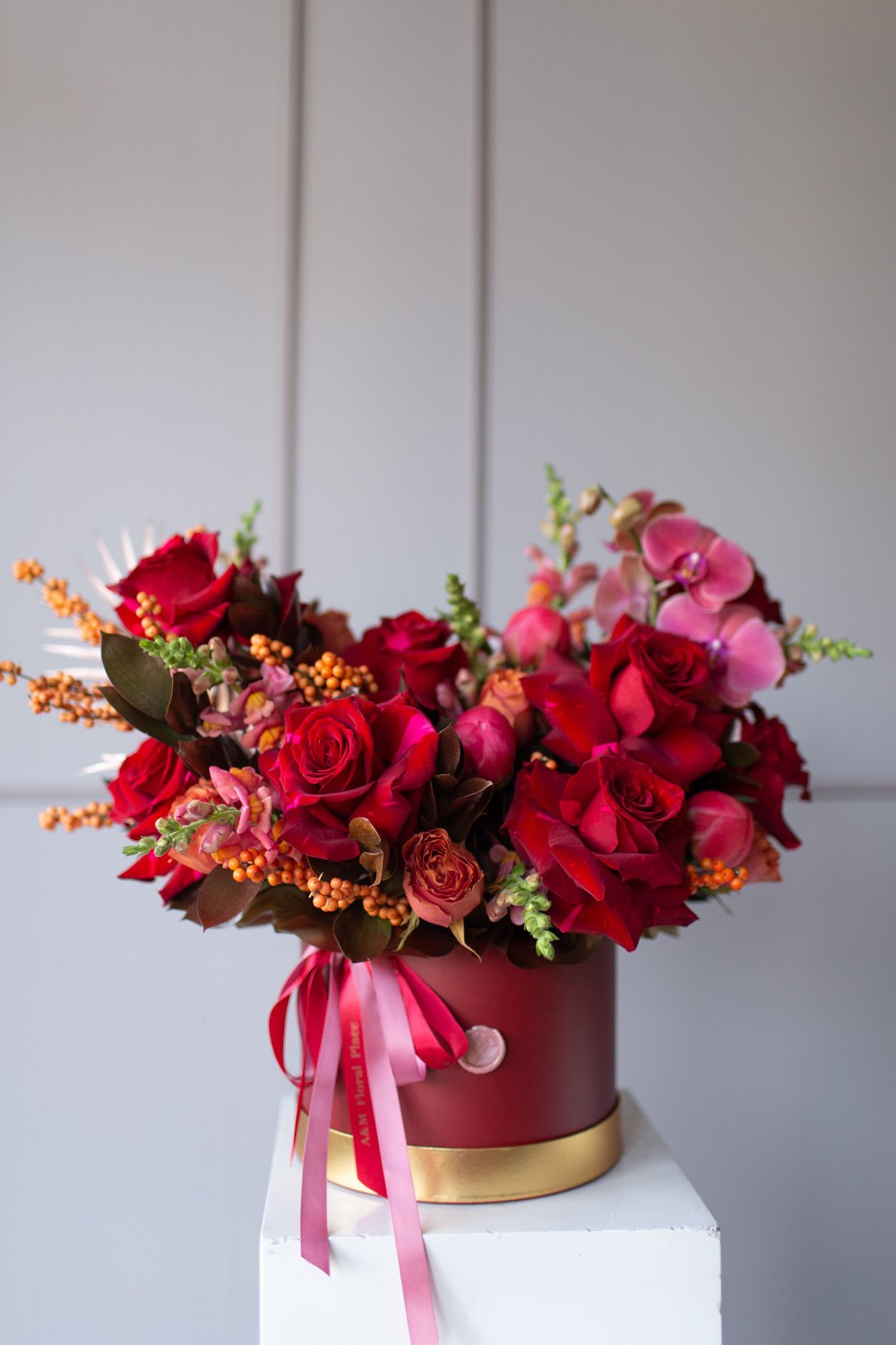 Mix of roses, orchid, and other seasonal flowers in rich red colors.