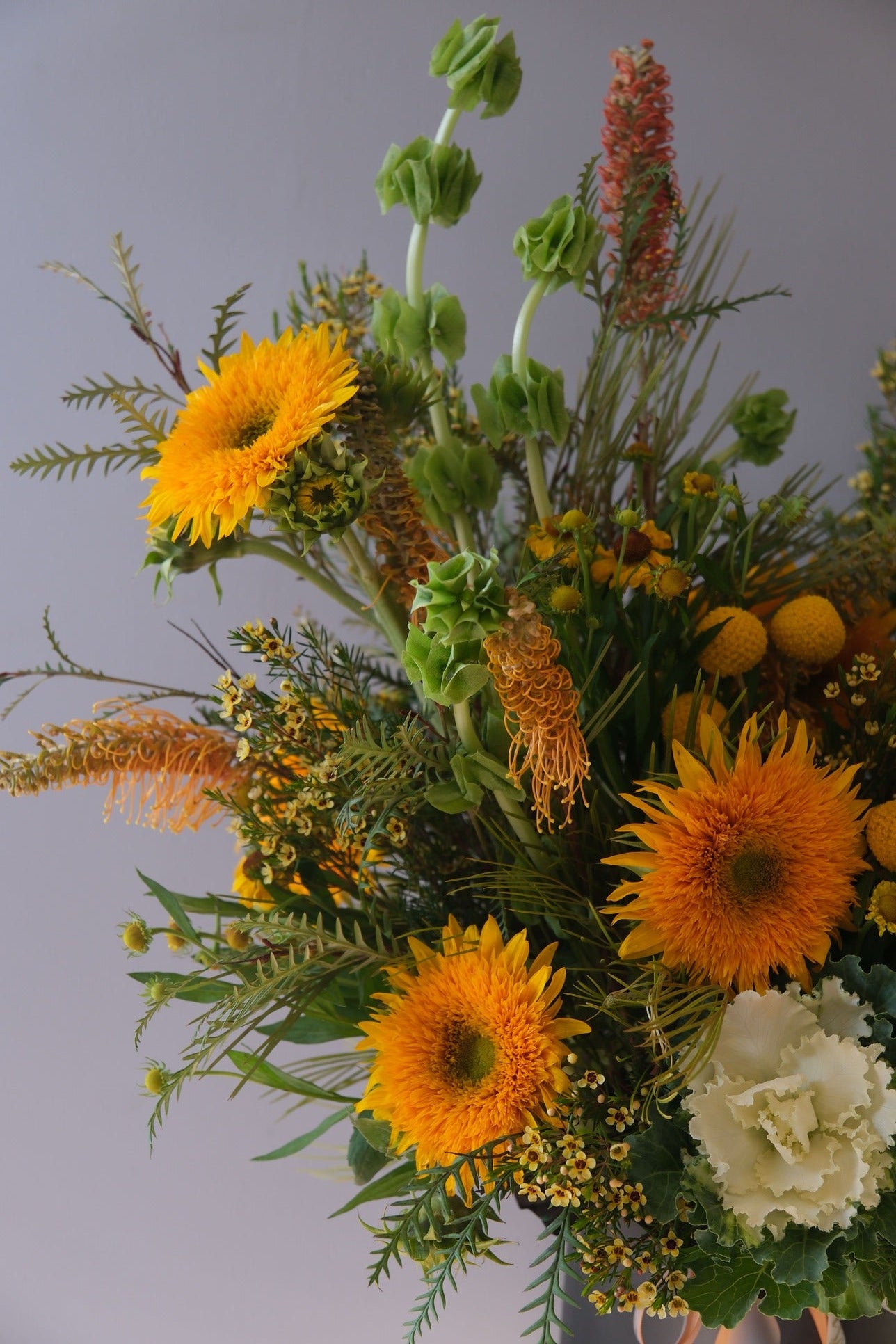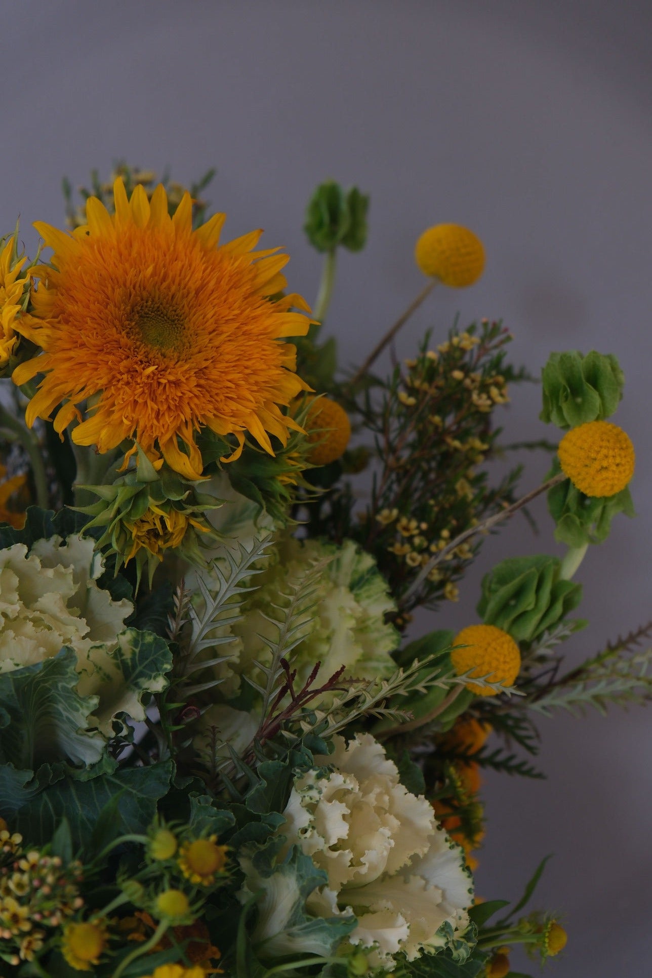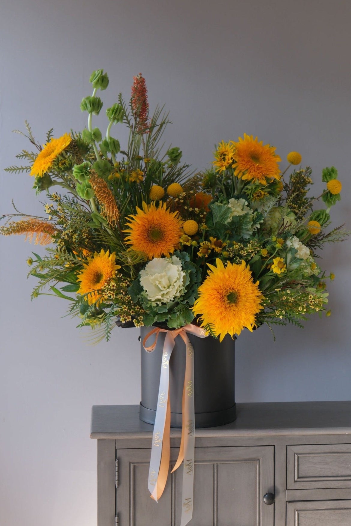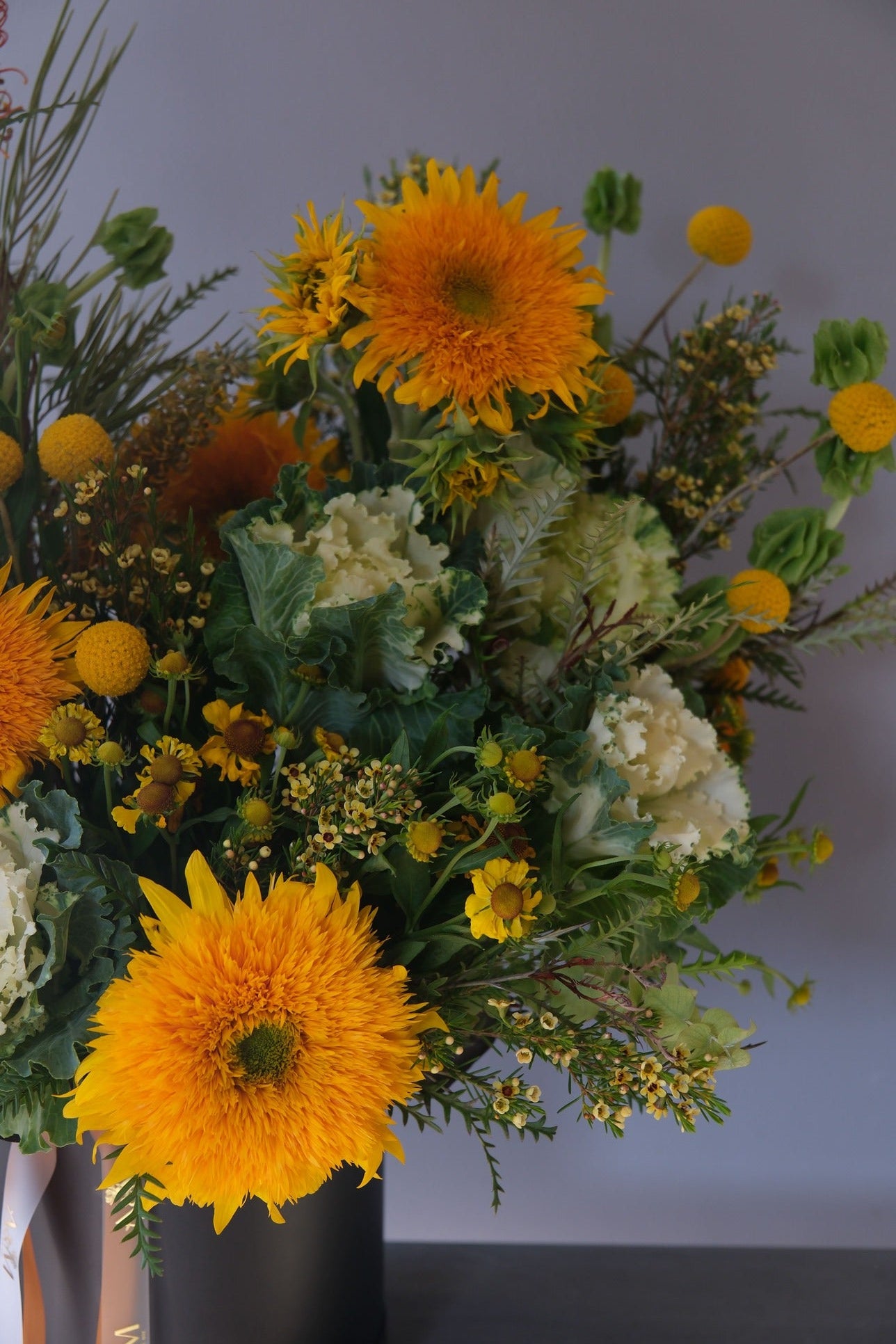 A bold and radiant composition designed in our signature black box. Golden sunflowers take the spotlight, accompanied by elegant brassica, airy decorative chamomile, playful craspedia, and delicate waxflower. Accents of leucadendron, bay leaves, eucalyptus, and lush greenery bring depth and texture, creating a modern and vibrant look.