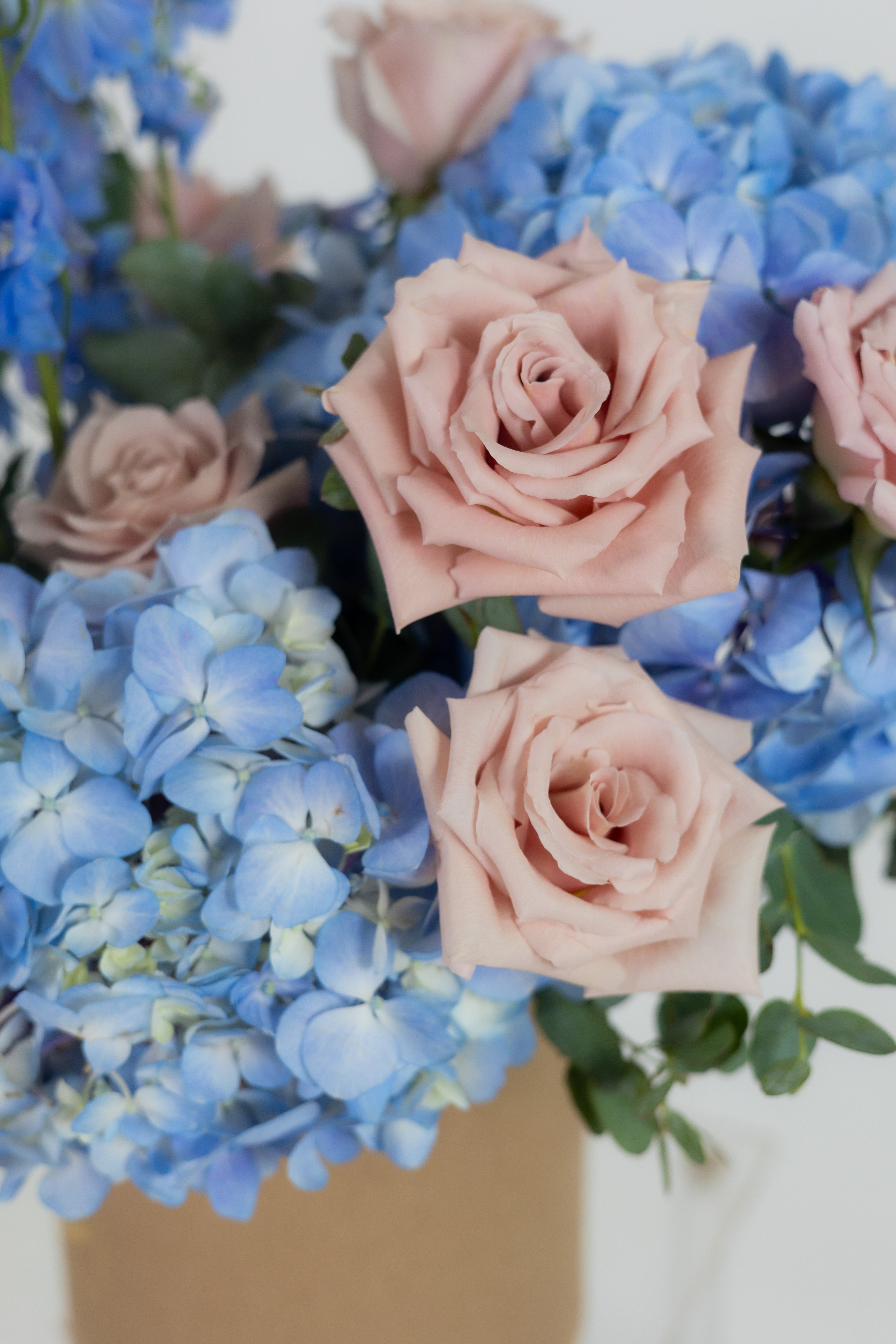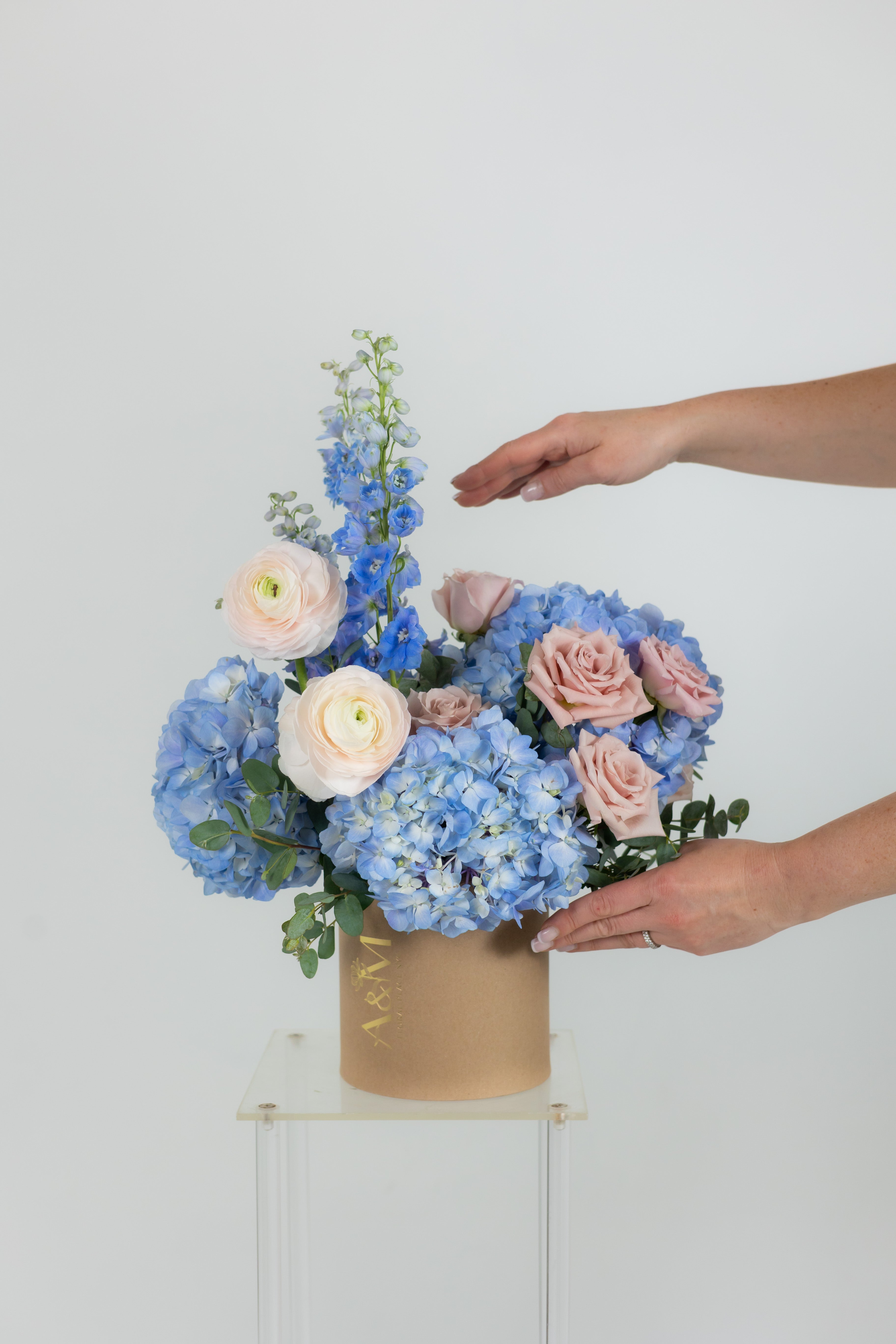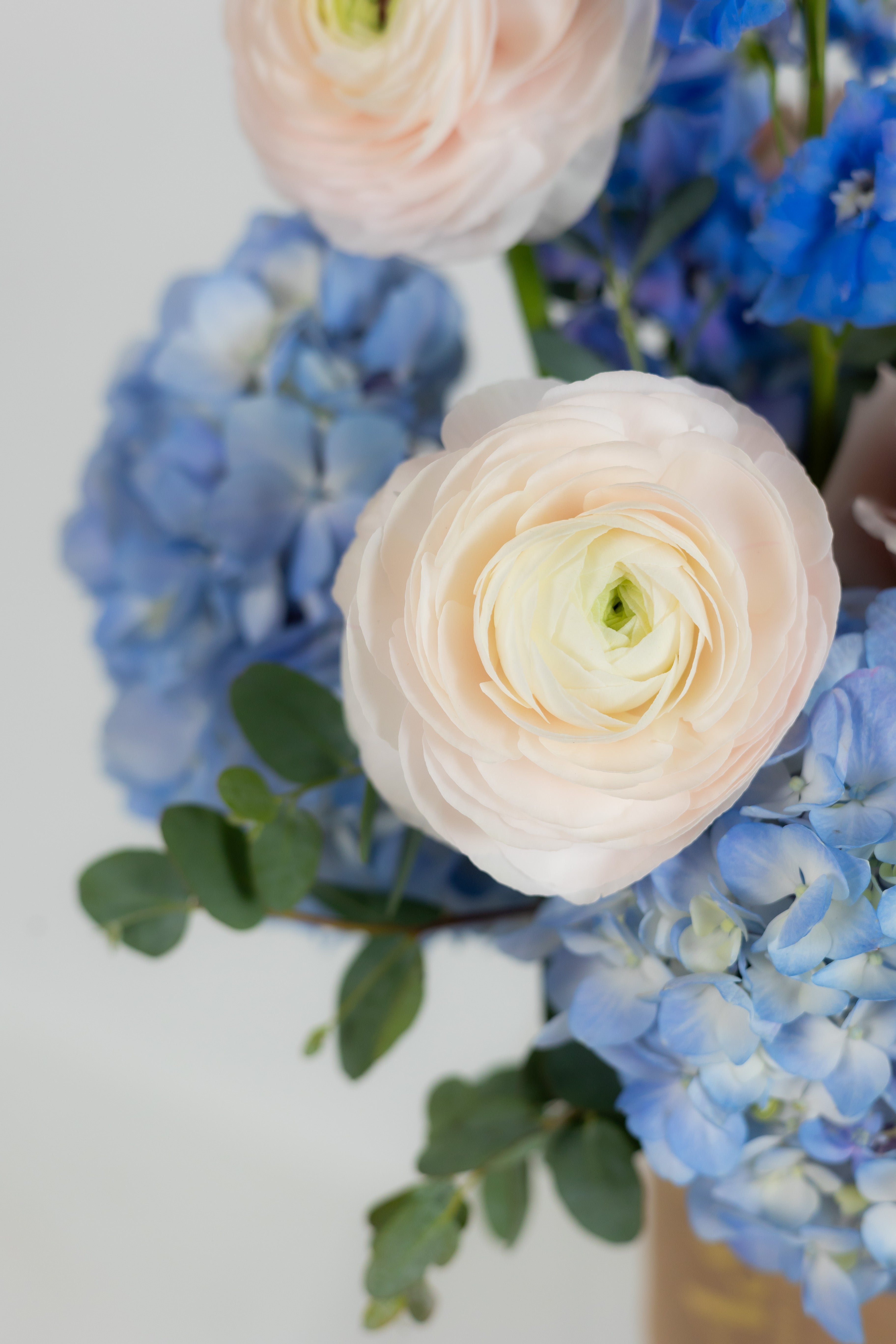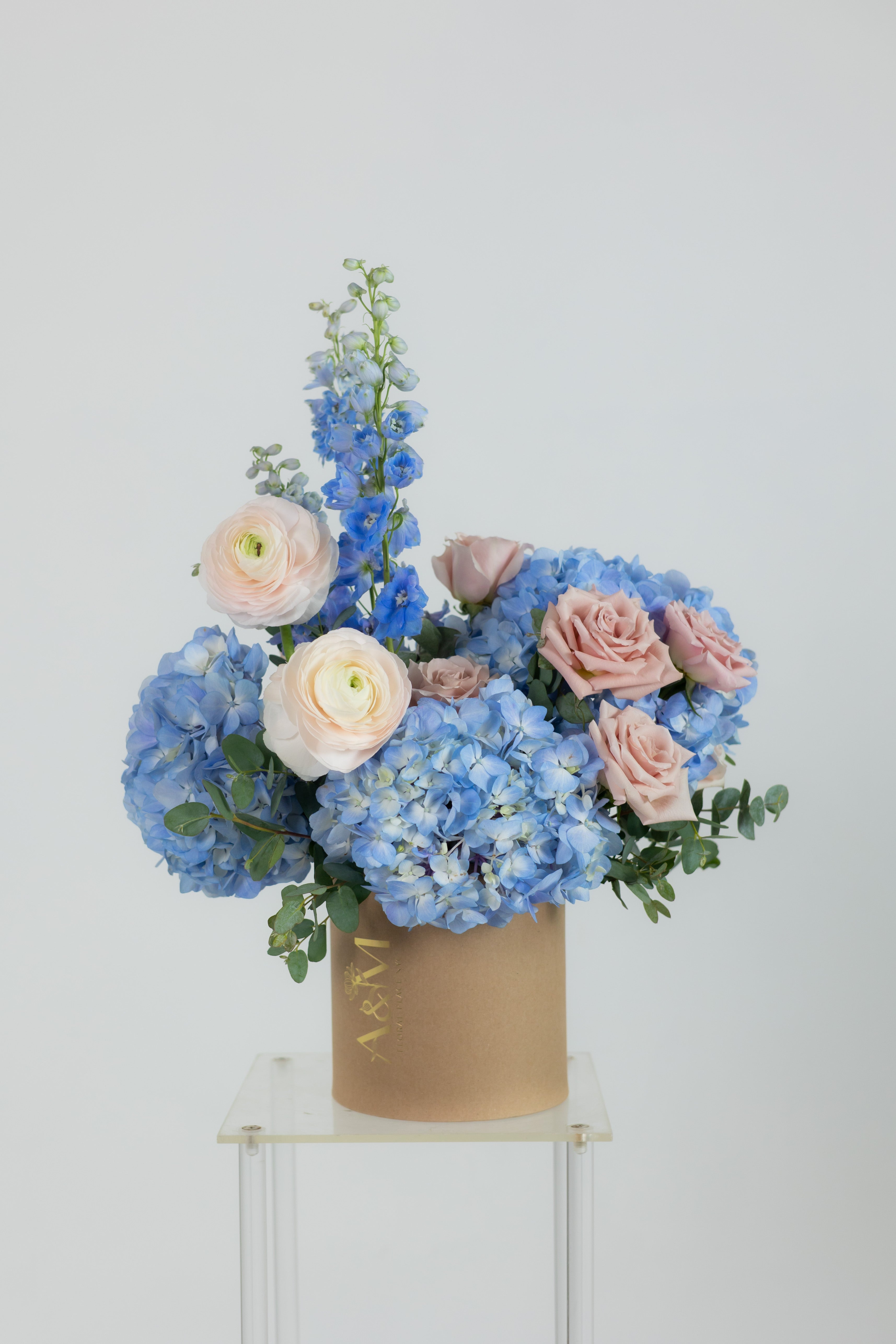 A tender composition of blue hydrangeas, Hanoi ranunculus, and delphiniums, evoking the serenity of a clear sky. Accented with Quick Sand roses and fresh eucalyptus for a dreamy touch.
