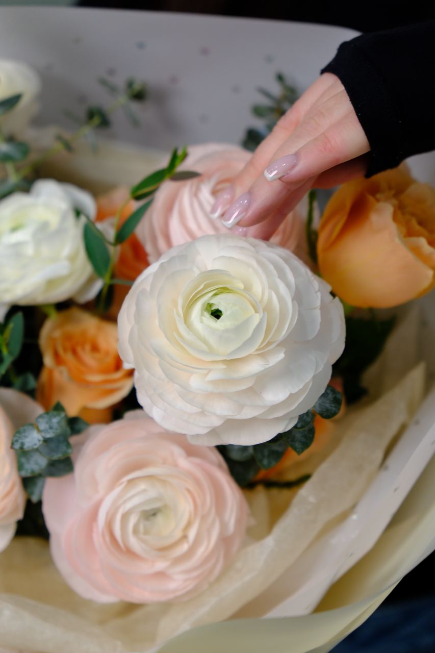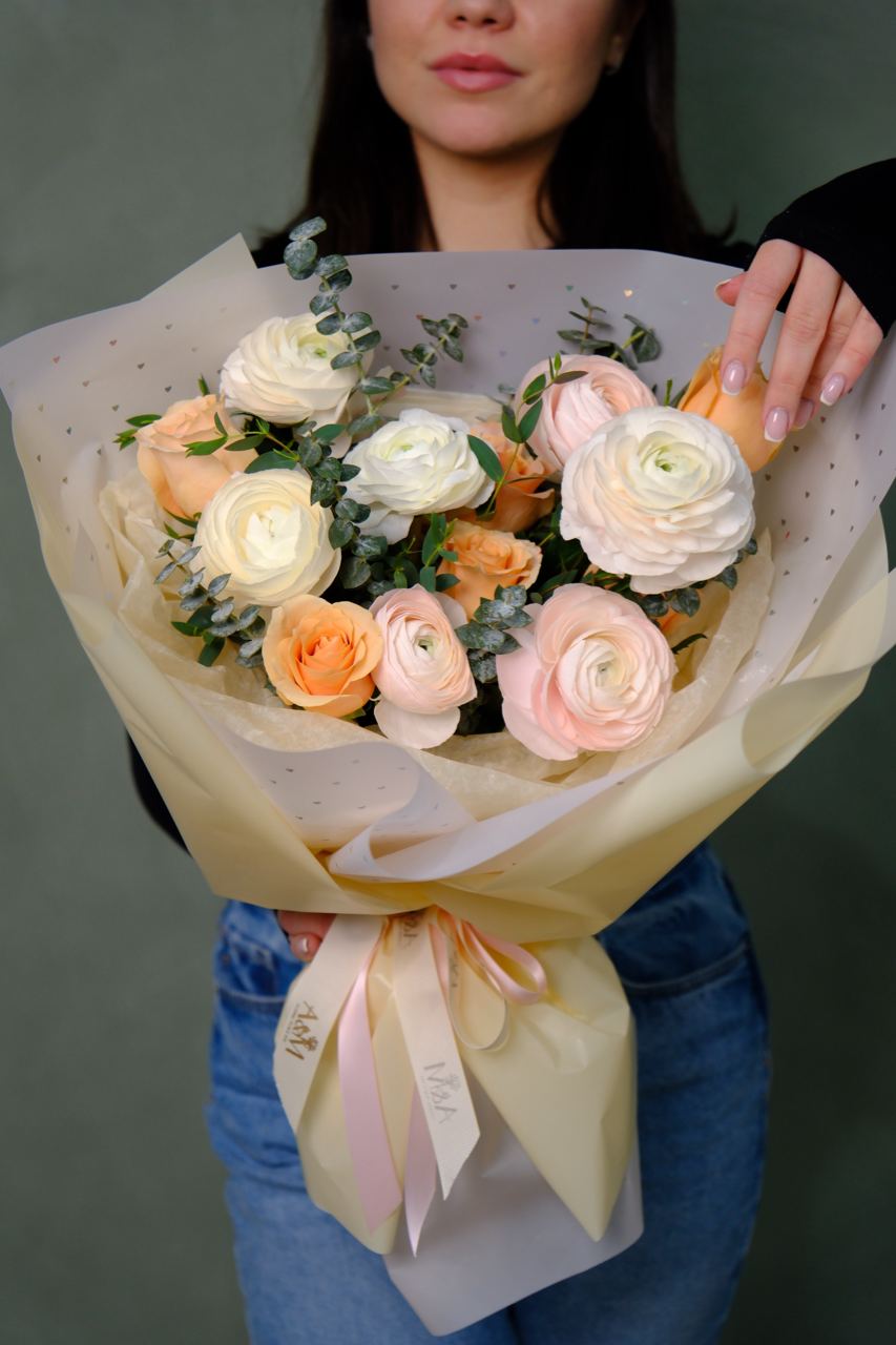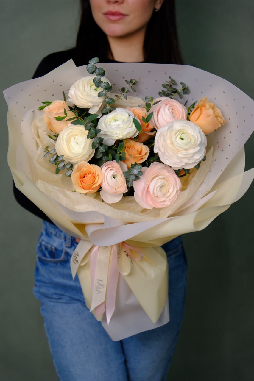 A delicate and airy bouquet featuring lush ranunculus, roses, and greenery. Designed for those who appreciate elegant floral arrangements with a modern, refined style.