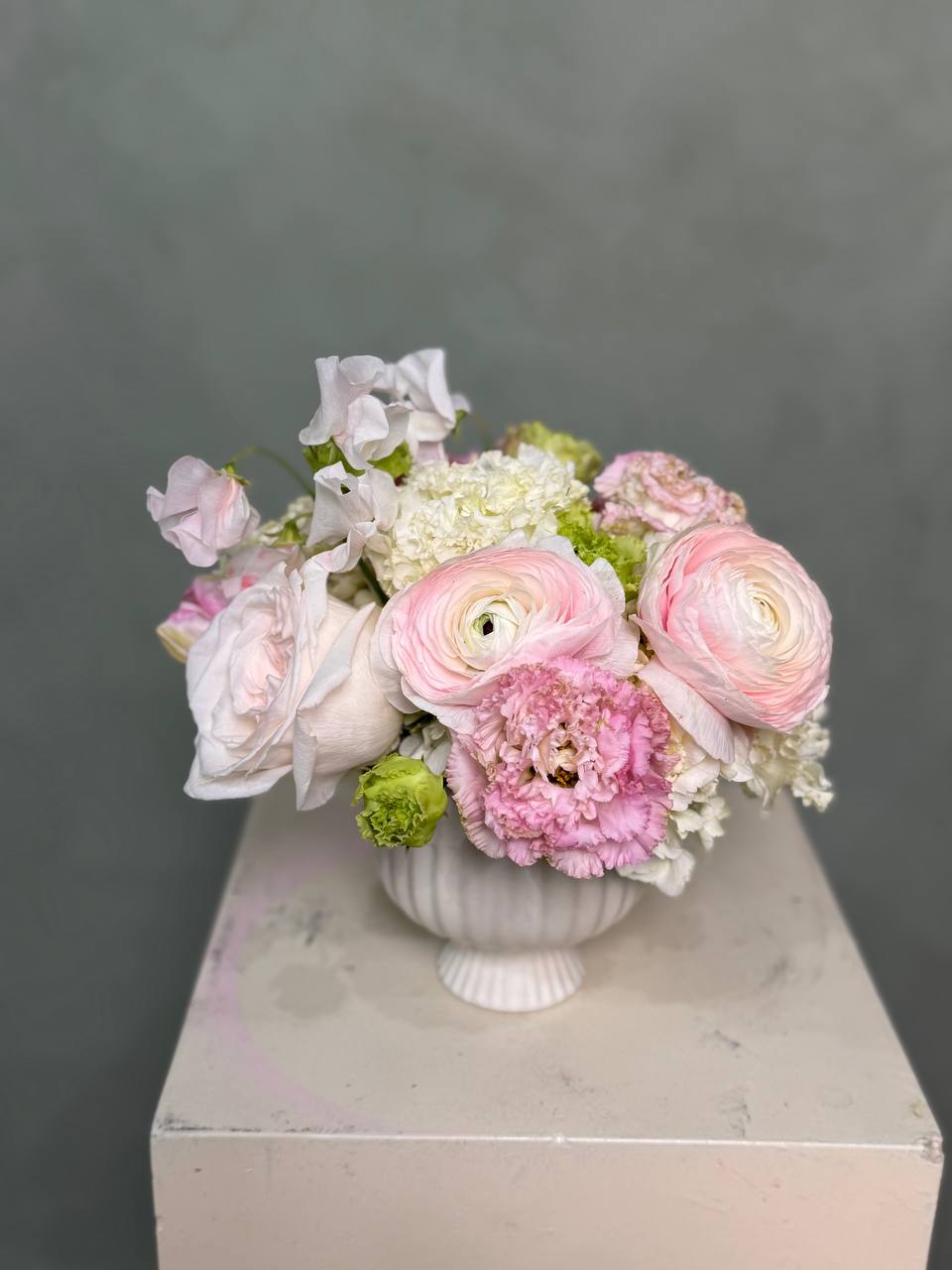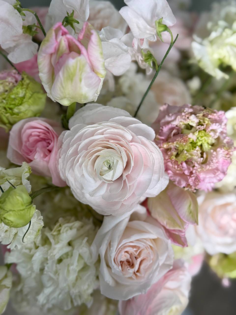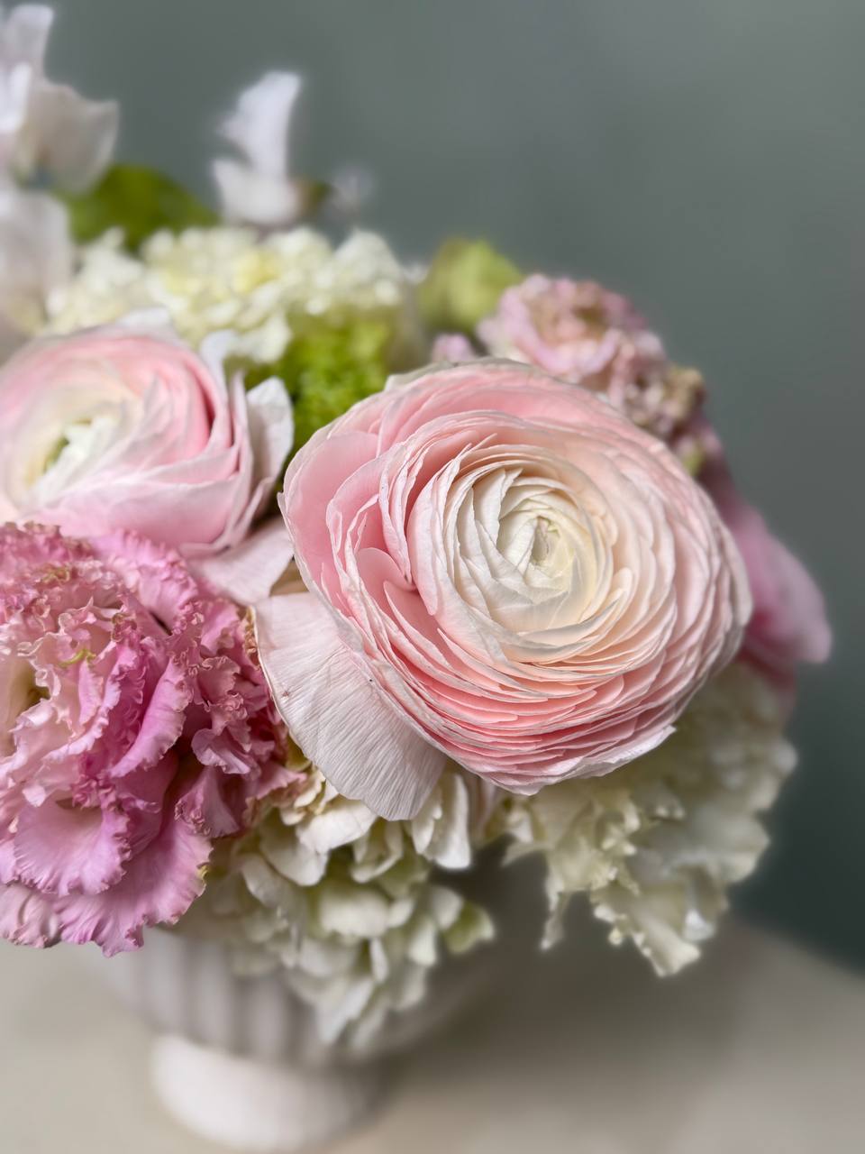 A soft and elegant floral arrangement featuring ranunculus, garden roses, carnations, and delicate seasonal blooms in dreamy shades of blush pink, ivory, and soft pastel tones. Designed in a classic garden style, this composition feels romantic, airy, and timeless — perfect for celebrations, thoughtful gifts, or adding a touch of beauty to any space.