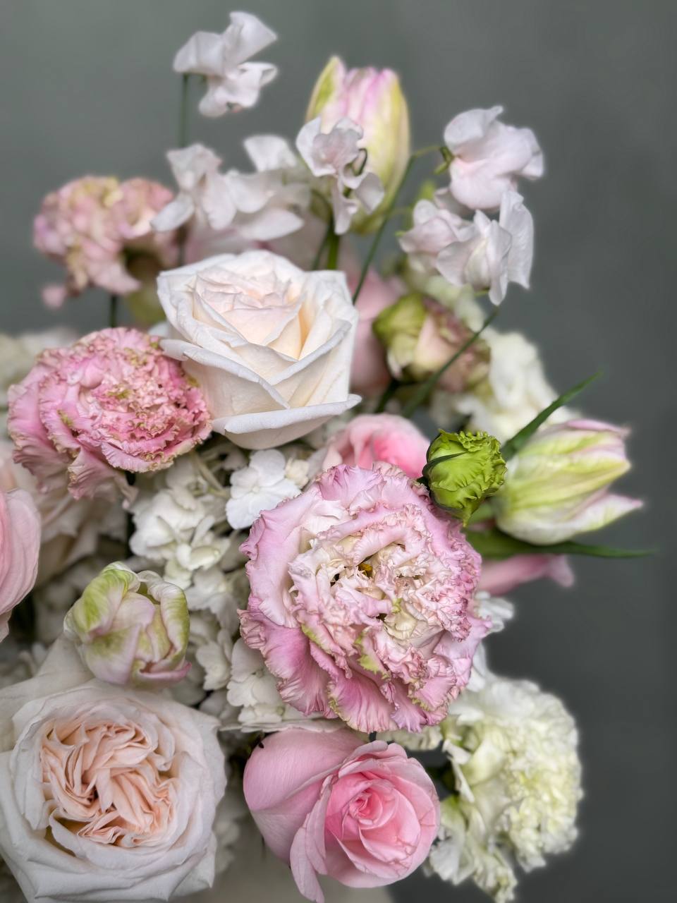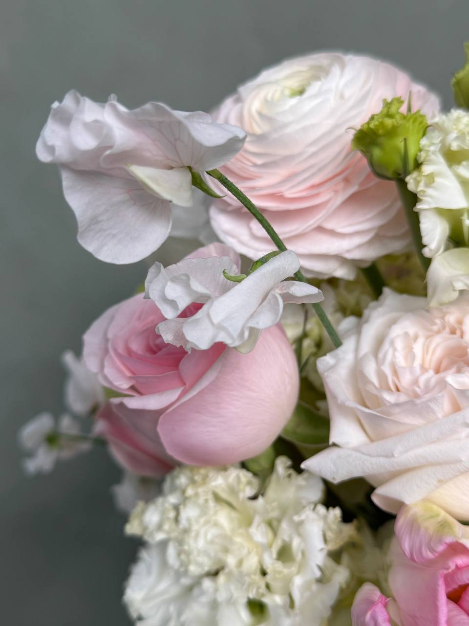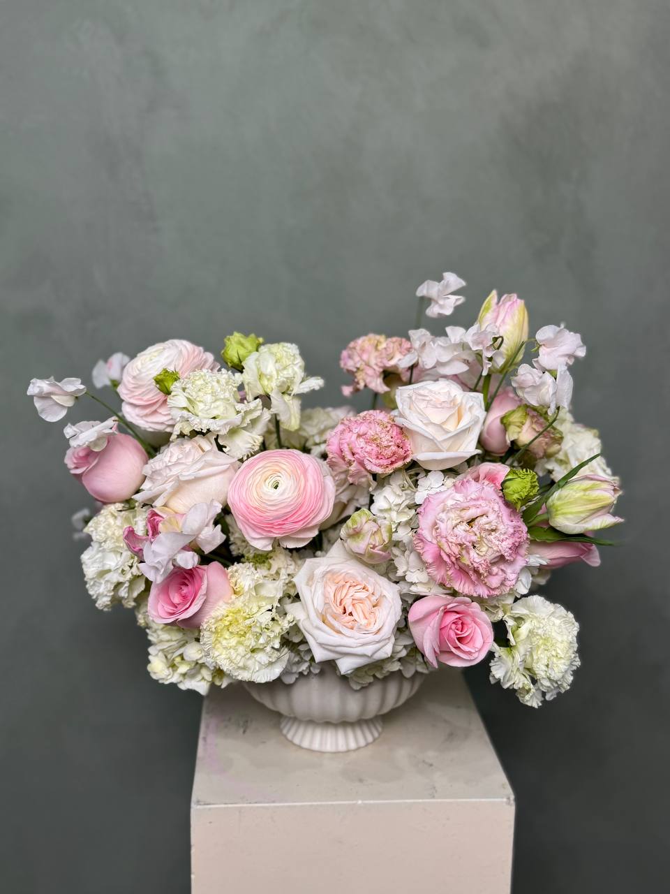 A soft and elegant floral arrangement featuring ranunculus, garden roses, carnations, and delicate seasonal blooms in dreamy shades of blush pink, ivory, and soft pastel tones. Designed in a classic garden style, this composition feels romantic, airy, and timeless — perfect for celebrations, thoughtful gifts, or adding a touch of beauty to any space.