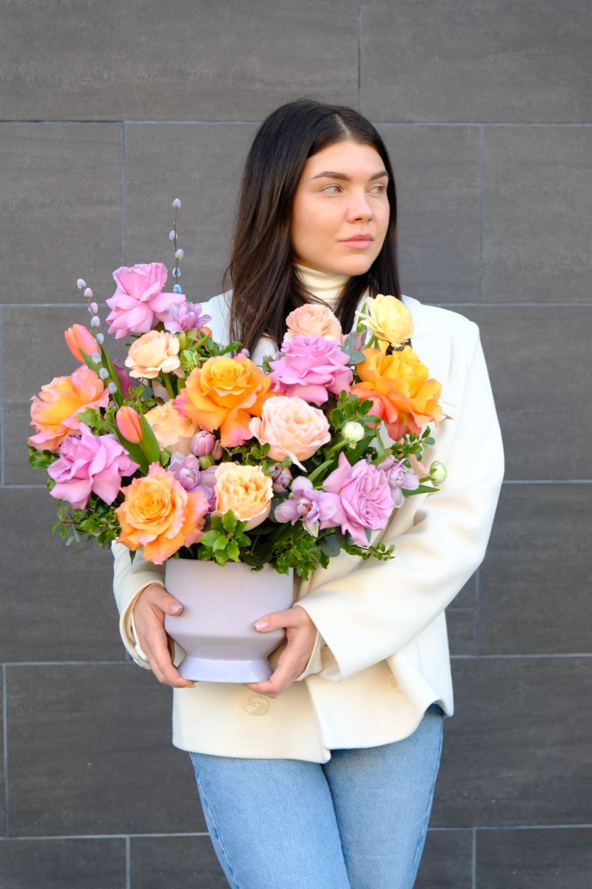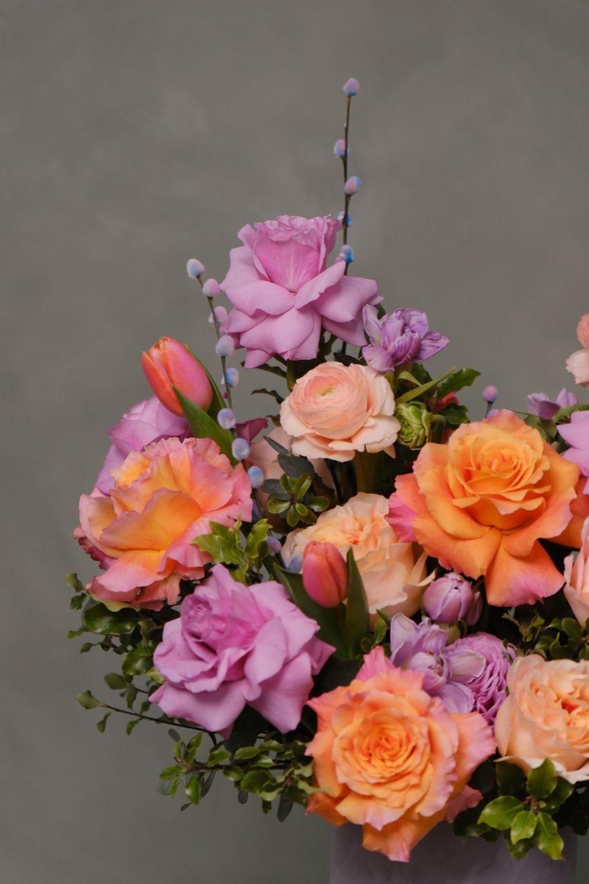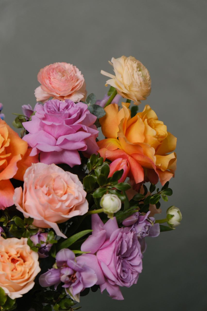 A vibrant garden-style arrangement featuring roses, ranunculus, tulips, and delicate seasonal blooms in warm shades of peach, coral, soft pink, and lavender. This joyful composition is designed to create an instant mood boost, inspired by the dopamine bouquet trend and the beauty of a blooming summer garden.