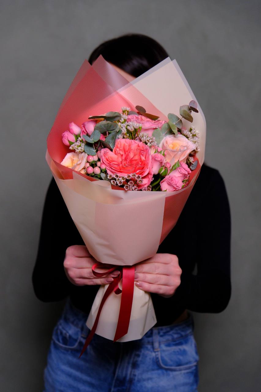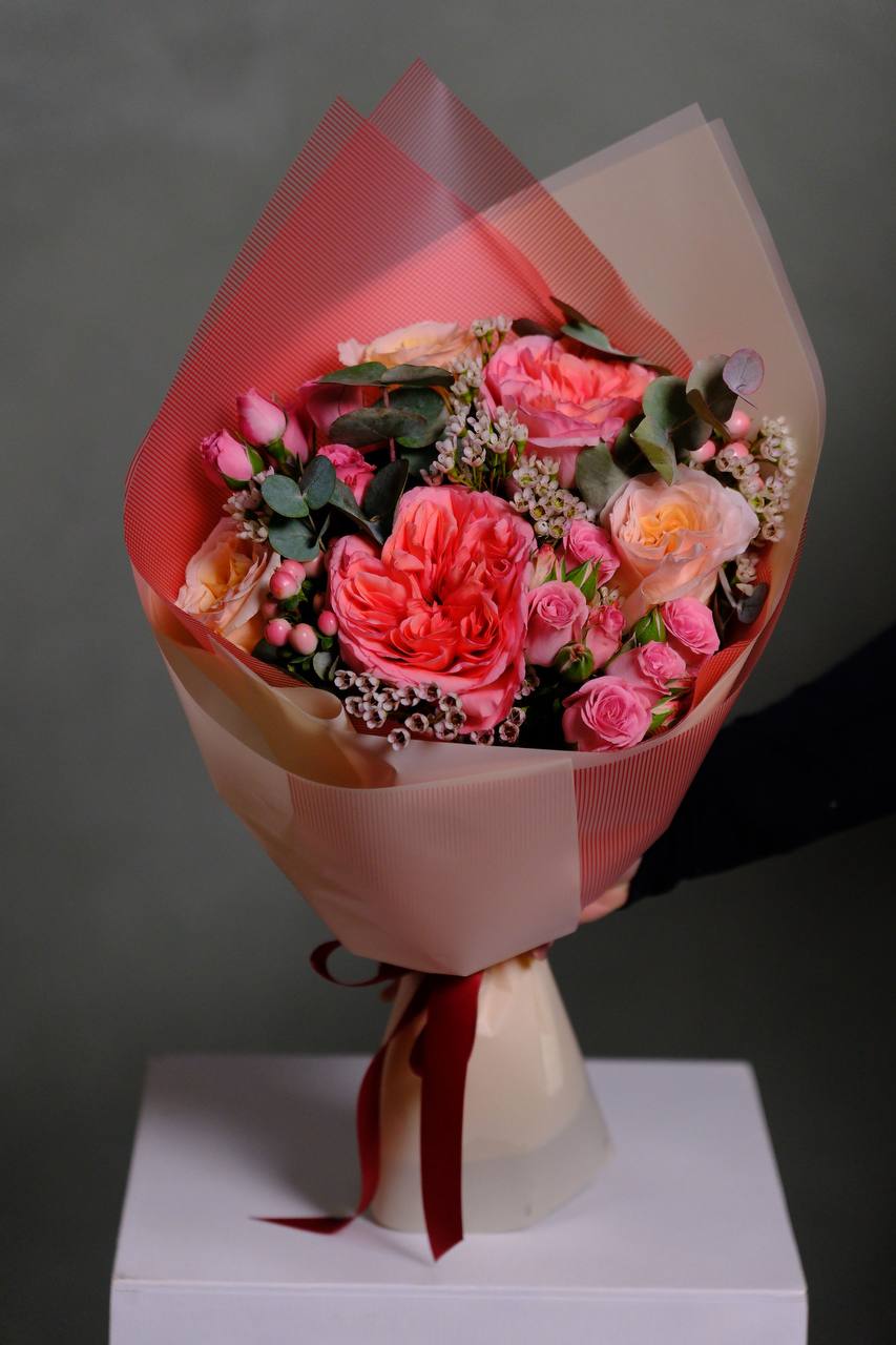 A delicate and refined bouquet in soft shades of pink, coral, and cream. Lush garden roses, spray roses, subtle berry accents, and fresh greenery come together to create a light, airy composition with a natural flow. The semi-transparent wrap highlights the beauty of the blooms and adds a modern, elegant finish.