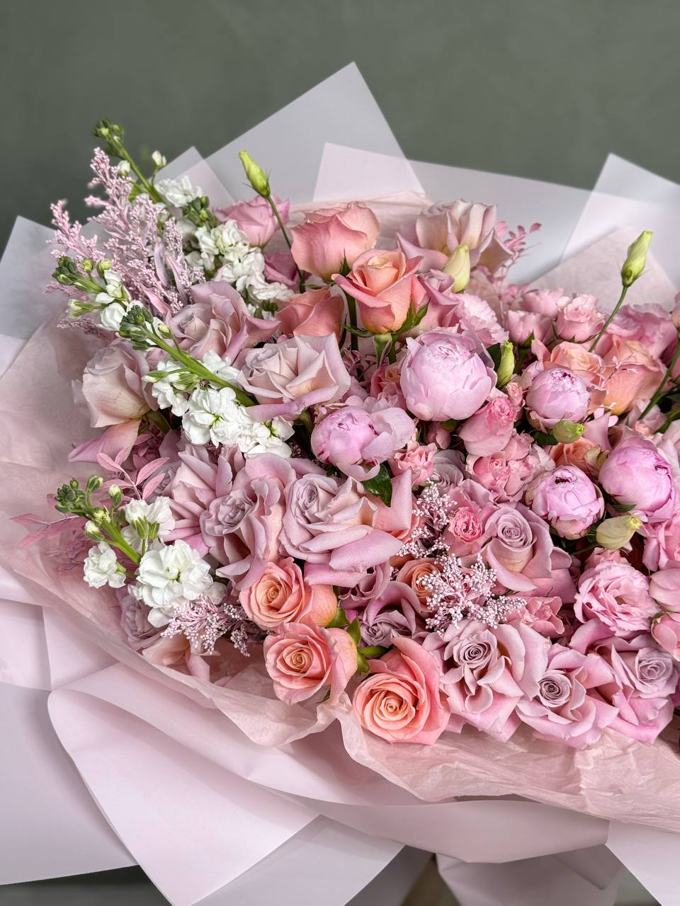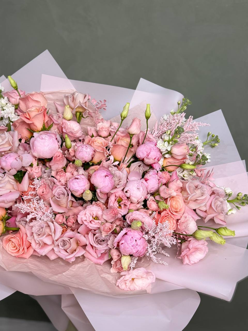 A lush floral composition featuring roses, peonies, and seasonal blooms in romantic shades of pink, blush, and soft peach. With its layered textures and garden-inspired design, this bouquet creates a luxurious and expressive statement.