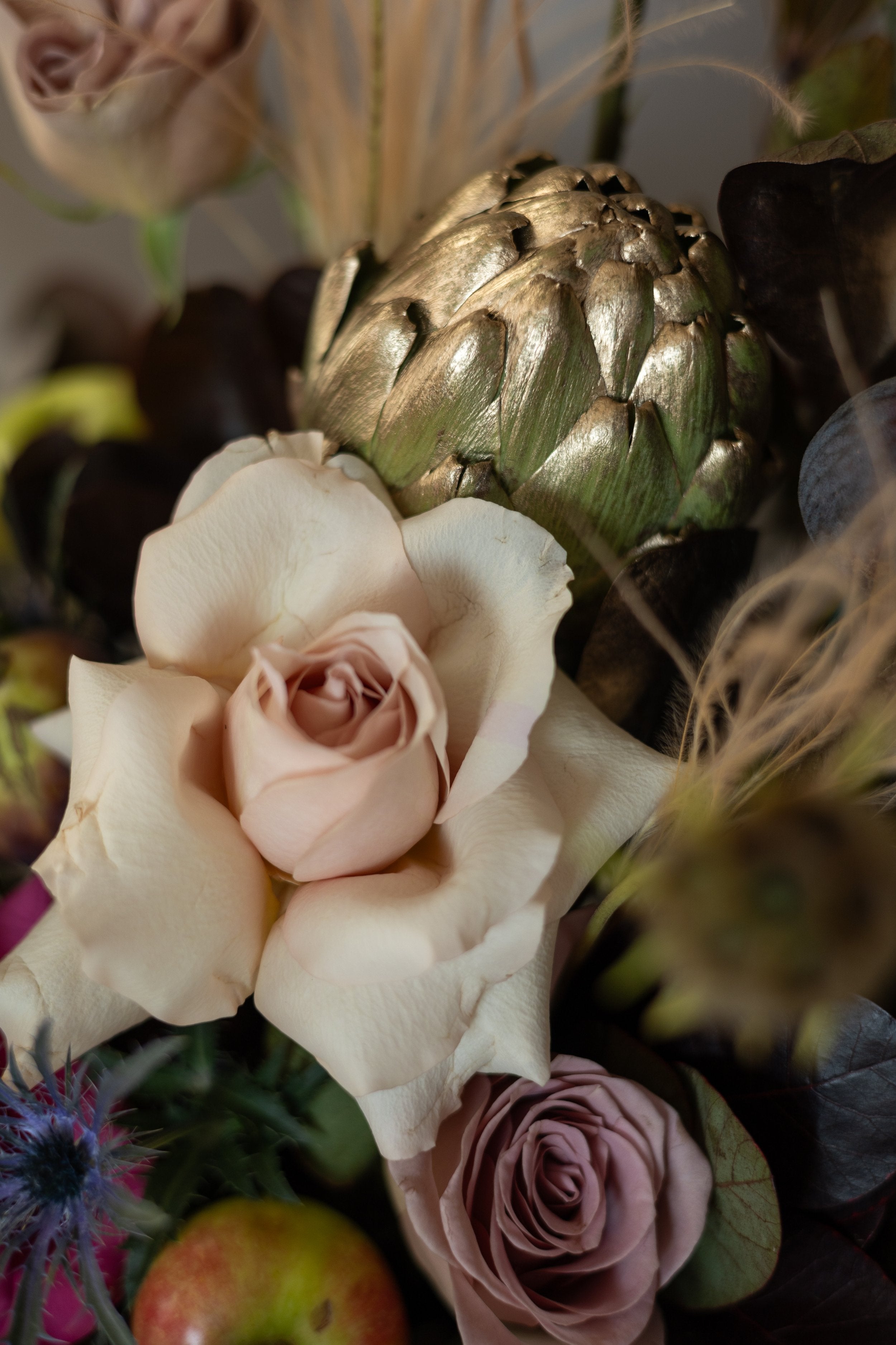 Mix of seasonal flowers, real and artificial fruits in a vase. A mix of roses, eustomas, chrysanthemums, eryngos, figs, apples, and other seasonal flowers.
