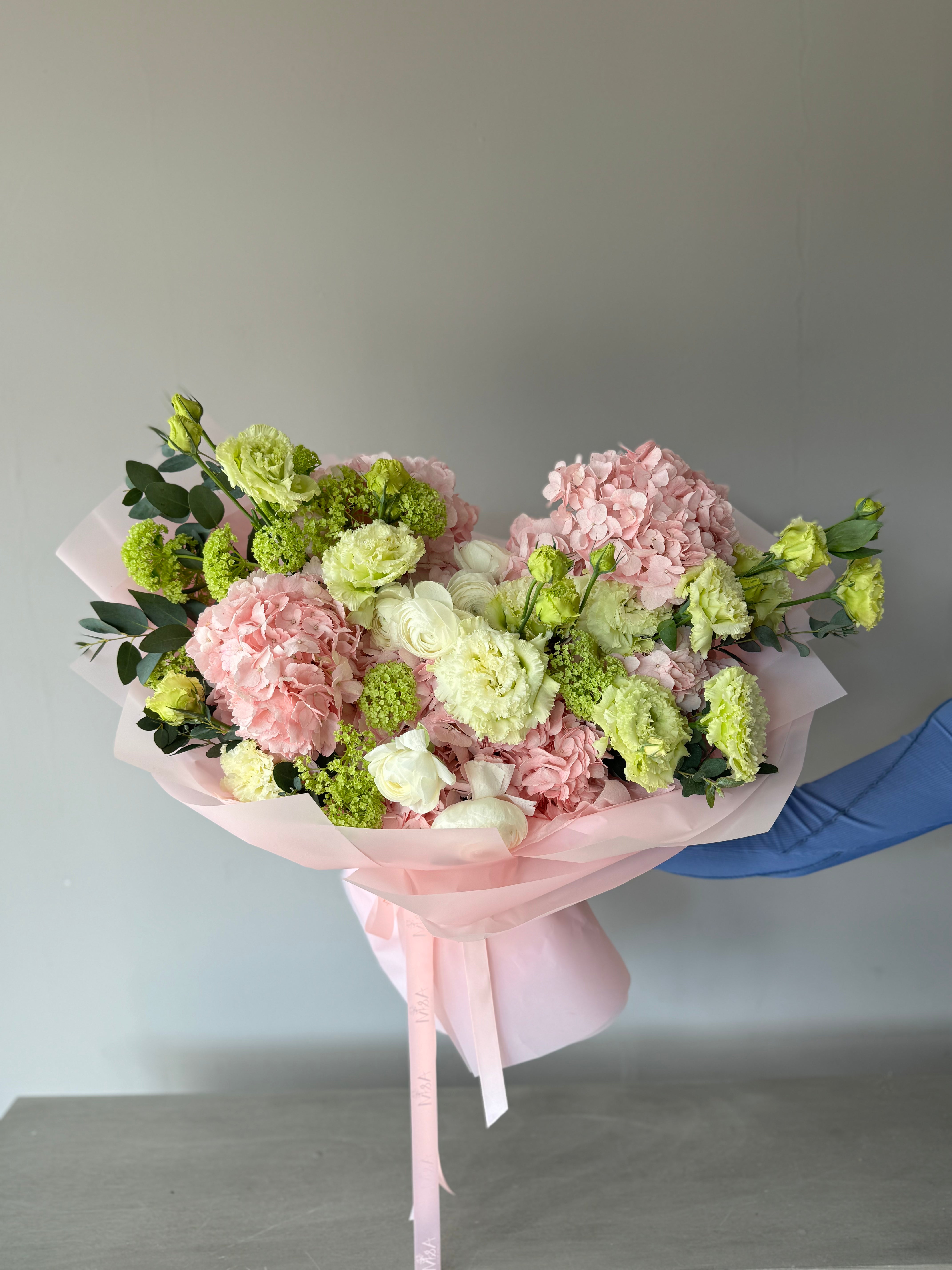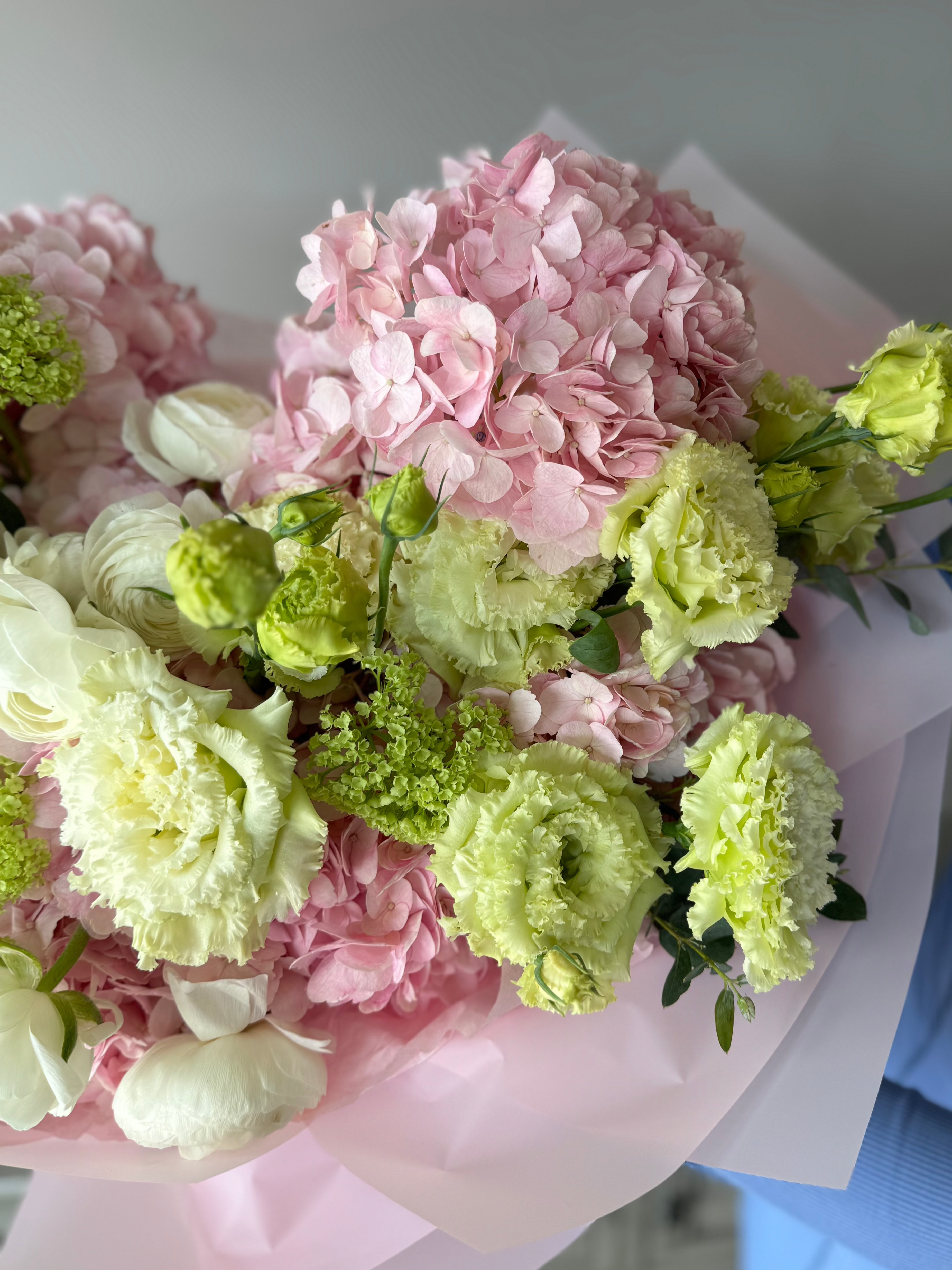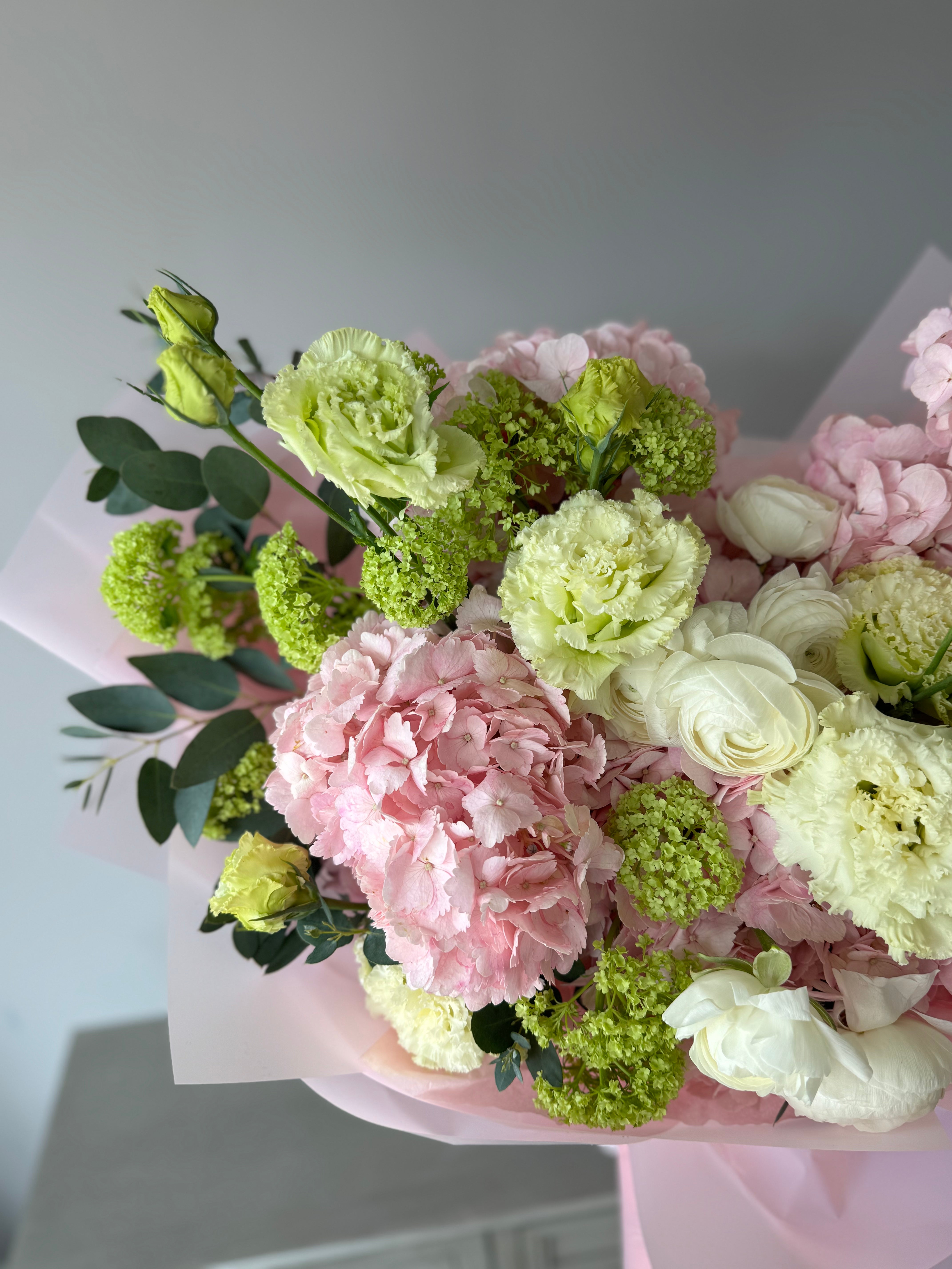 This spring bouquet is filled with freshness and vibrant colors. Soft pink hydrangea, lisianthuses, and ranunculuses create an exquisite blend of pink and green shades, giving the composition lightness and harmony. Each flower seems to bring the joy of spring and the awakening of nature into the world. It’s the perfect gift to bring light and warmth to any day.