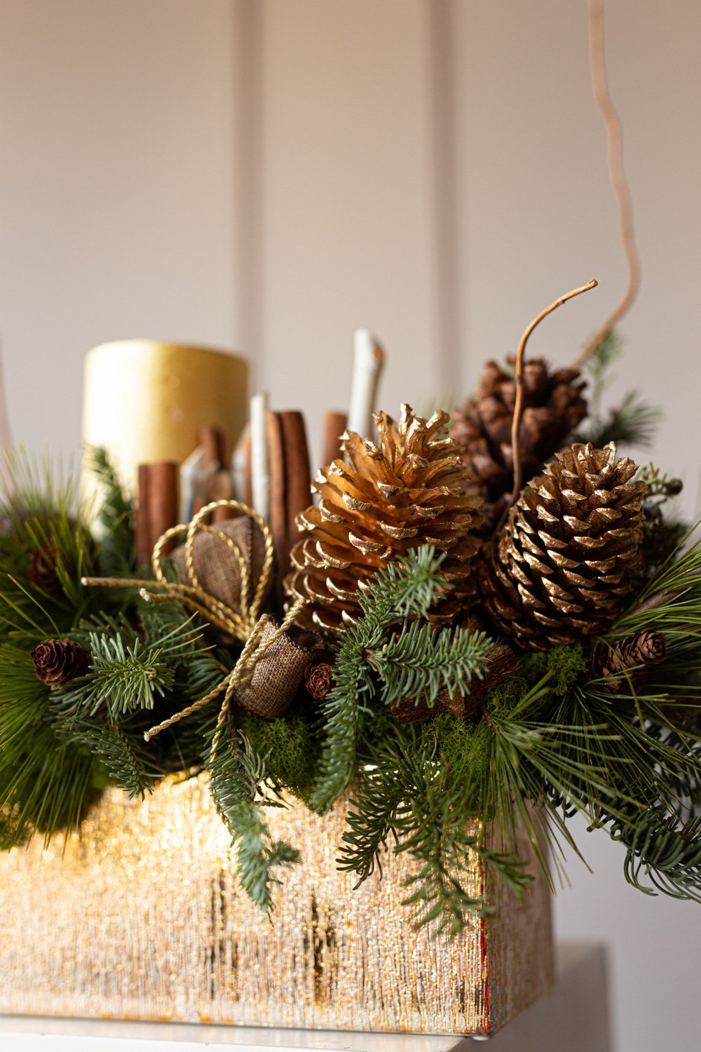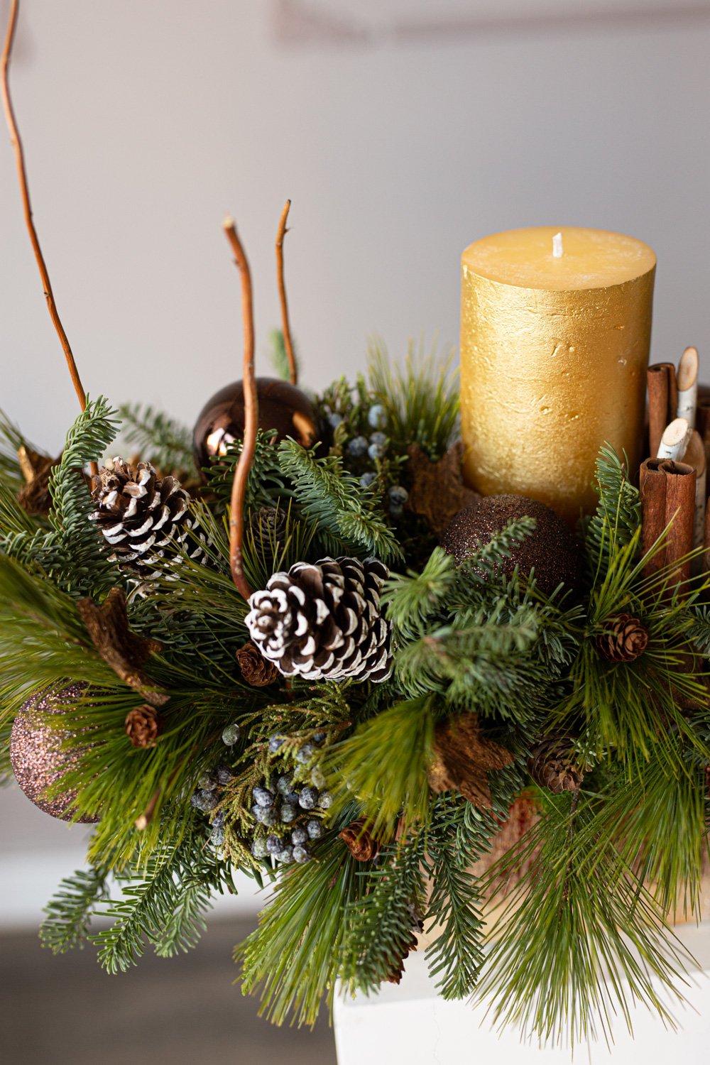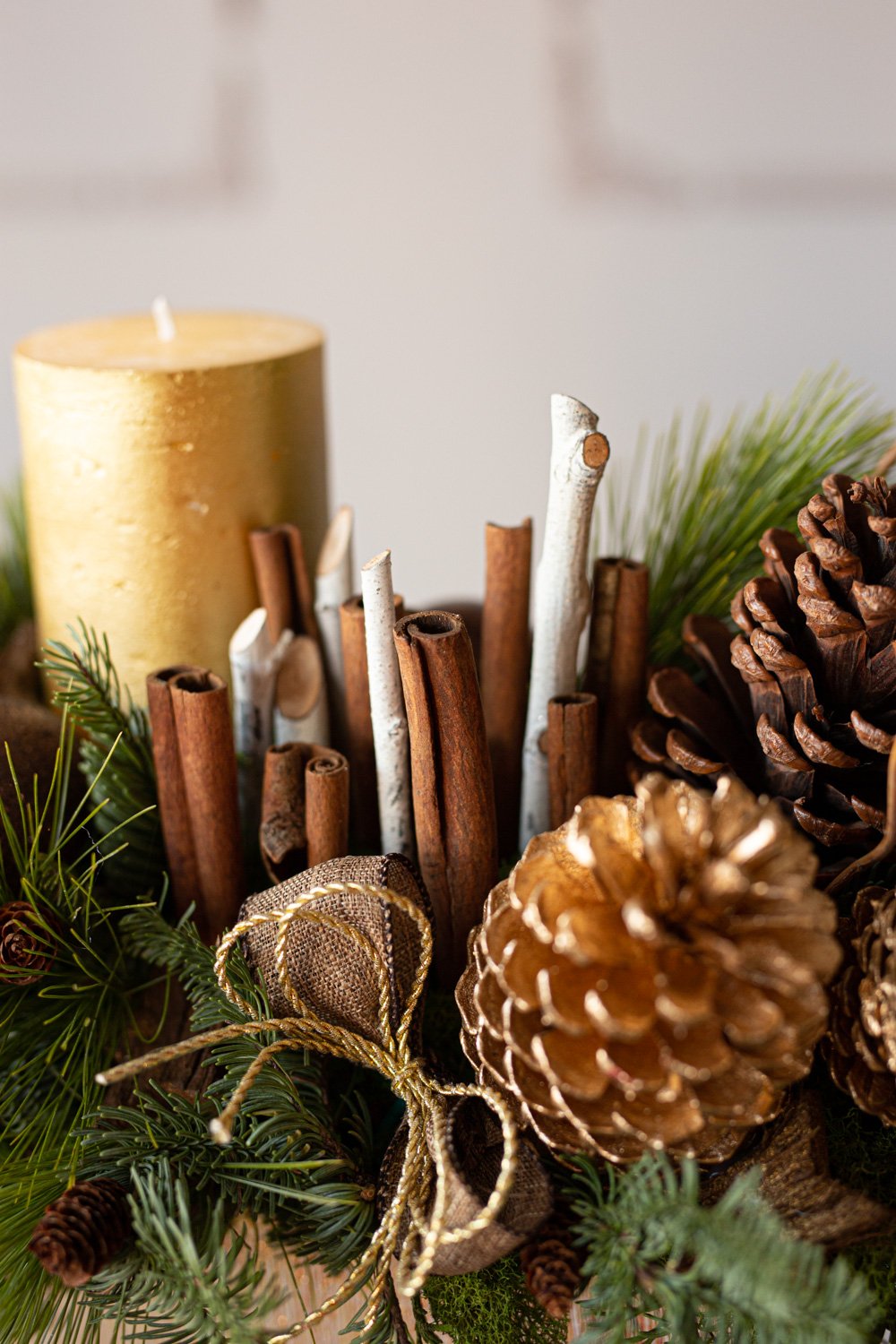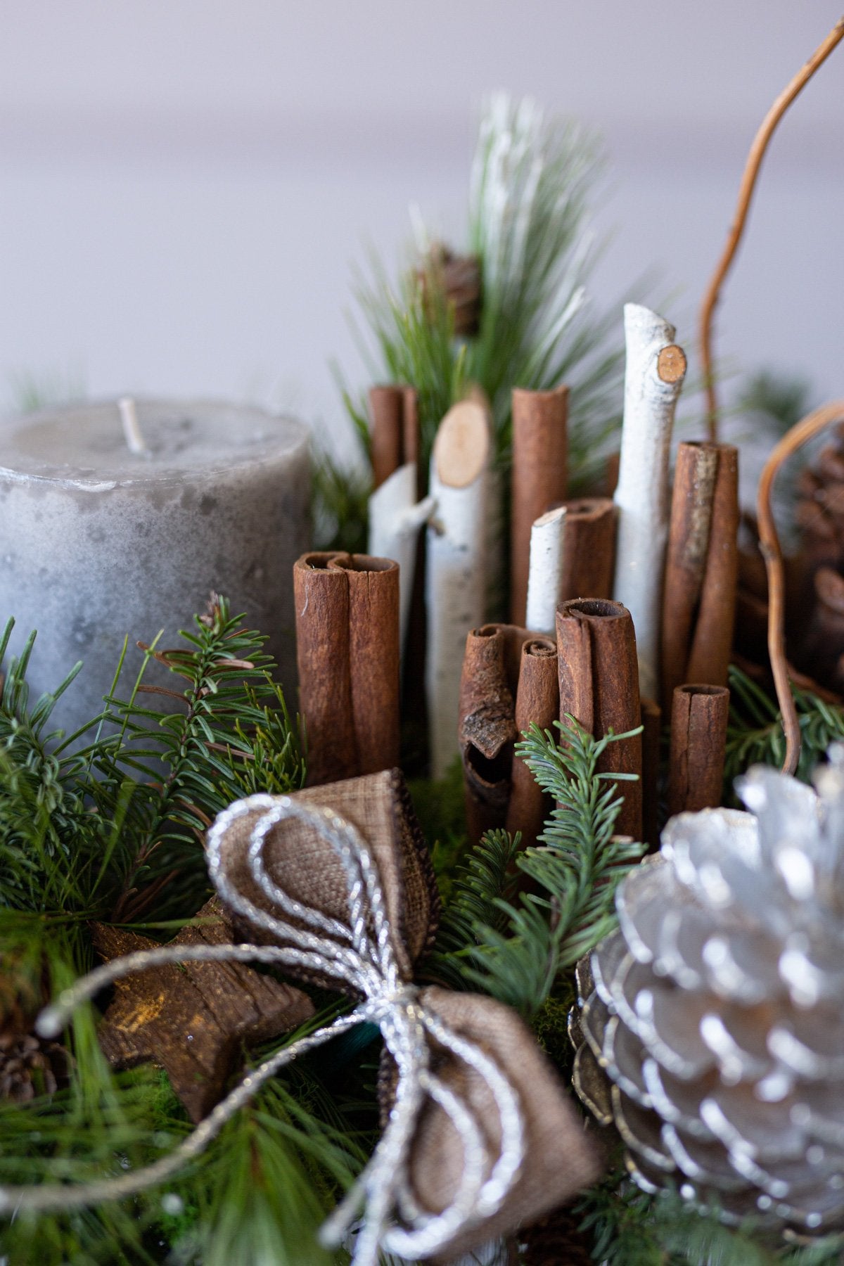 Holiday centerpiece with pine, noble pine, cinnamon sticks, and a wax candle.