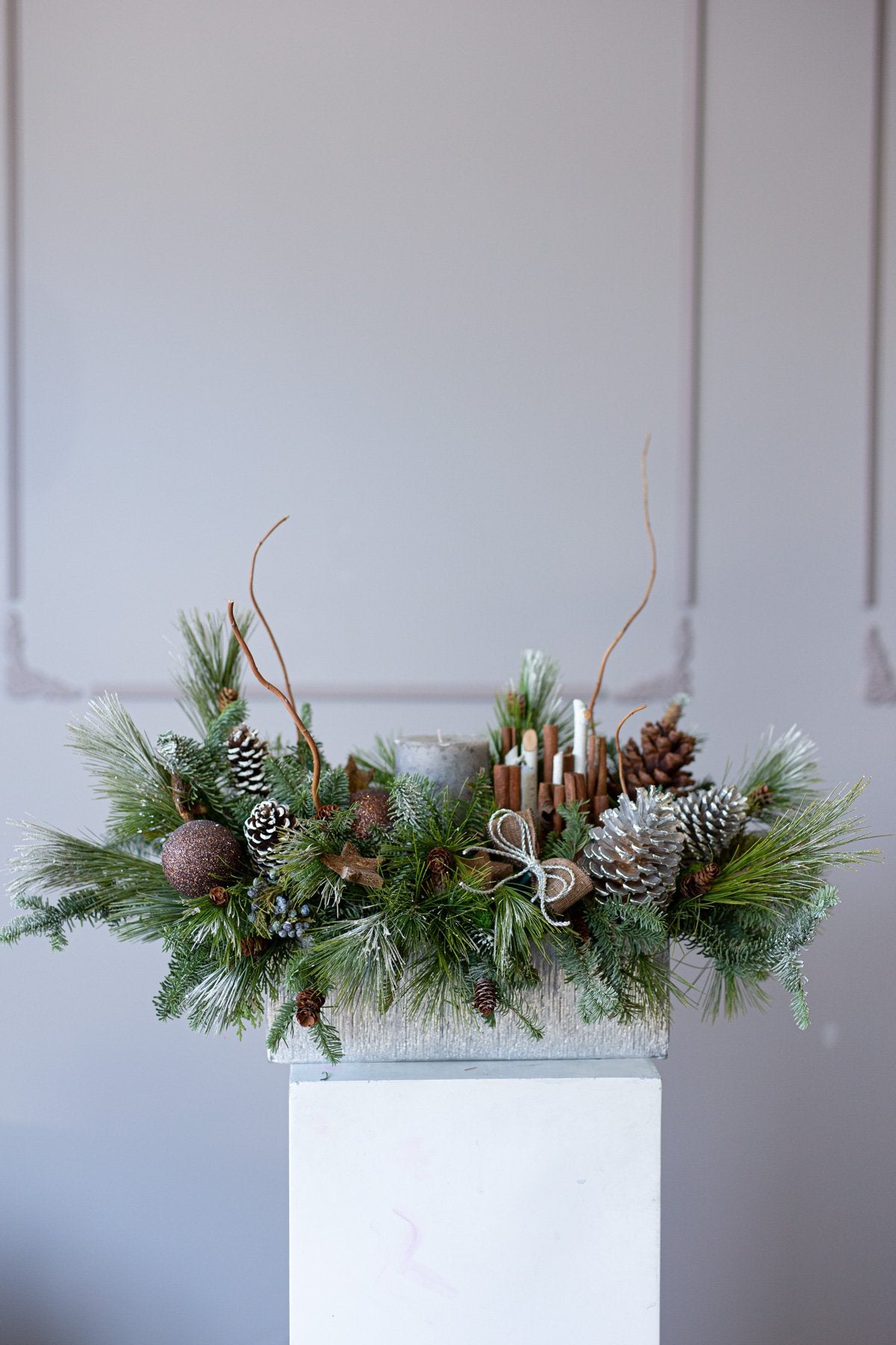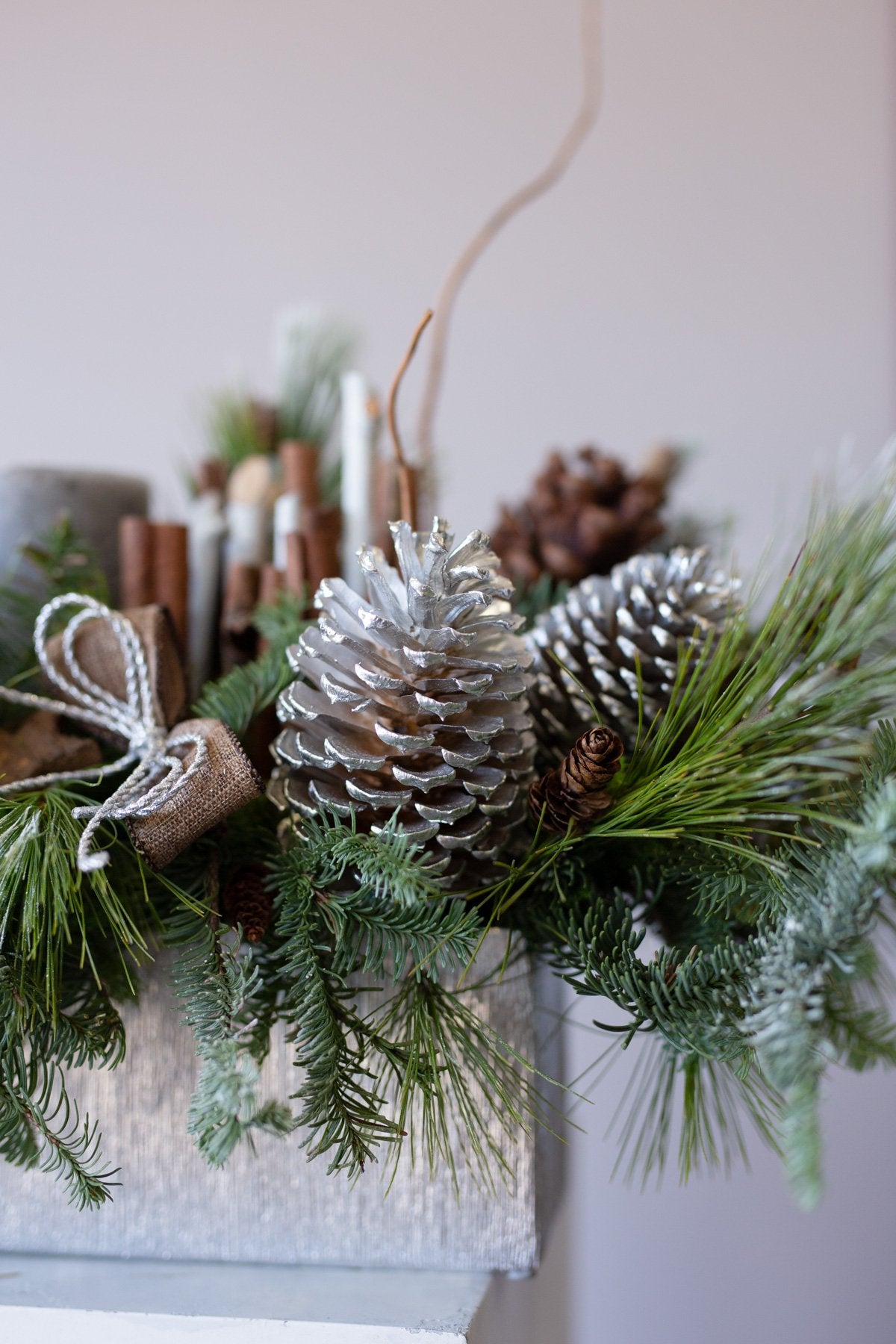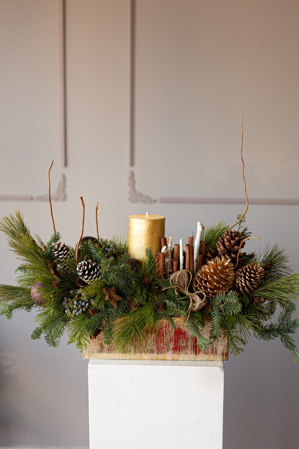 Holiday centerpiece with pine, noble pine, cinnamon sticks, and a wax candle.