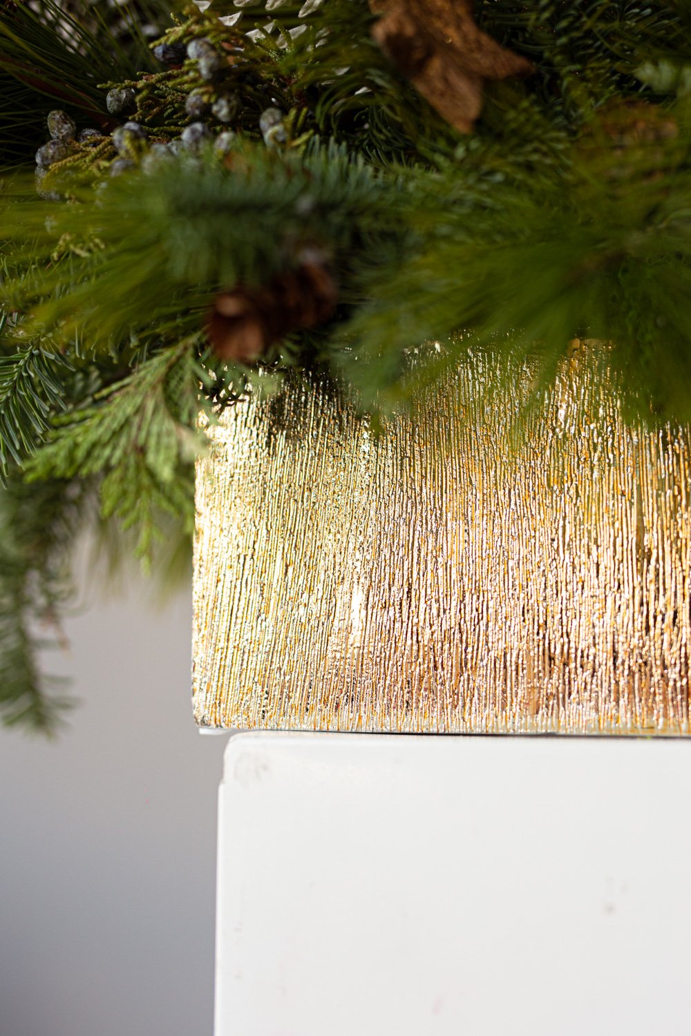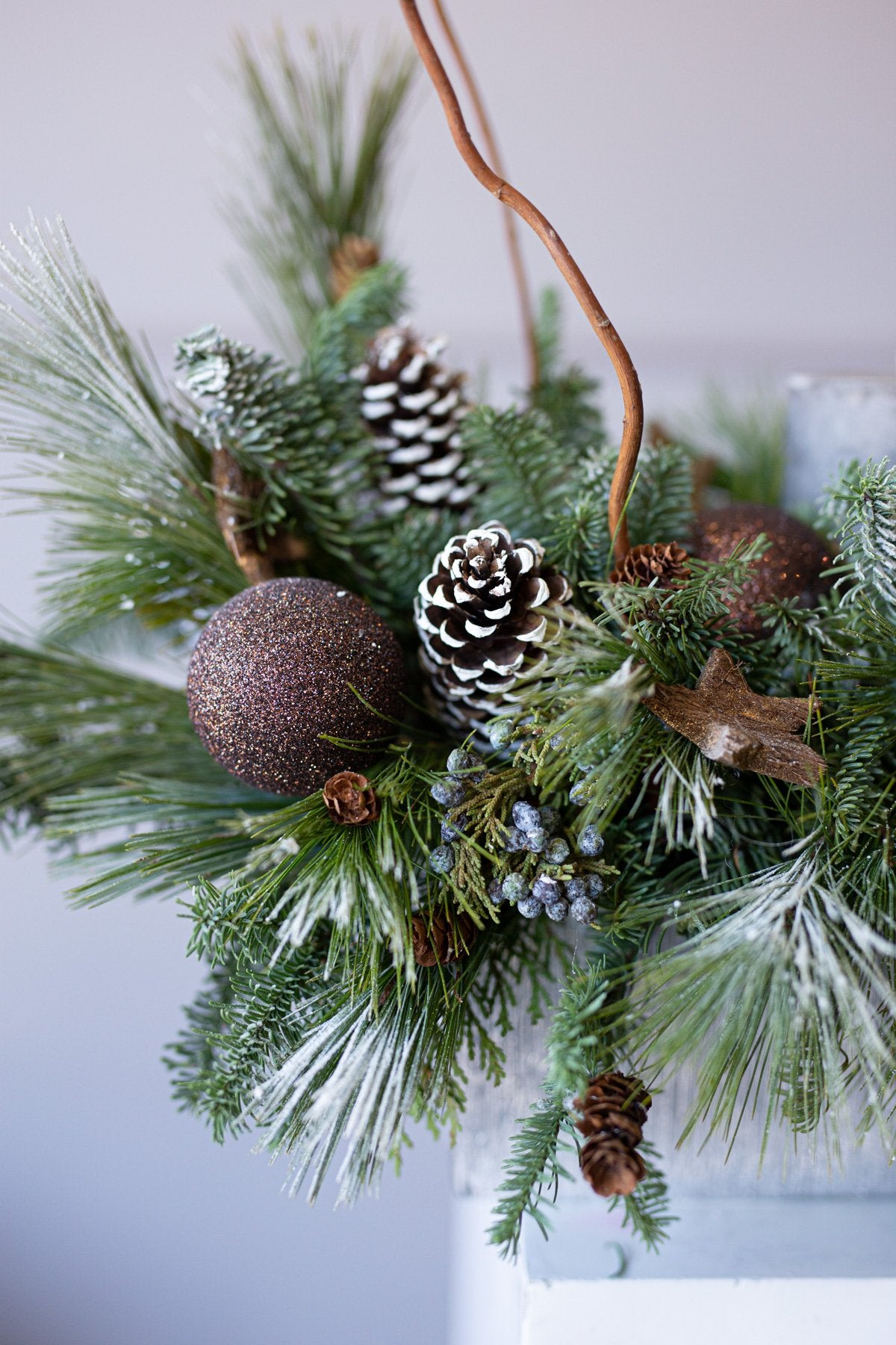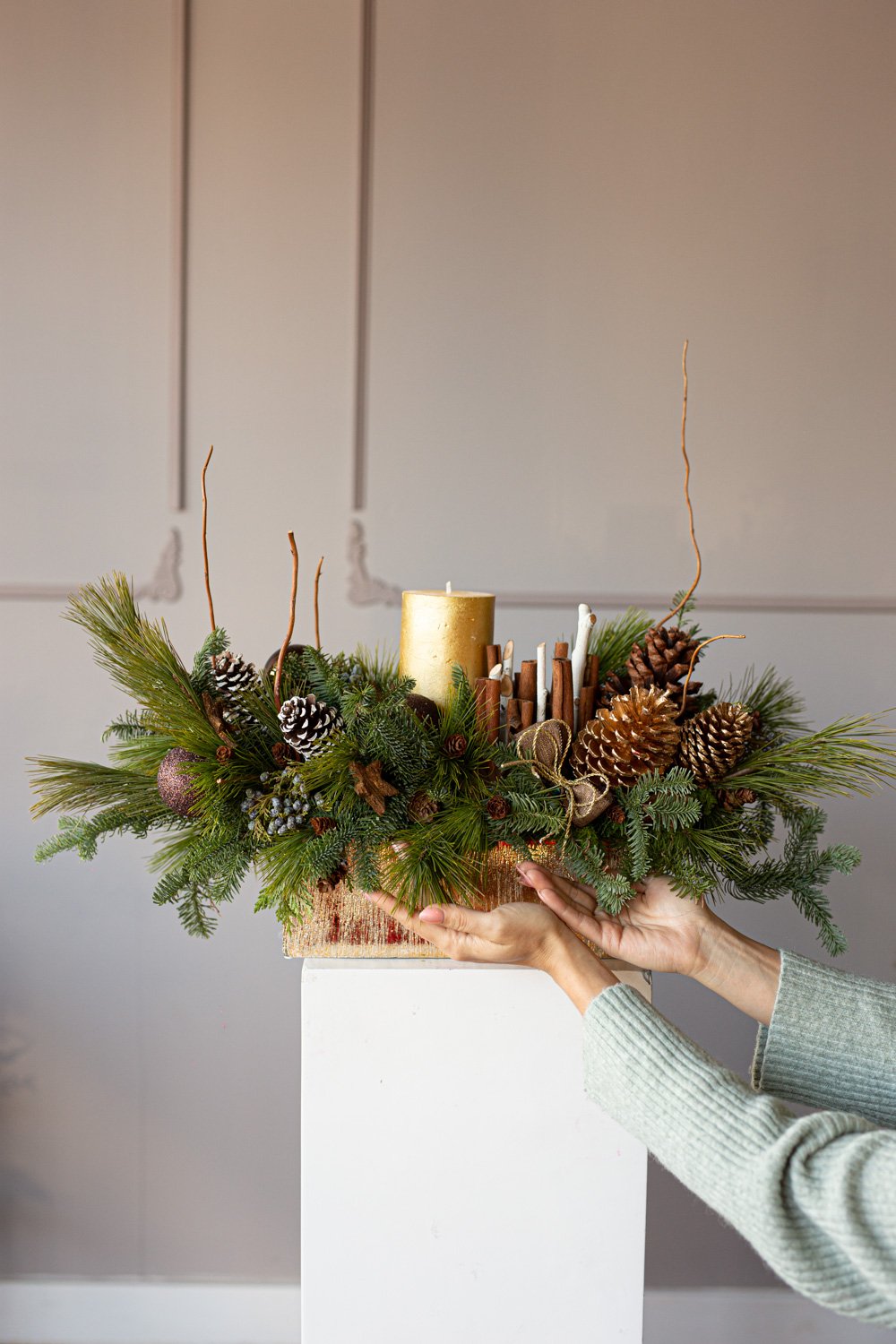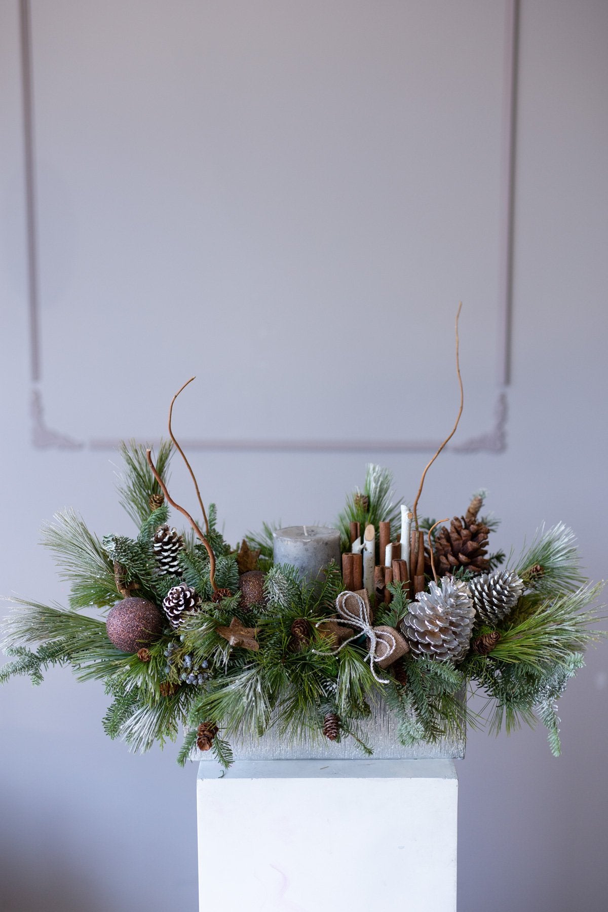 Holiday centerpiece with pine, noble pine, cinnamon sticks, and a wax candle.
