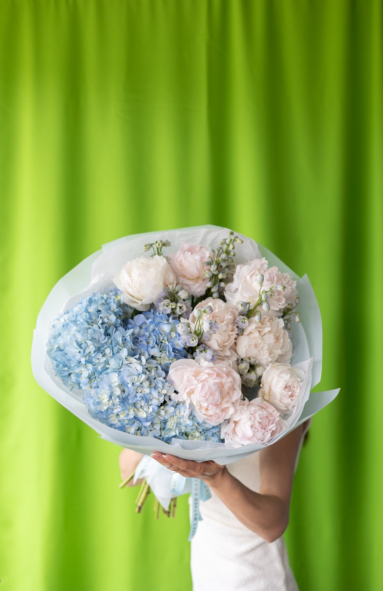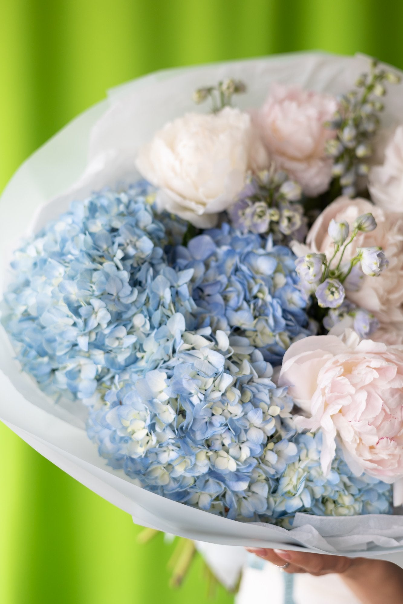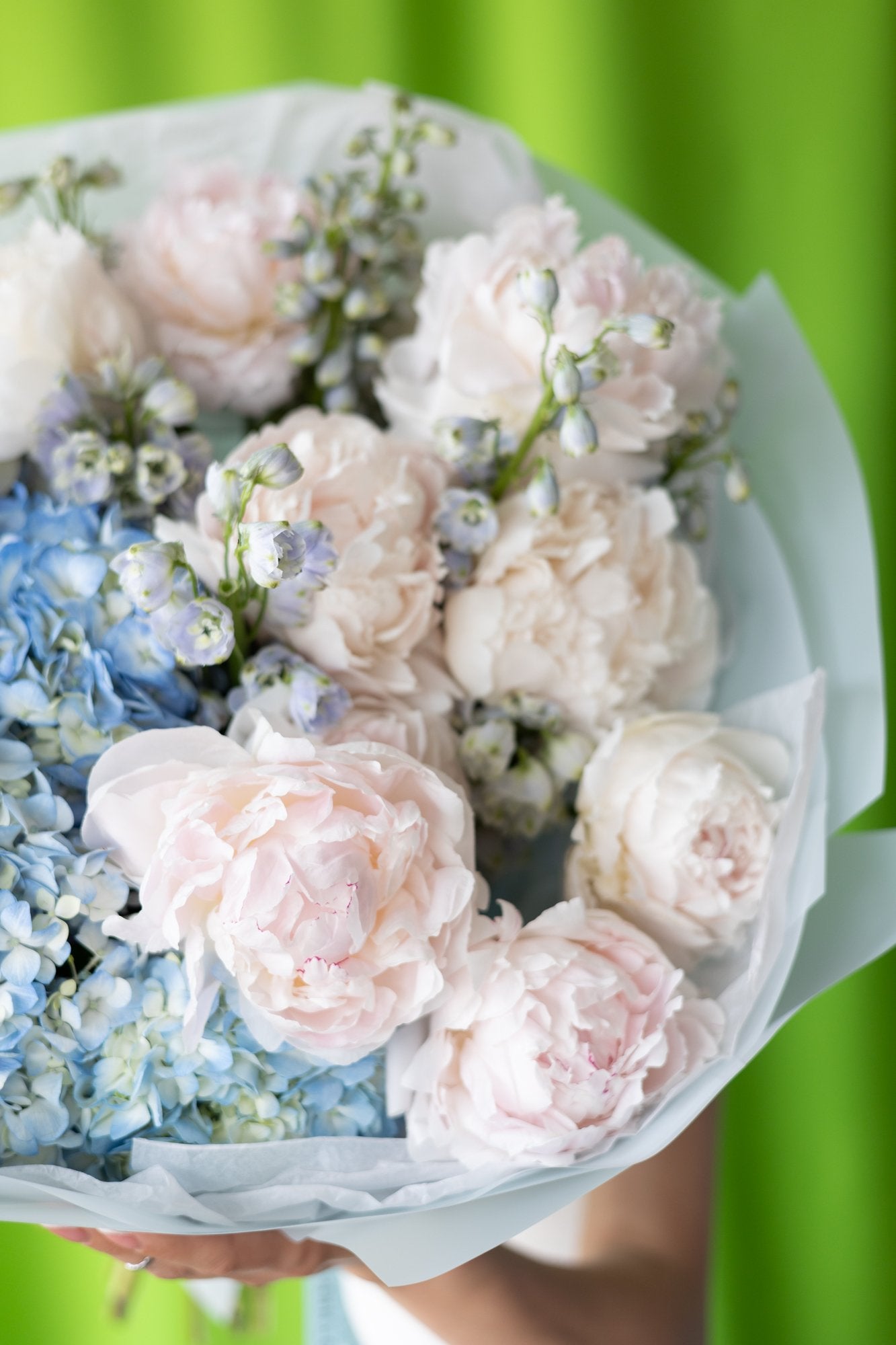 Mix of peonies, hydrangeas, and delphinium