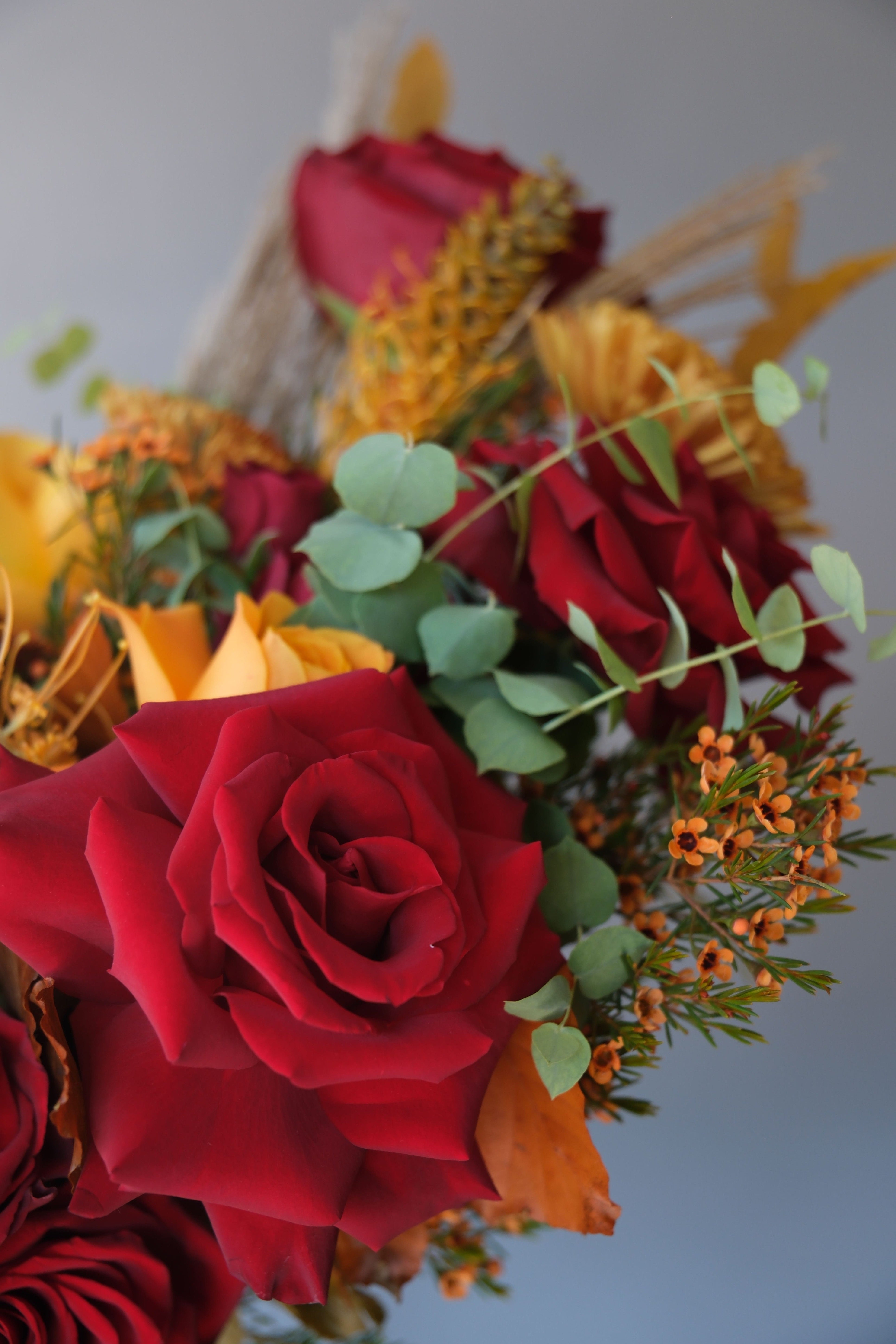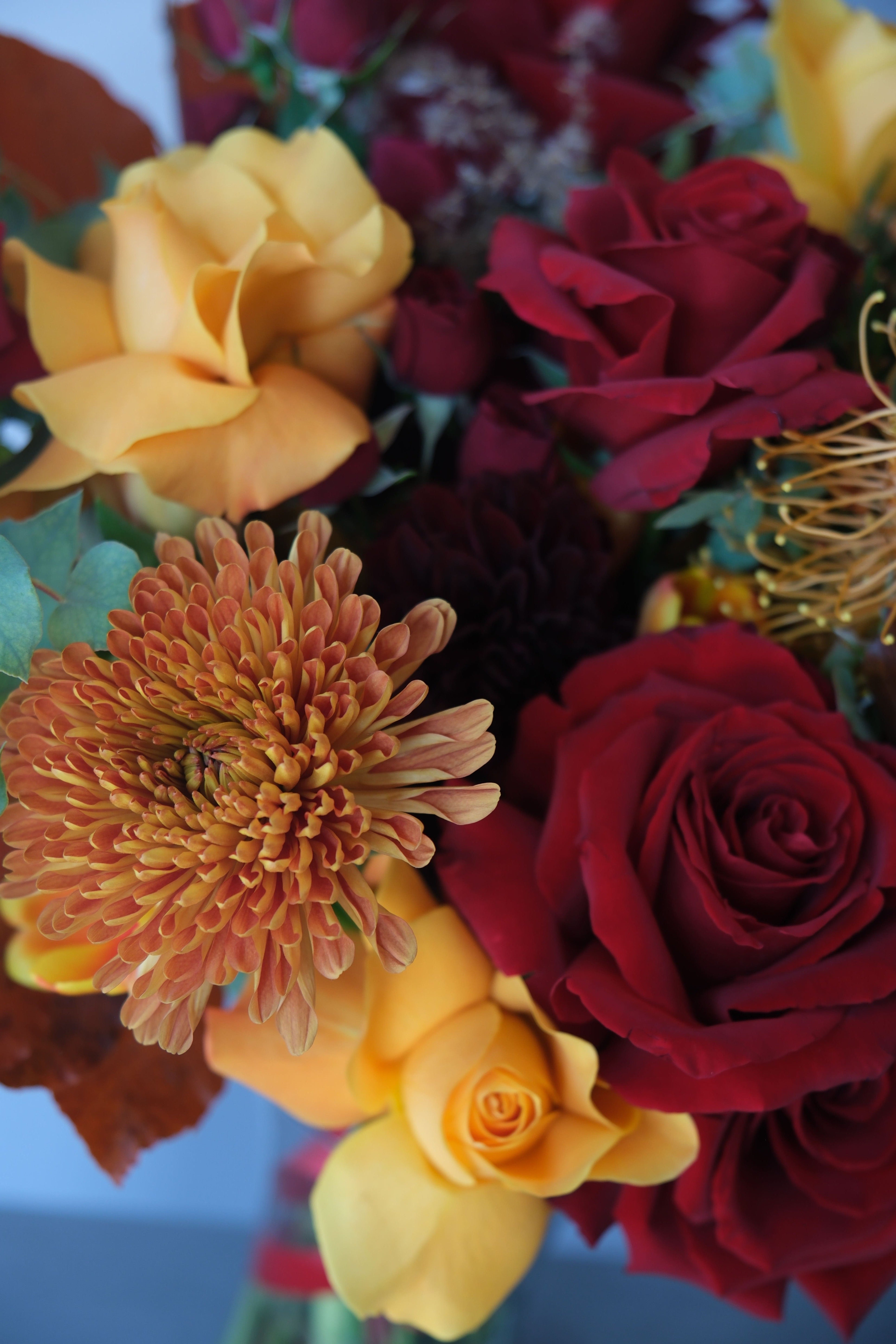 A vibrant and joyful arrangement in orange and pink tones. Delicate scabiosa, romantic hot pink and Free Spirit roses, and playful decorative chamomile are paired with textured leucadendron, burgundy reed, spruce-like foliage, and hornbeam leaves. Touches of ornamental greenery complete this lush, modern composition.