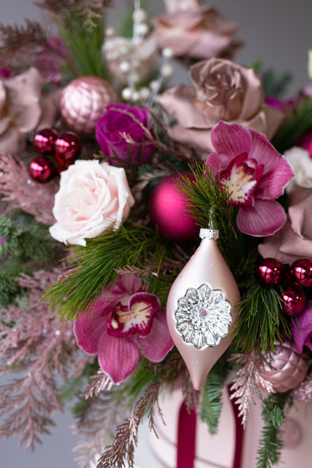 Floral arrangement in a box with pine, seasonal flowers, and the ornaments.