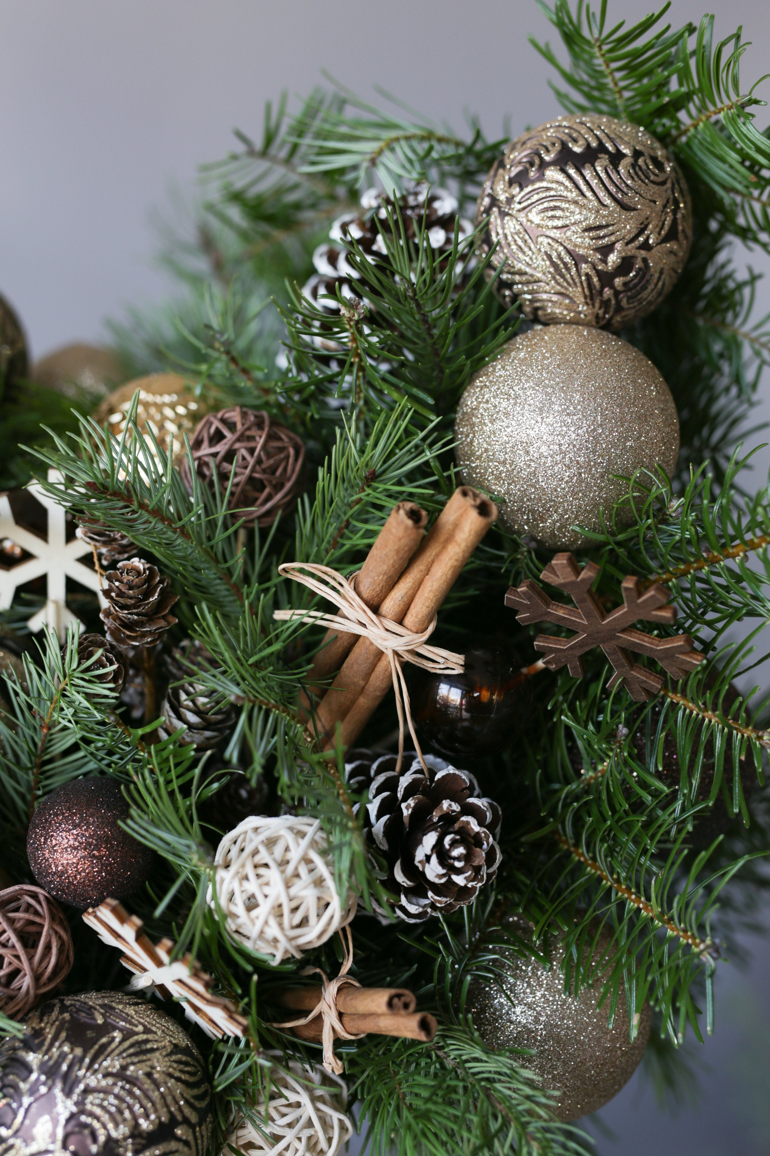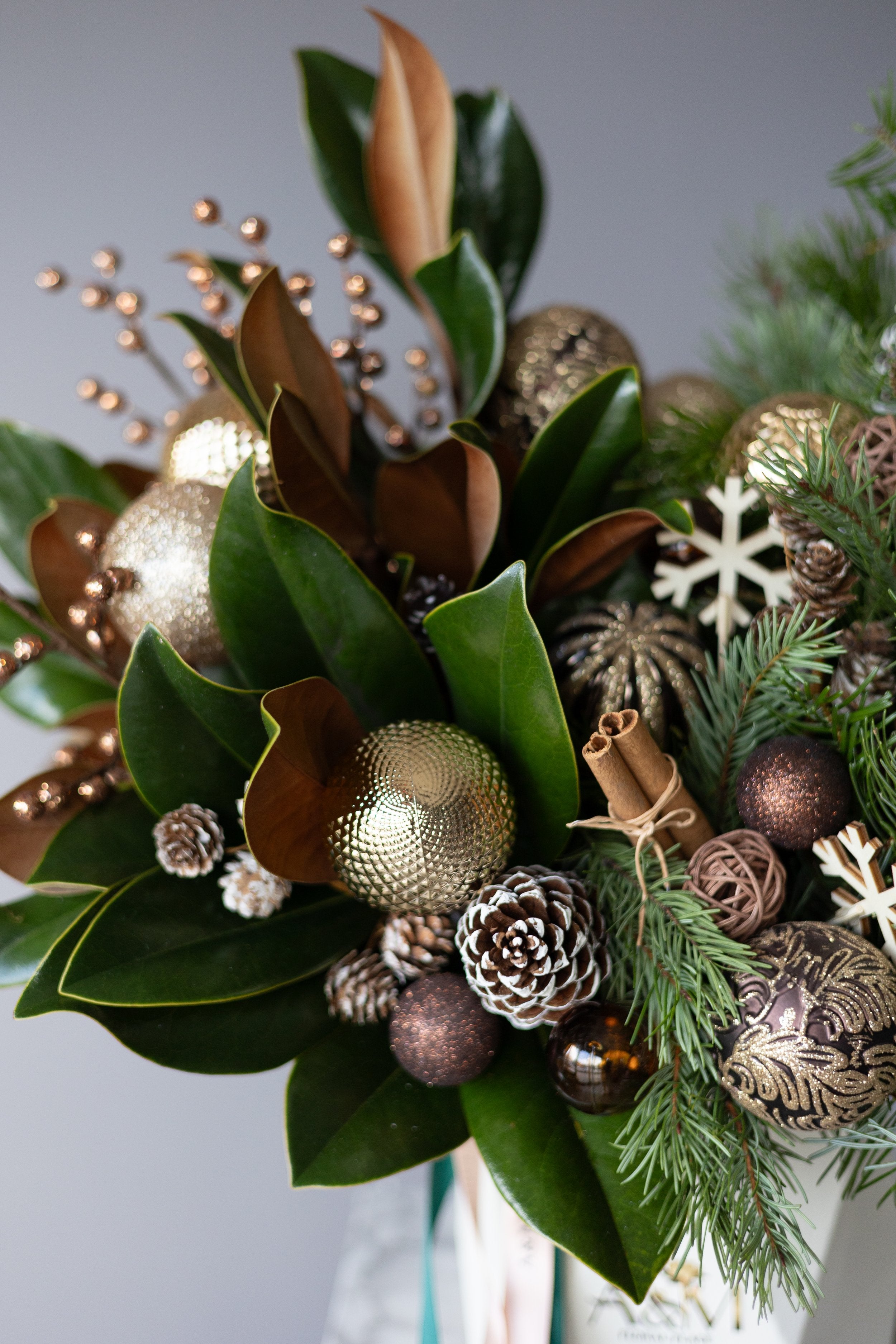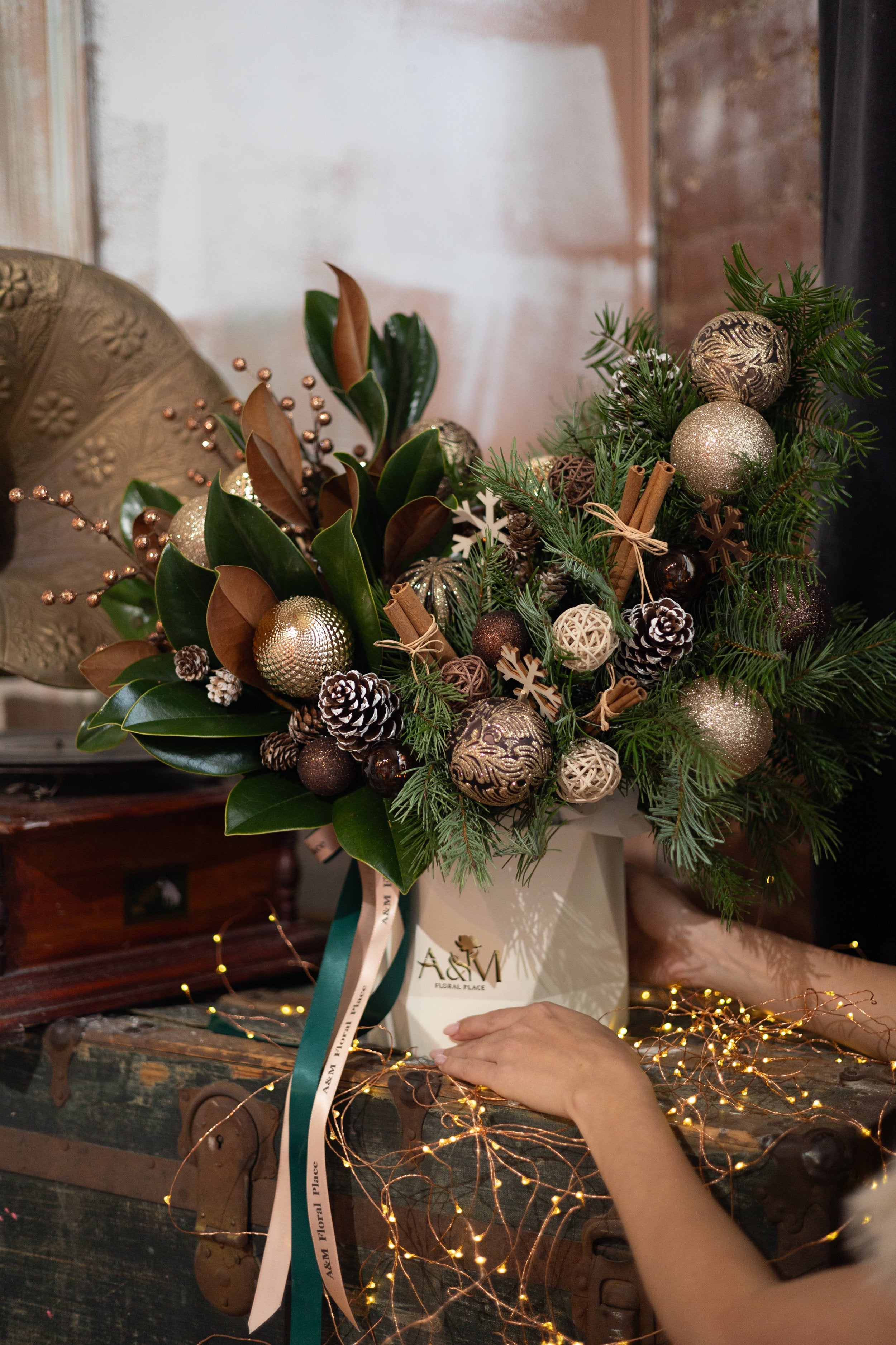 Floral arrangement in a box with flowers, pine, noble pine, and the ornaments.