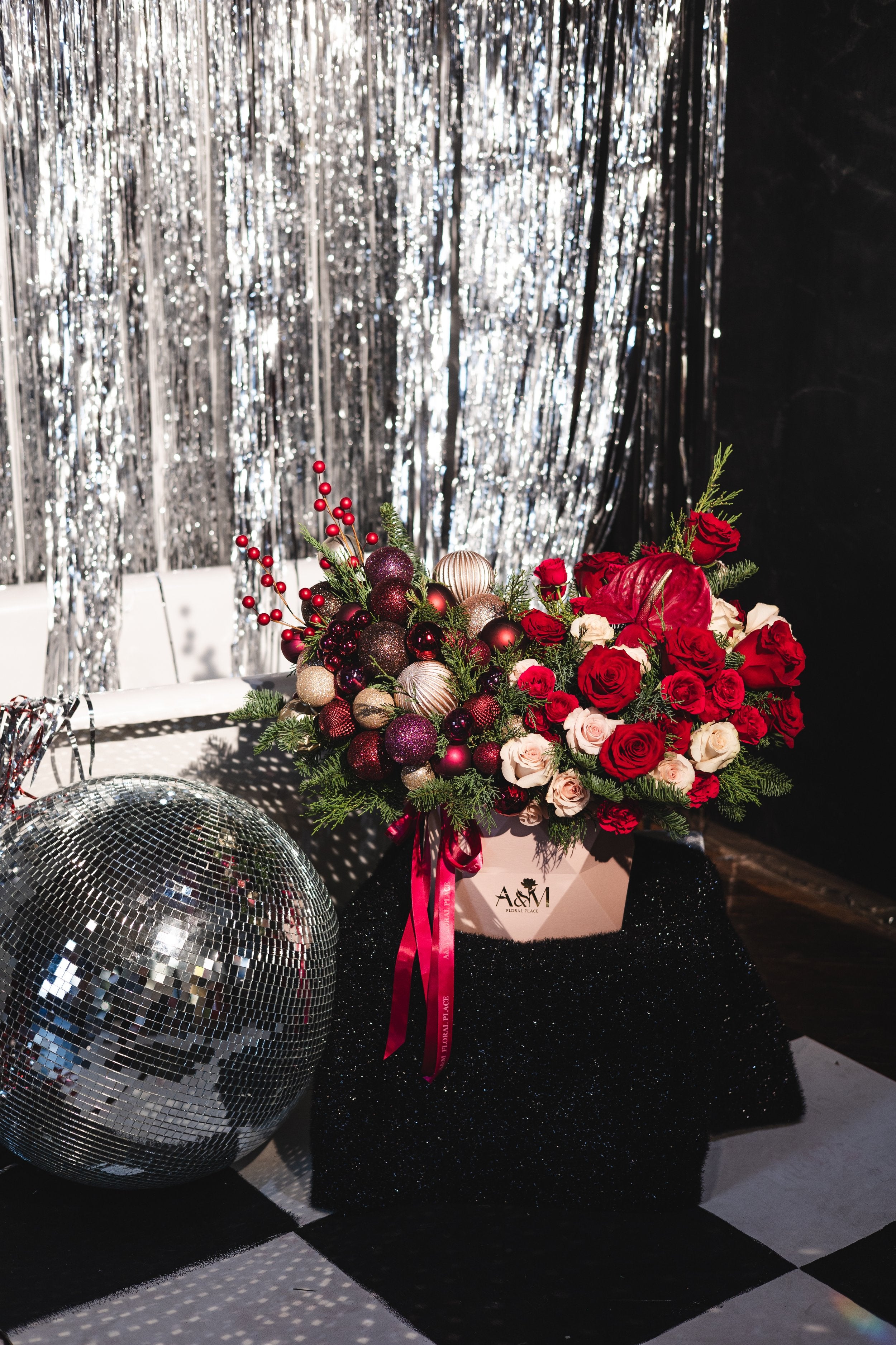 Floral arrangement in a box with flowers, pine, noble pine, and the ornaments.