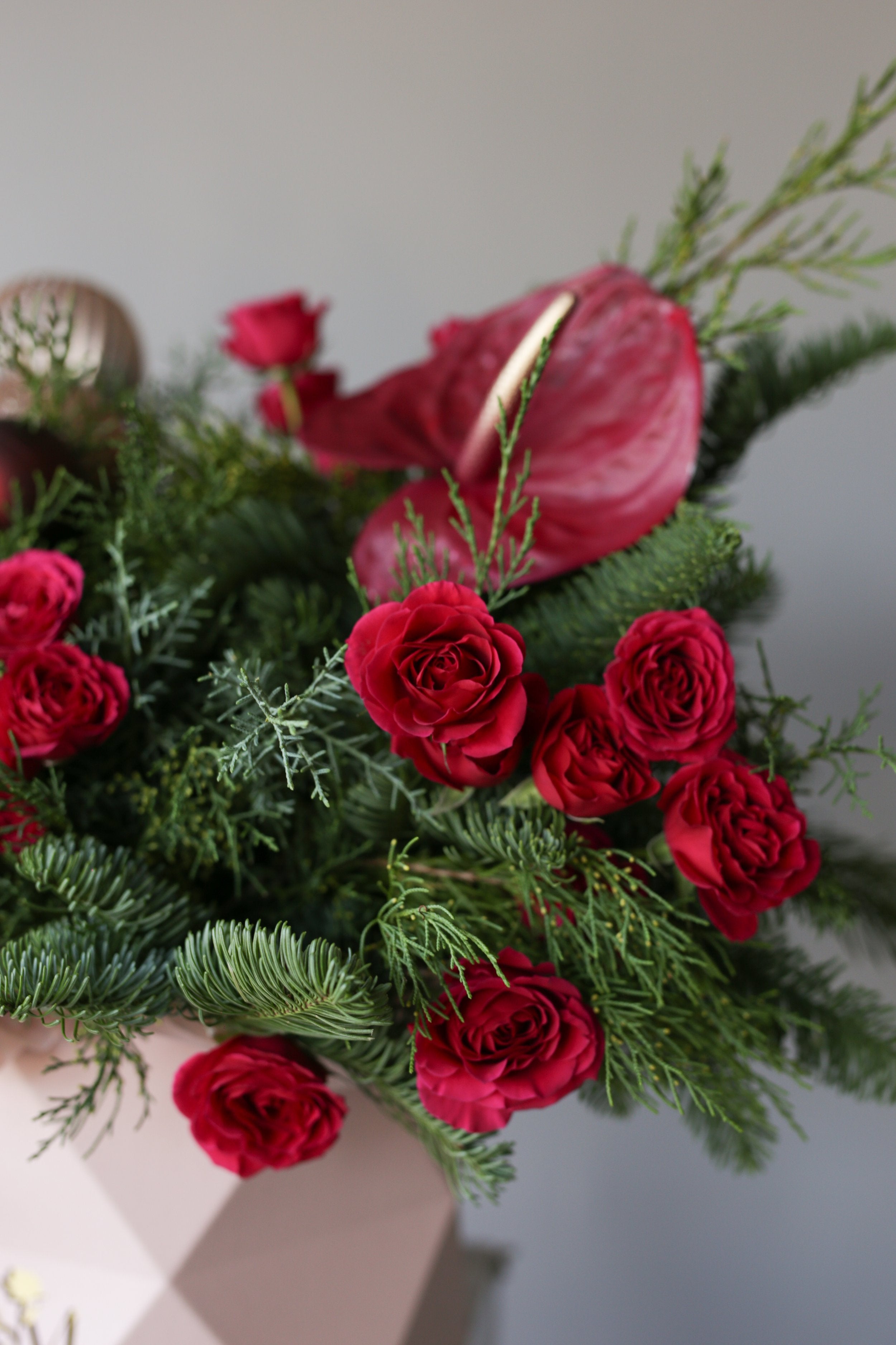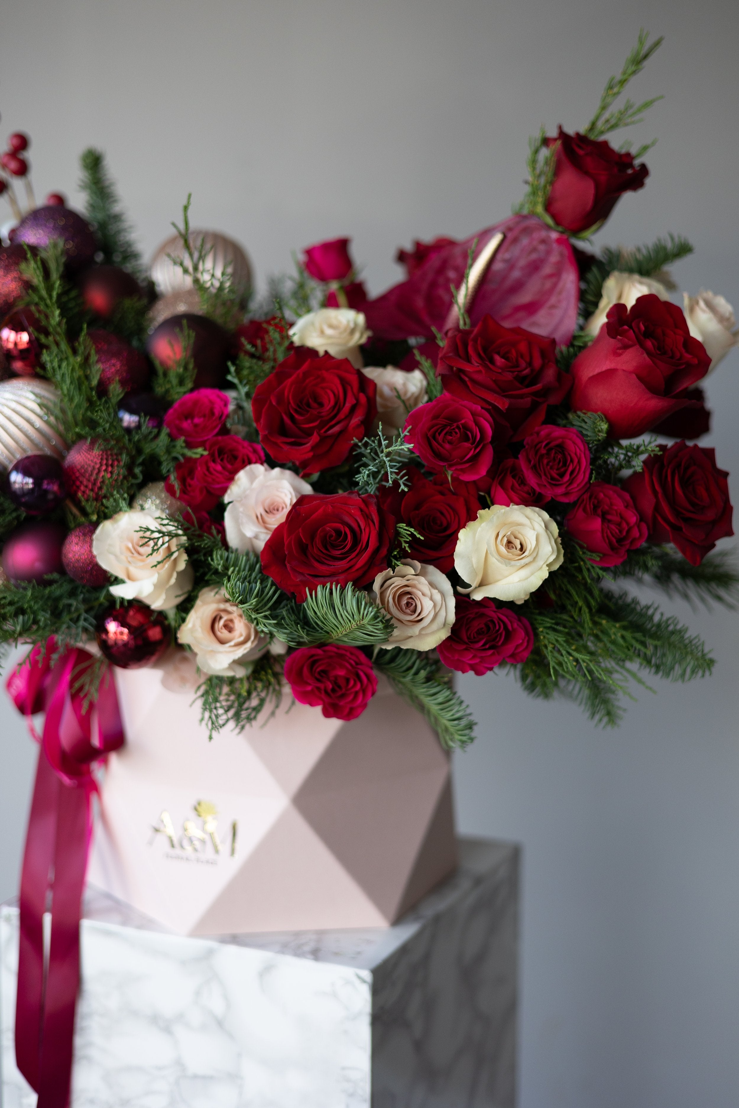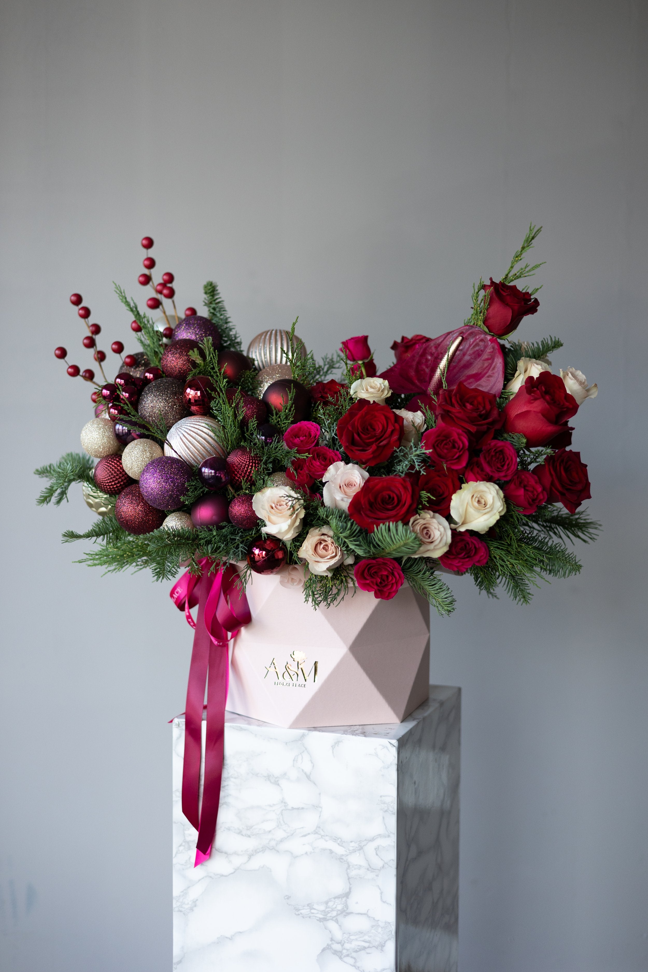 Order Christmas Flowers in NYC. Cristmas Flower boxes, Christmas tree in New York with same-day delivery to Manhattan, Brooklyn, Queens, Staten Island. Christmas decorations by professional florists: Christmas wreath, Christmas pine, Christmas centerpieces, Mini Christmas Tree.