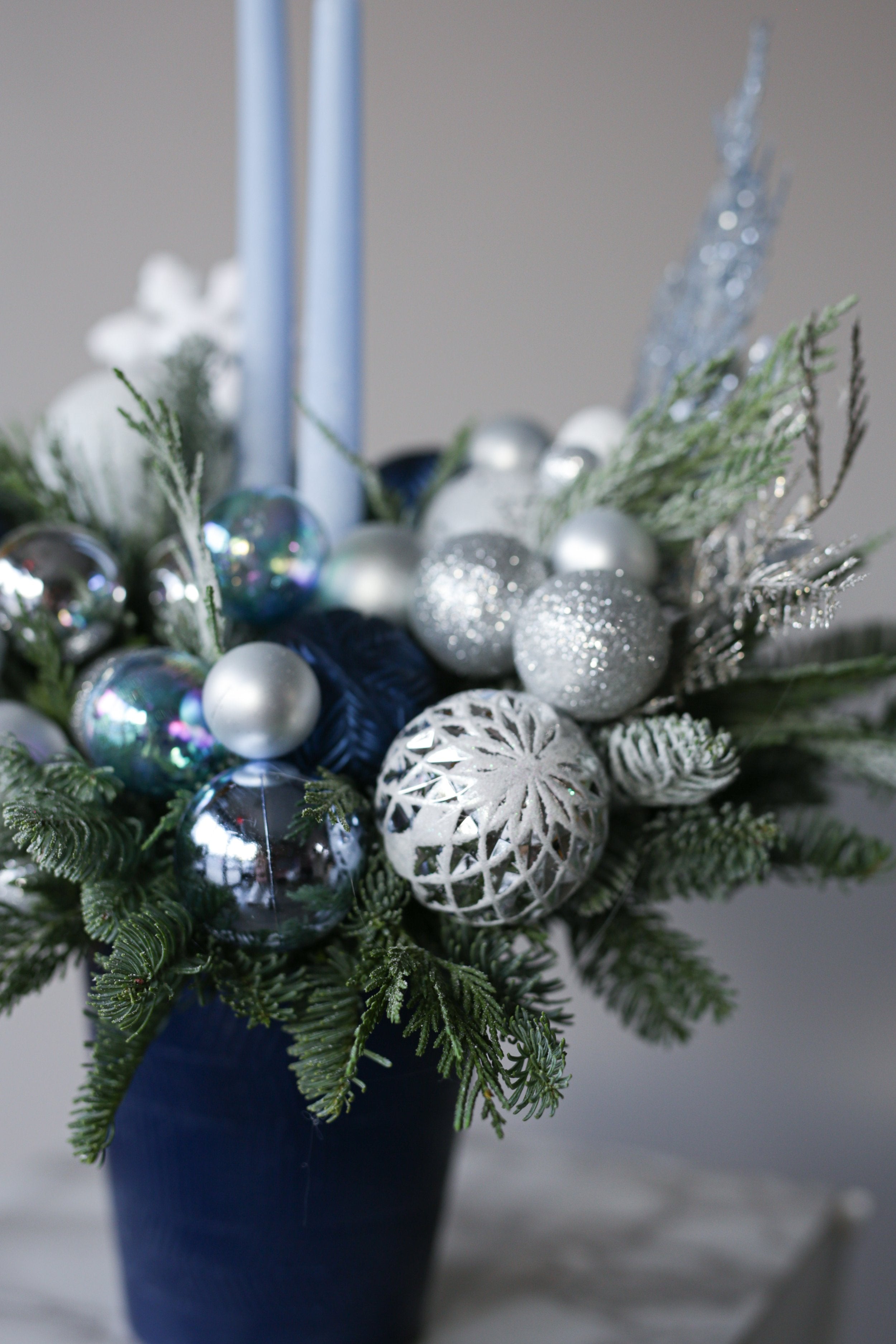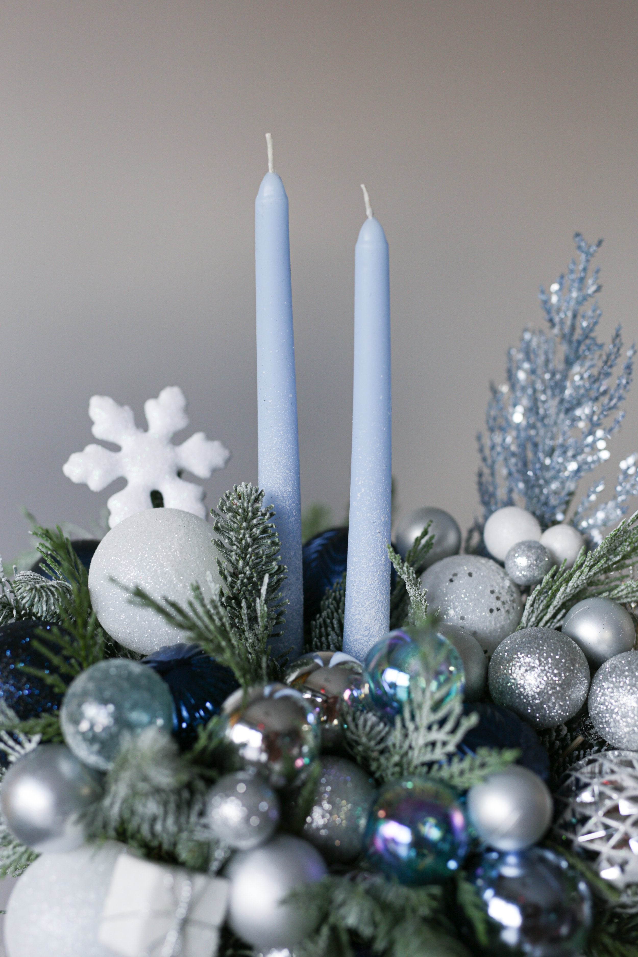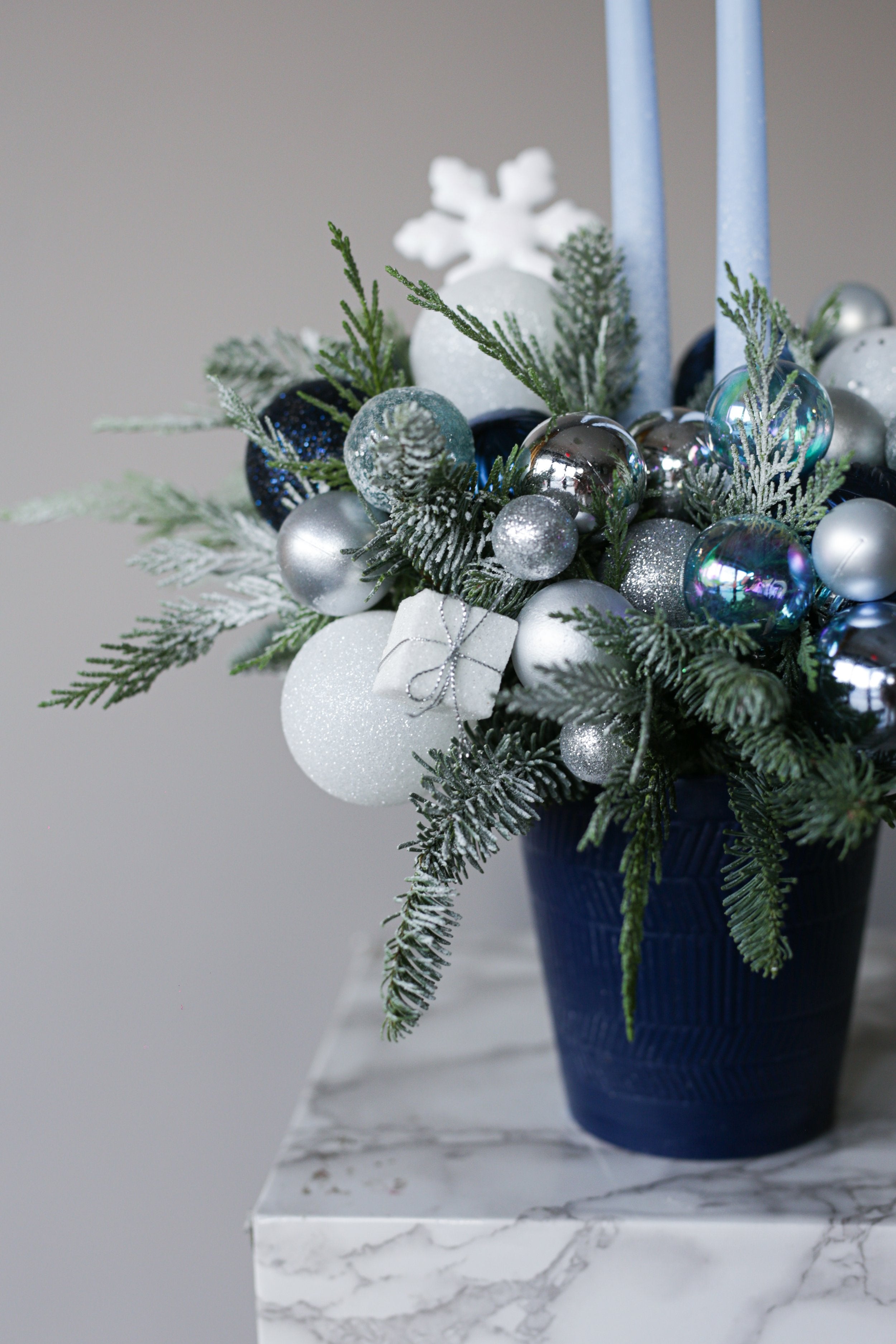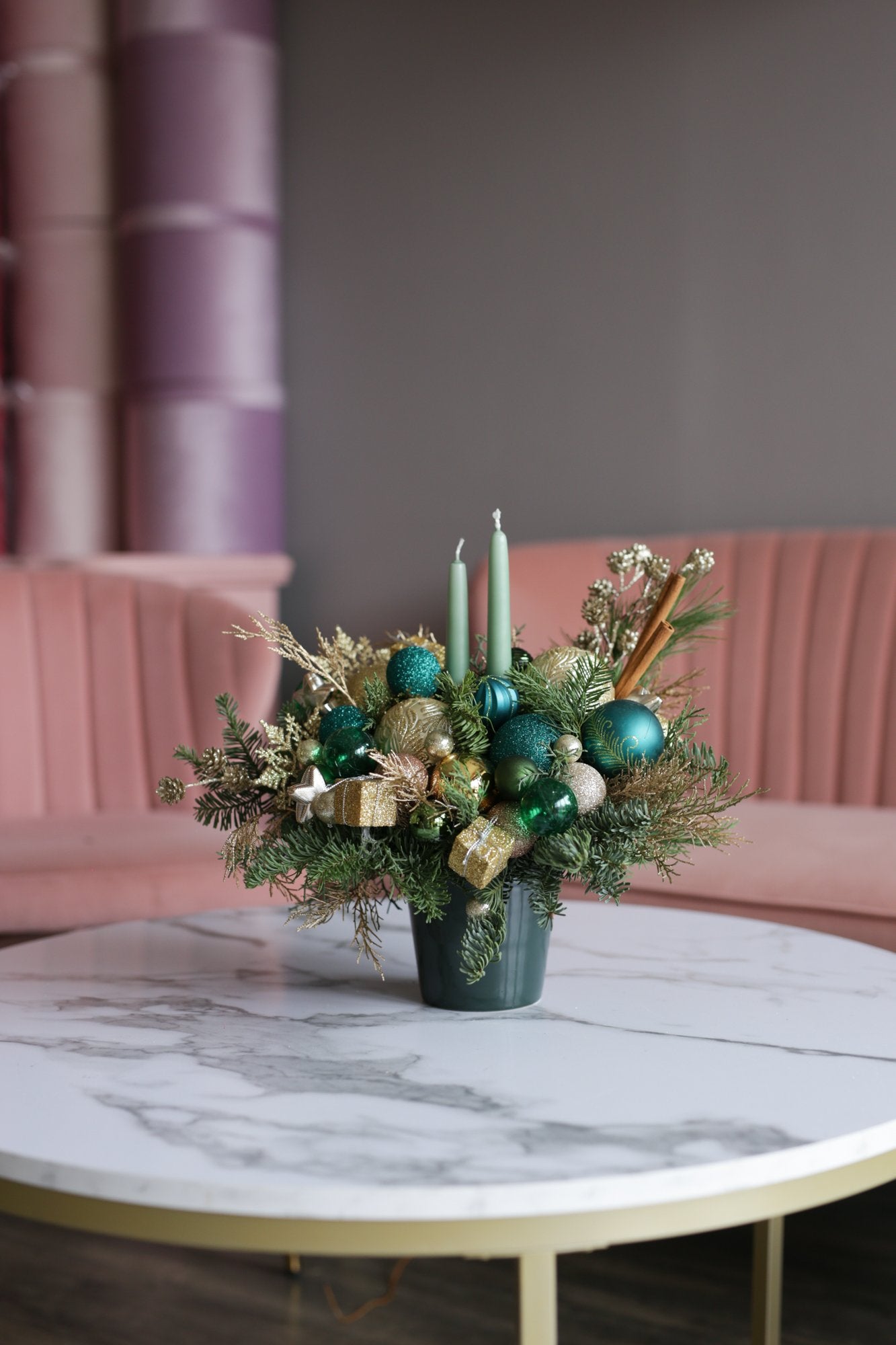 Floral arrangement in a ceramic box with pine, candles, and ornaments.