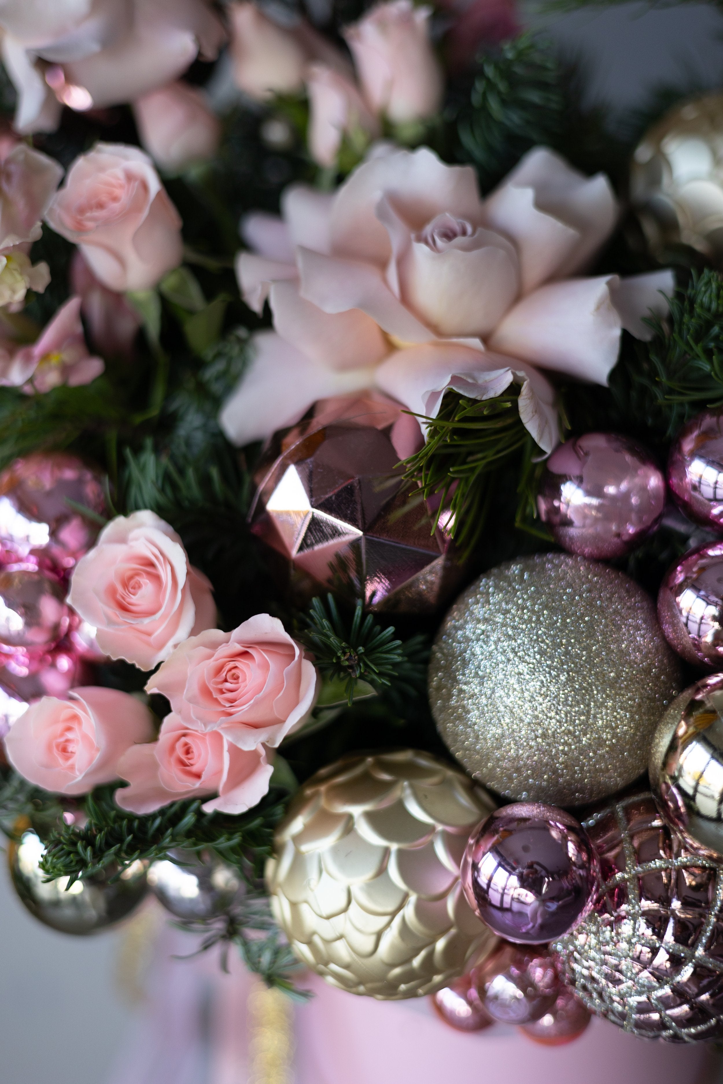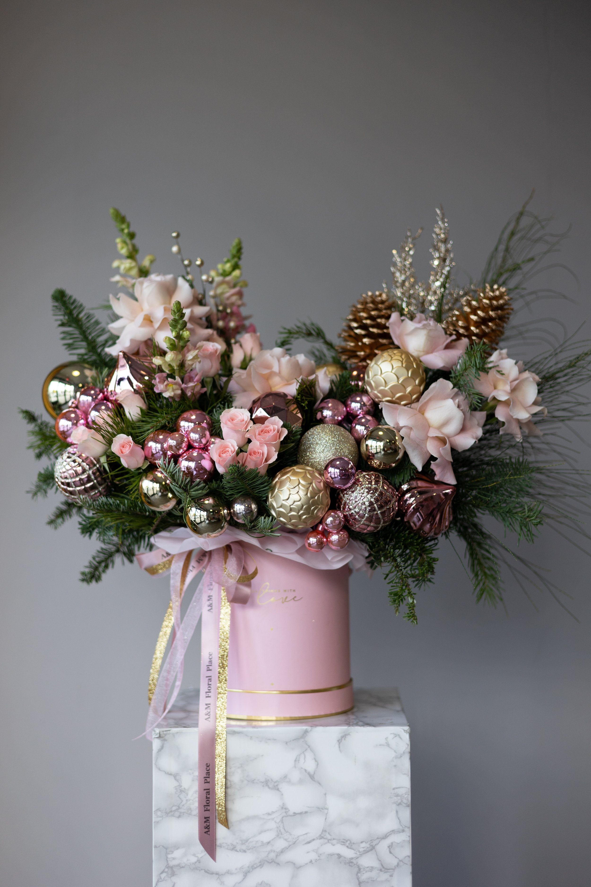 Floral arrangement in a box with flowers, pine, noble pine, and the ornaments.