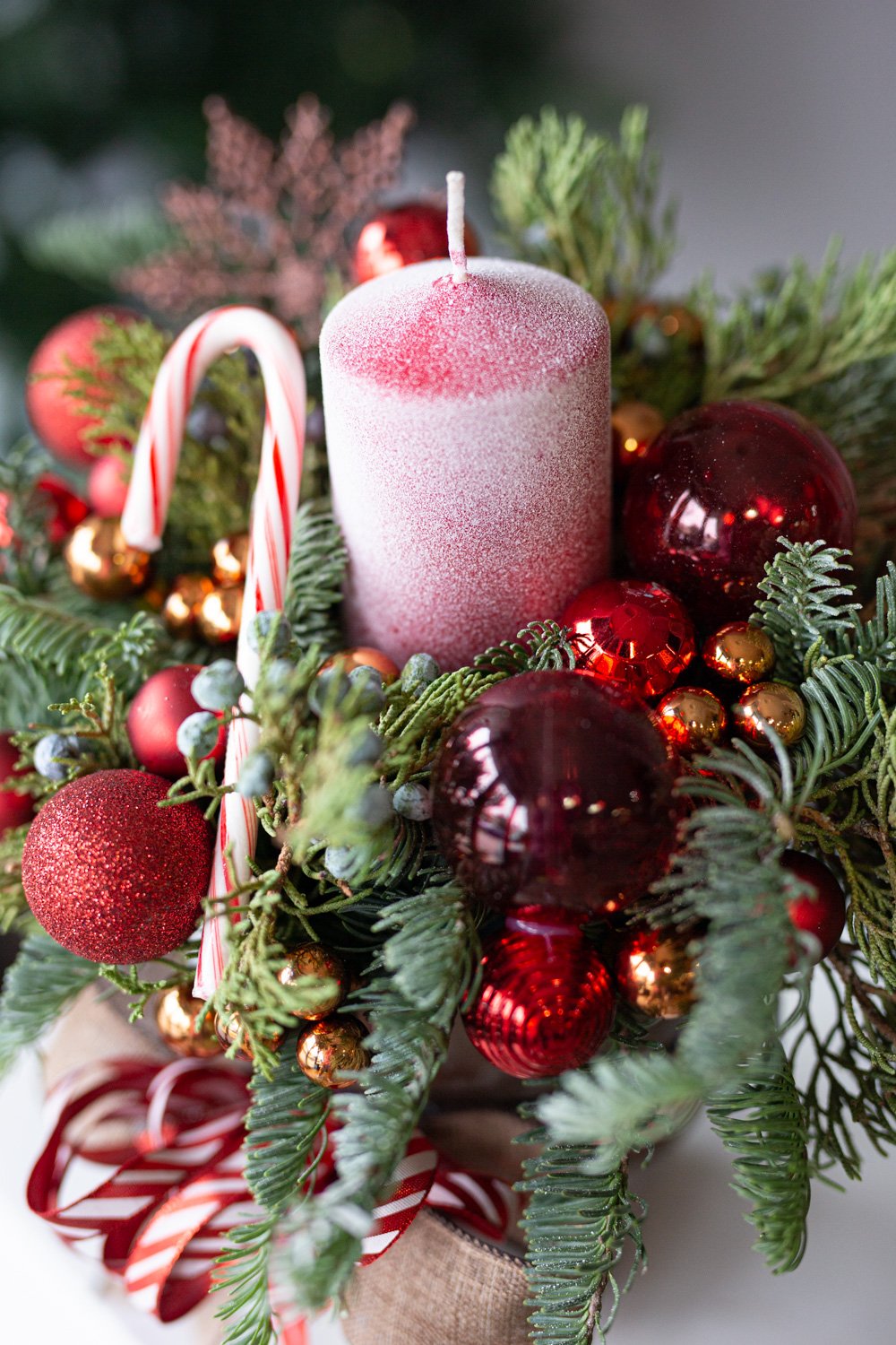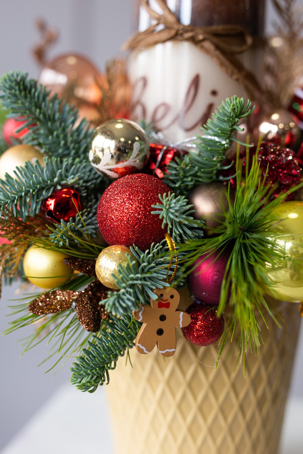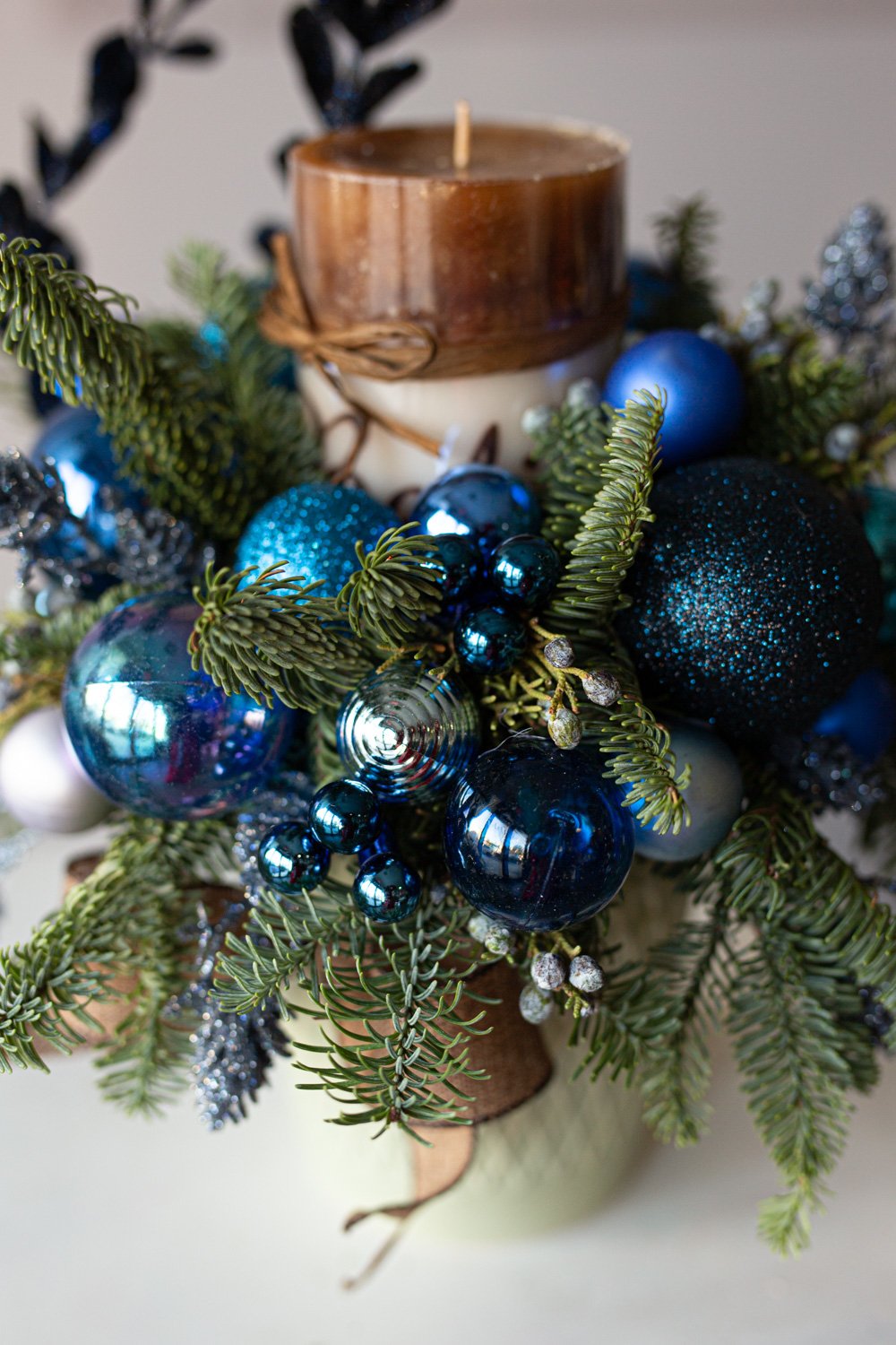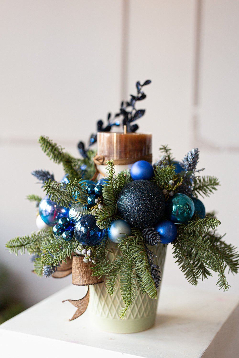 Floral arrangement in a ceramic box with pine, noble pine, candle and the ornaments.