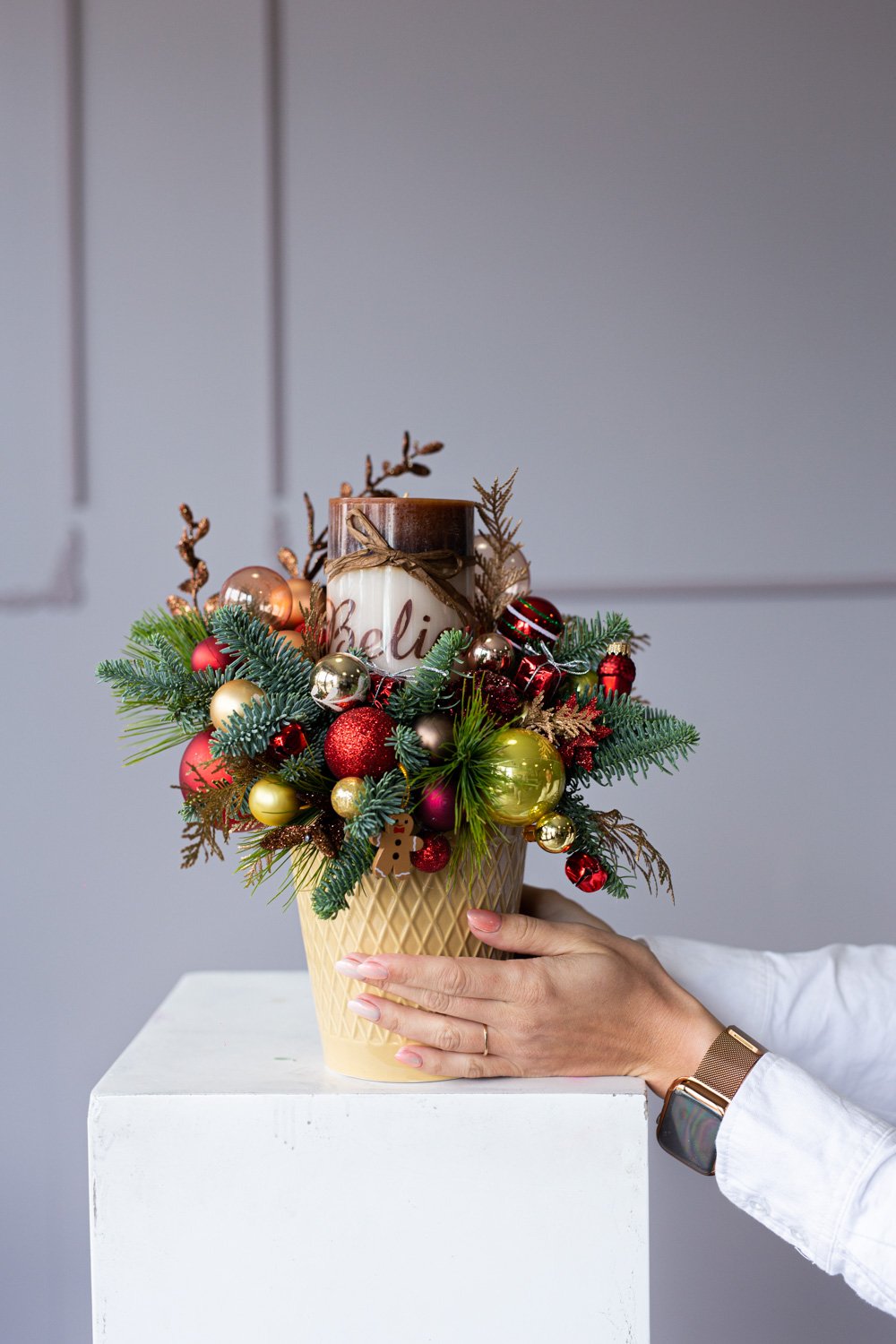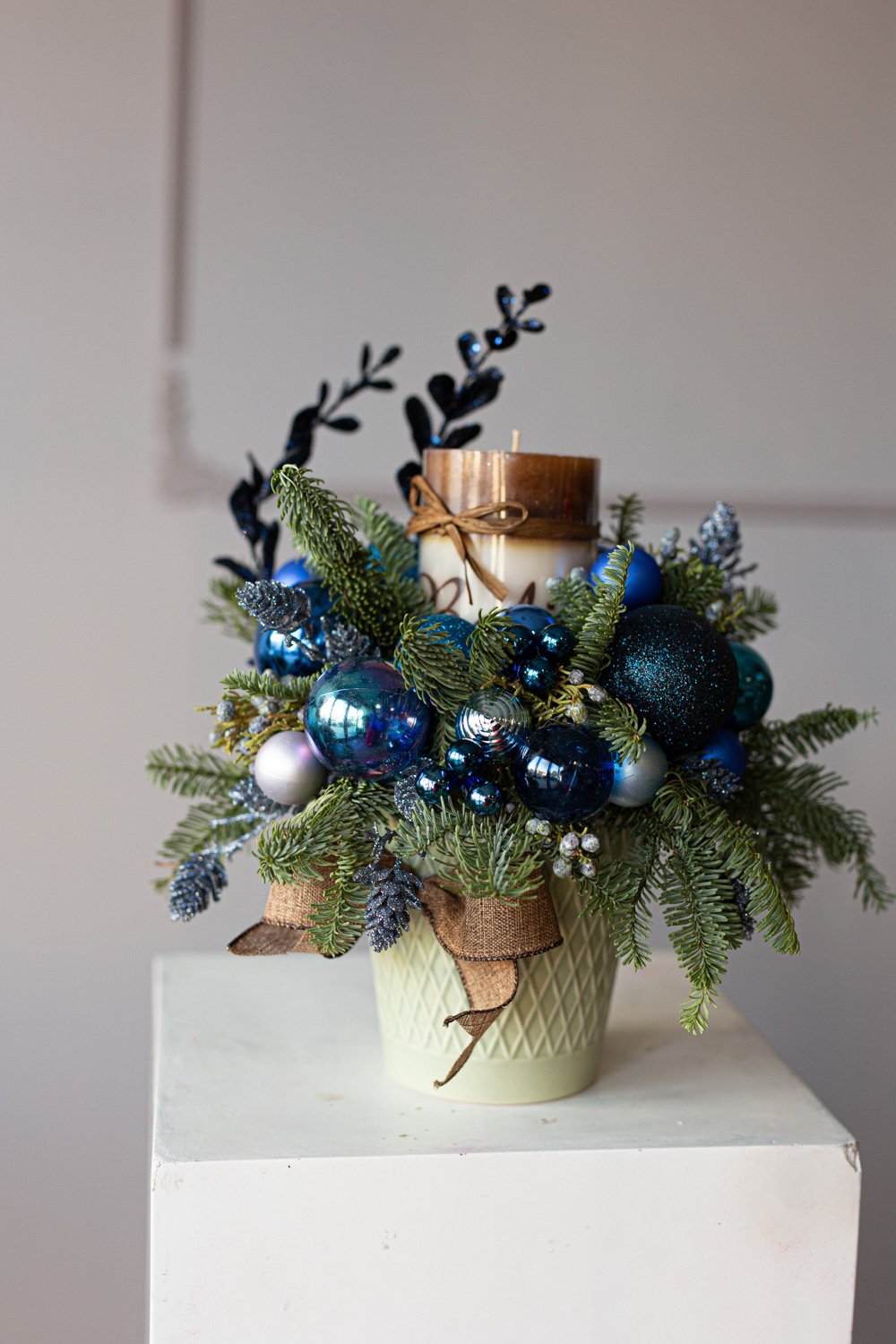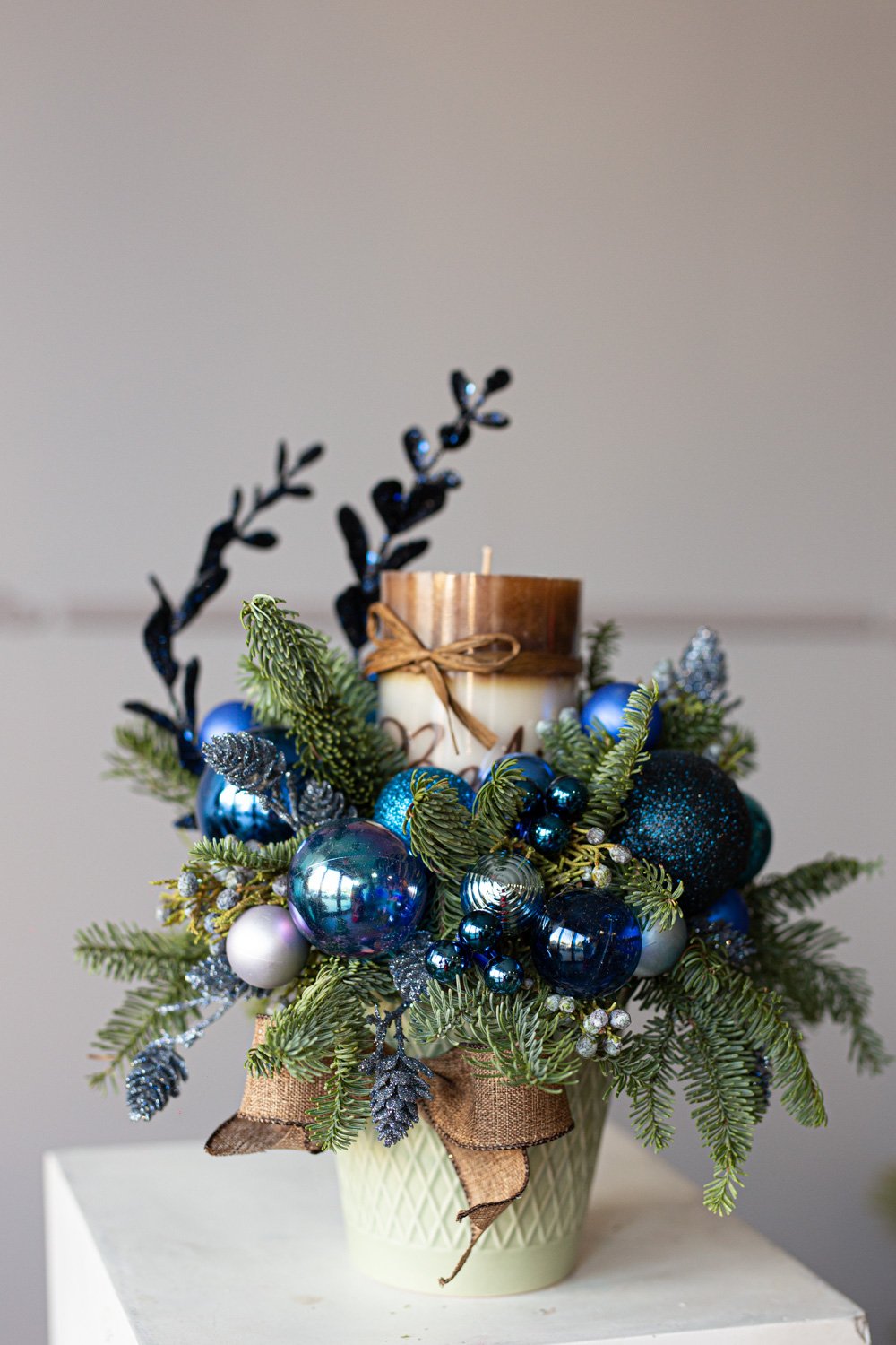 Floral arrangement in a ceramic box with pine, noble pine, candle and the ornaments.