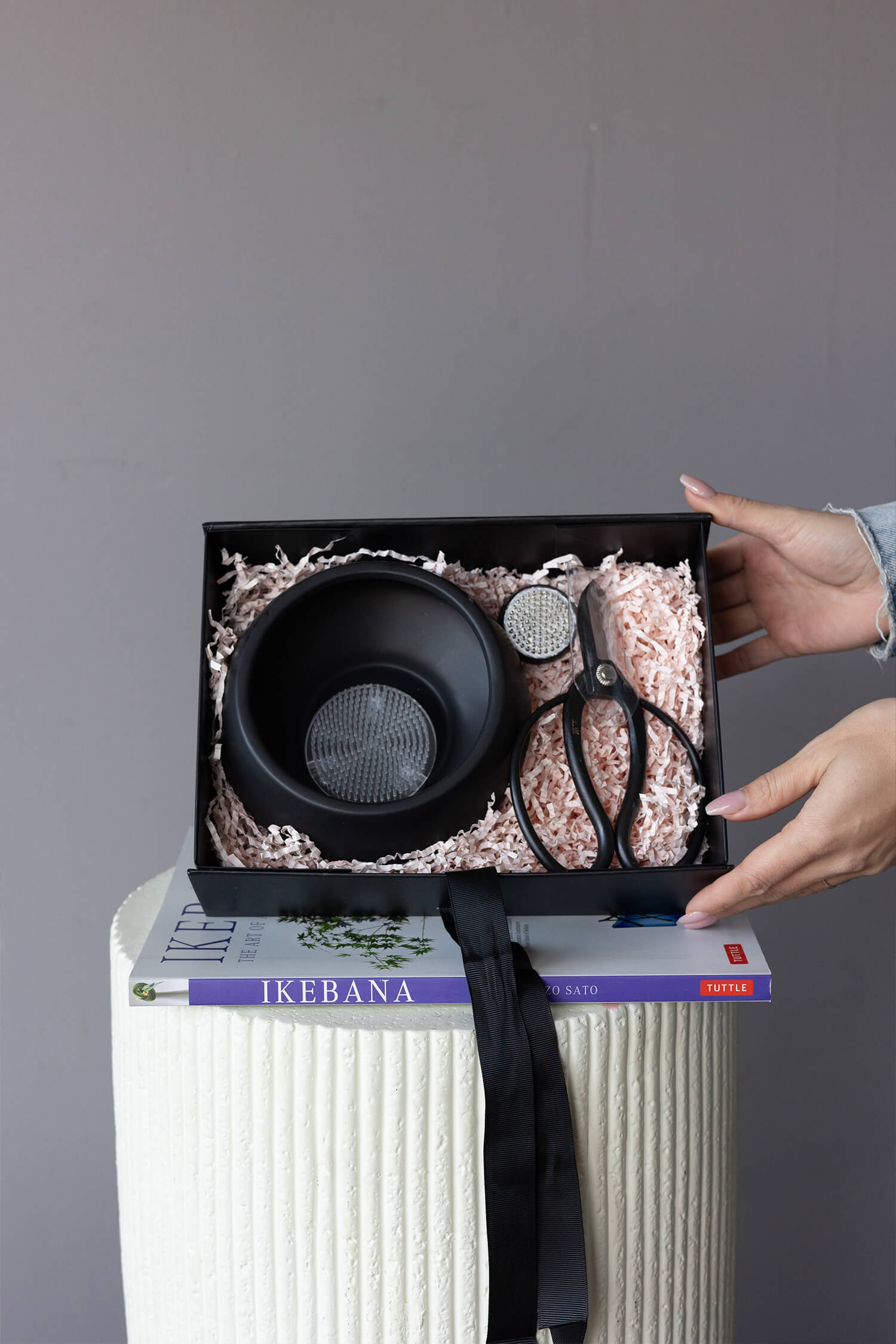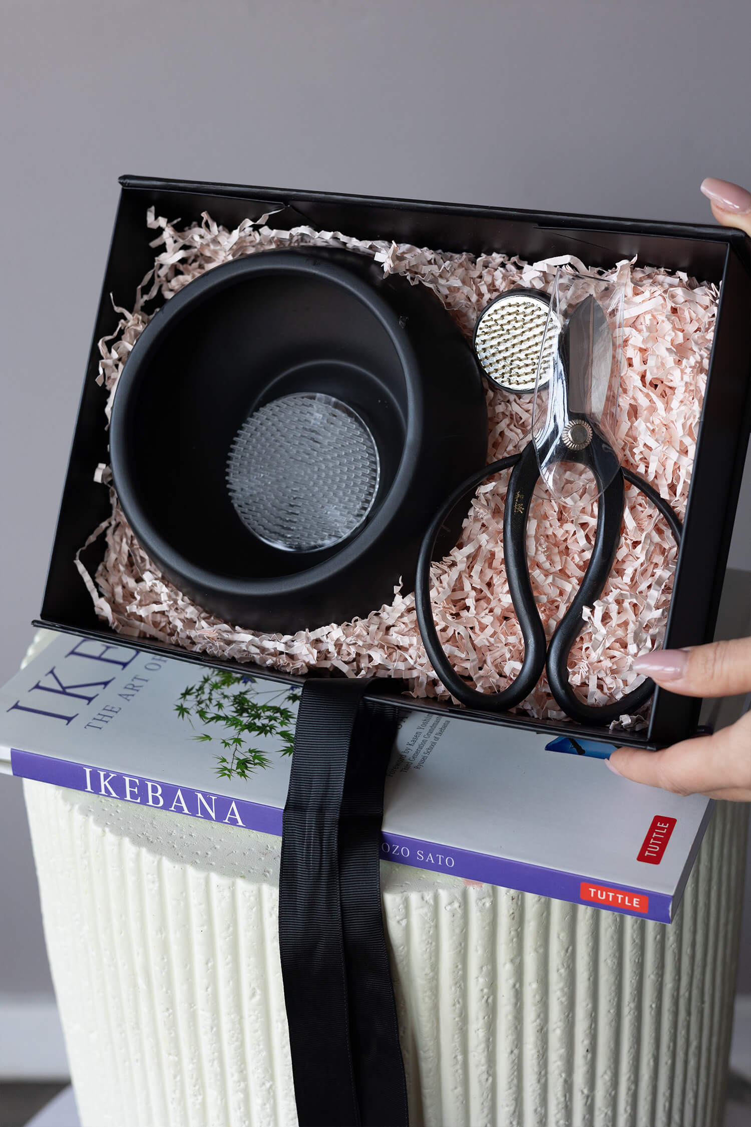 The Ikebana Set is the perfect kit for creating Japanese flower arrangements right at home. It includes a Japanese pruning shears for carefully trimming flower stems, a book with lessons on ikebana, a stylish vase, and a kenzan for securing the flowers. Everything you need to create a beautiful arrangement by hand and immerse yourself in the art of Japanese floristry.