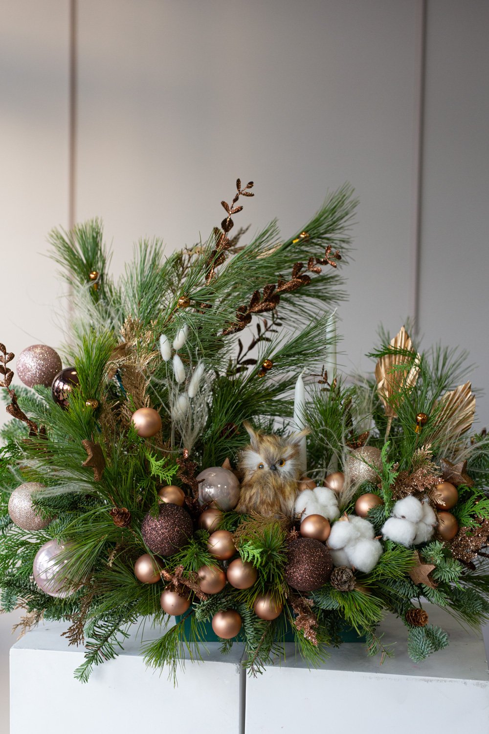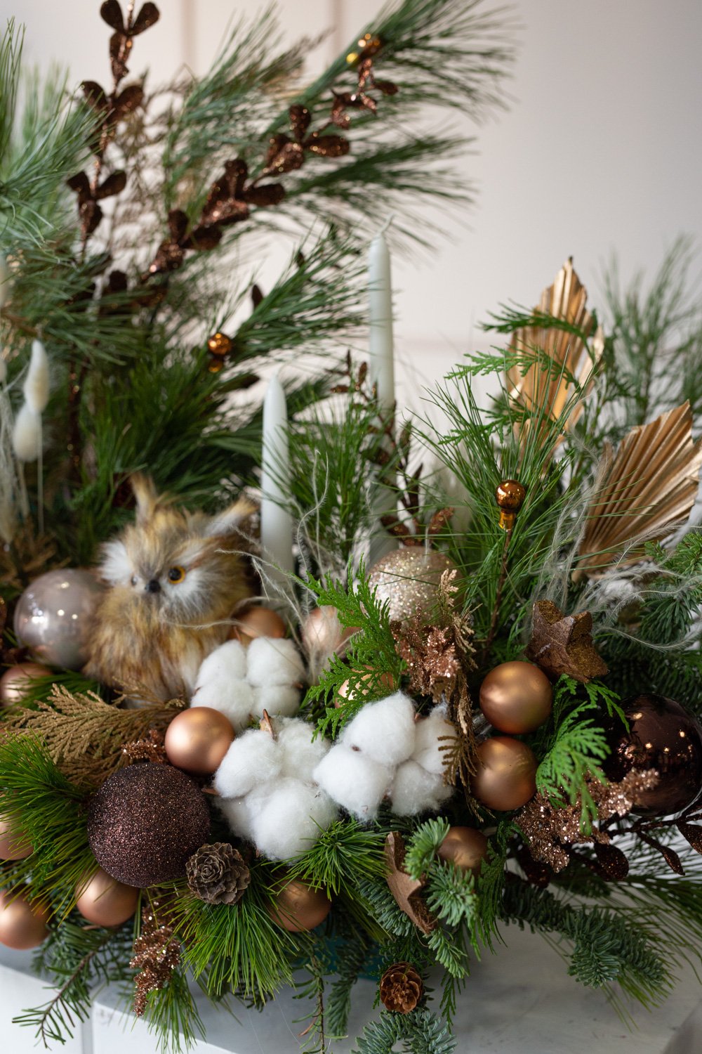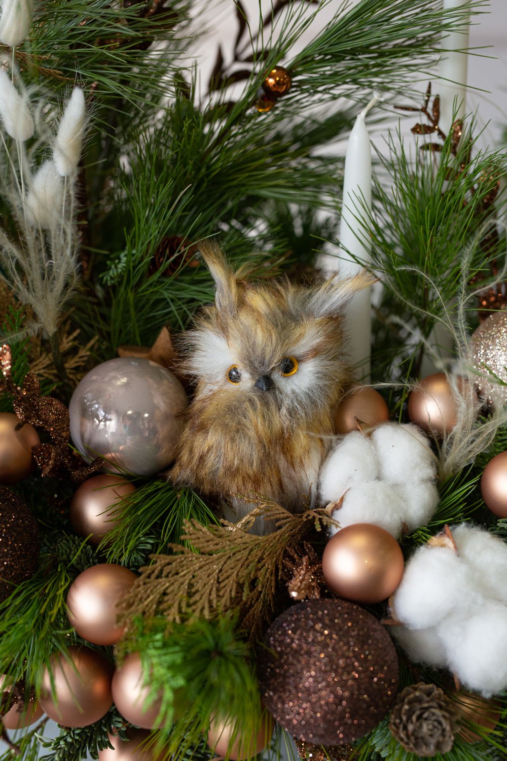 Holiday centerpiece with toy Owl and wax candles.