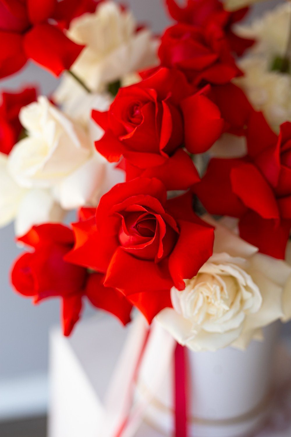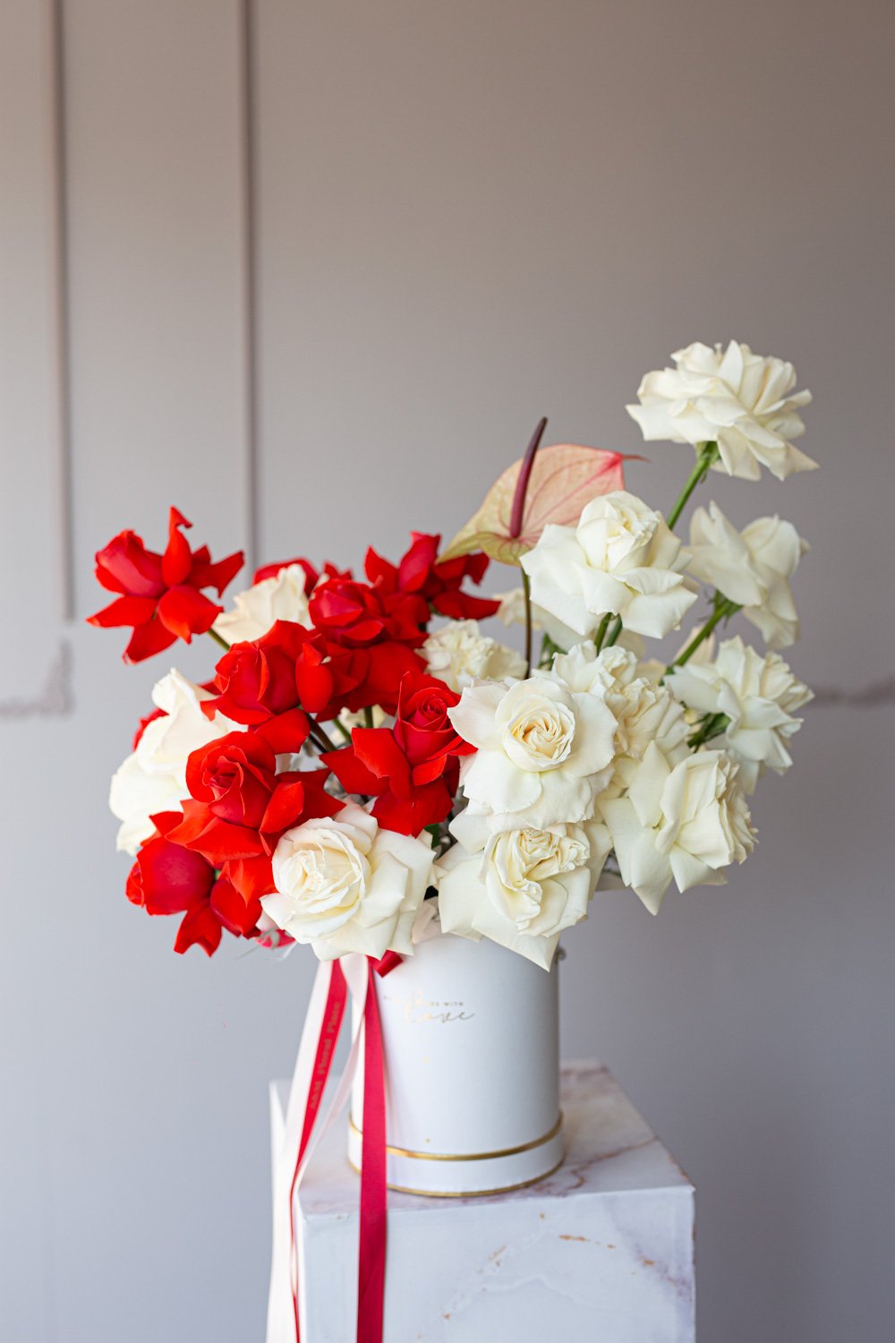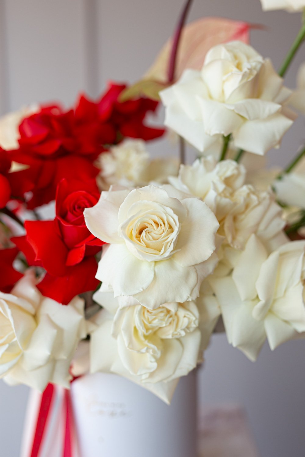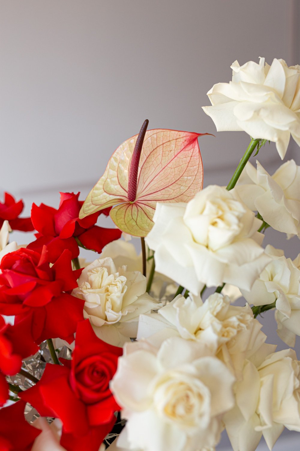 Mix of roses and anthurium in red and white color. On the main photo is a medium size.