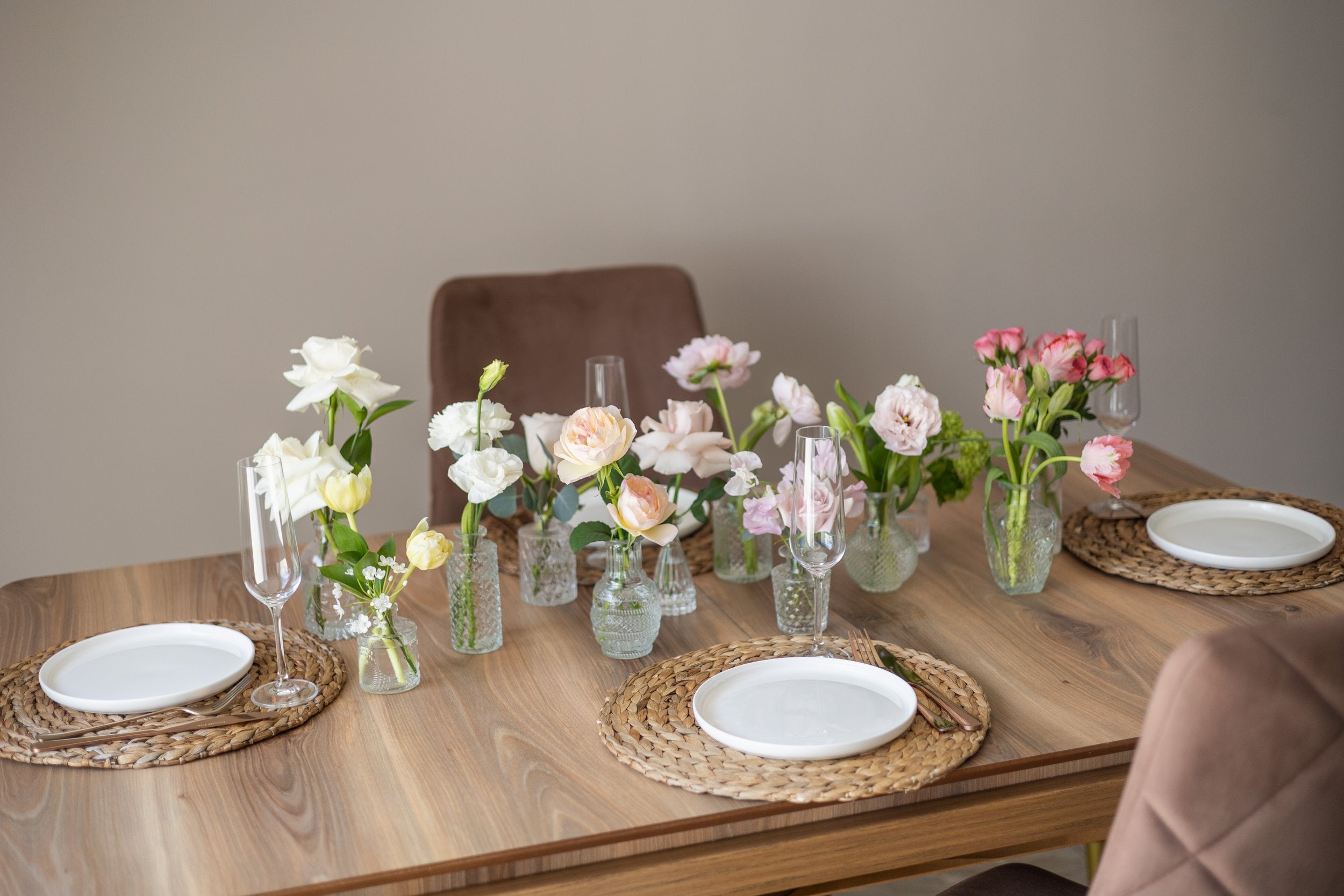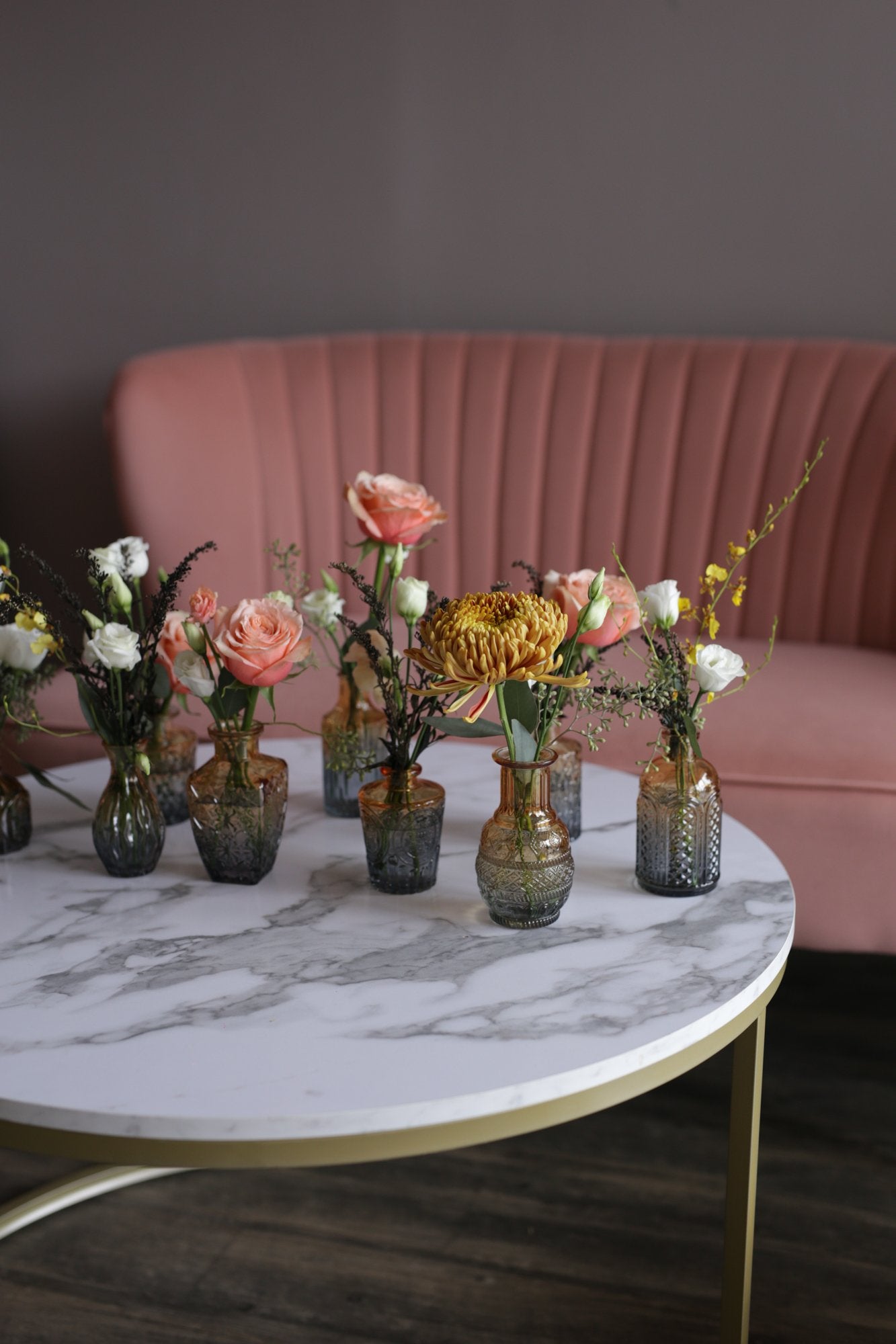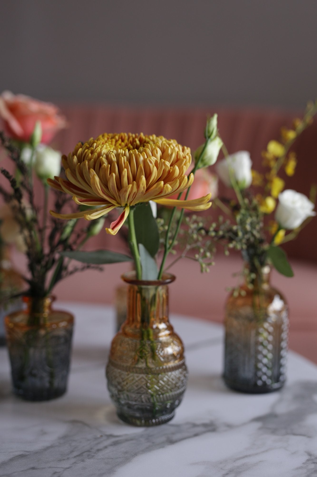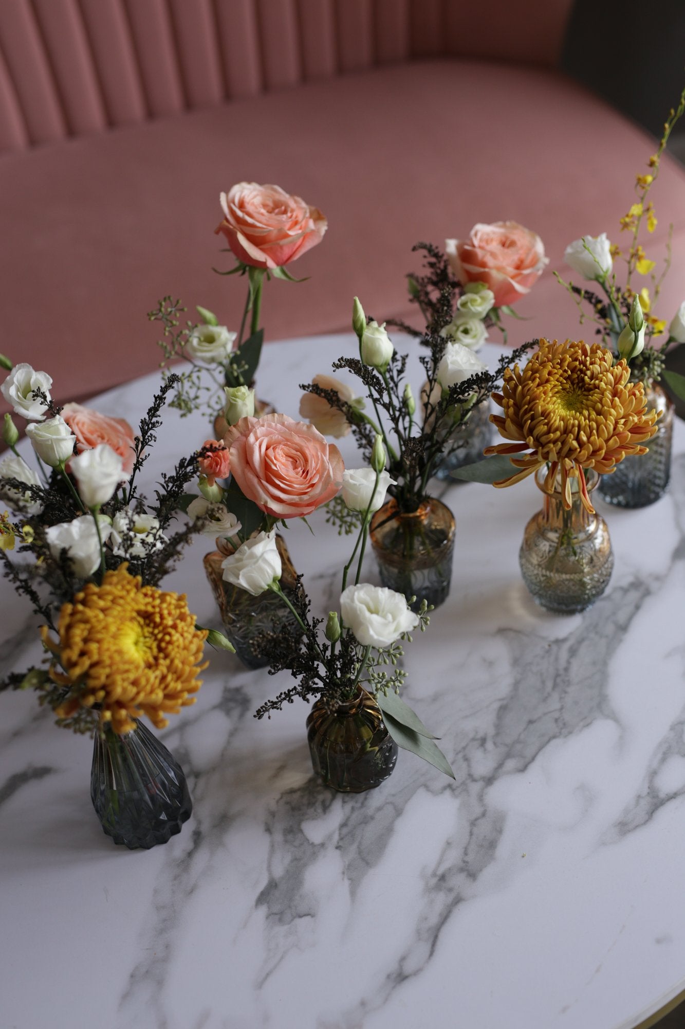 Mix of seasonal flowers in 6 or 12 bud vases in a fall color palette. Color preferences can be applied during checkout.